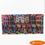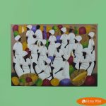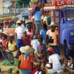 Haiti is home to many beautiful beaches and more mountains than anywhere else in the carribean. The common popular style of painting features very vivid colors, spatial composition, and extremely detailed patterns and characters usually done on a black painted background or black canvas.