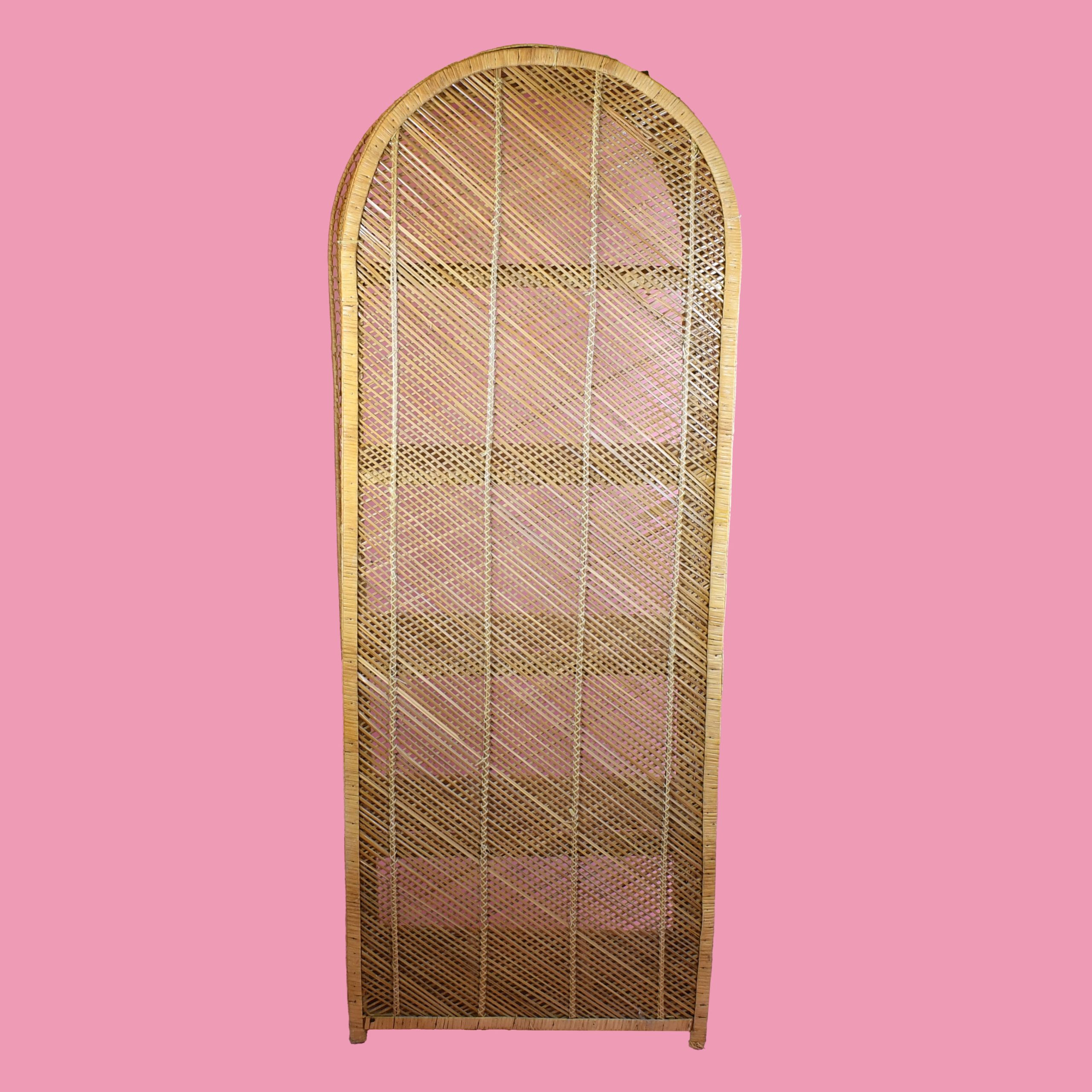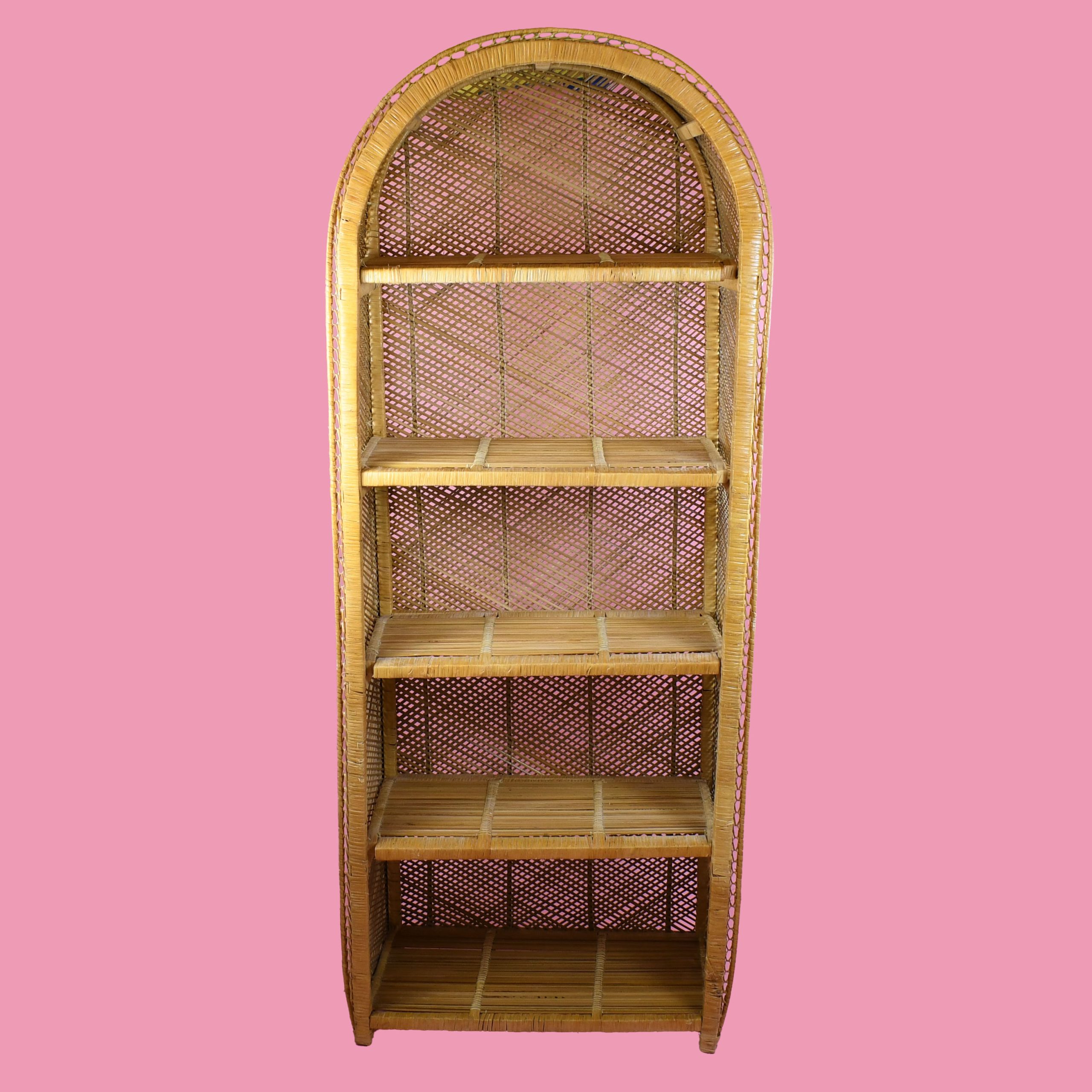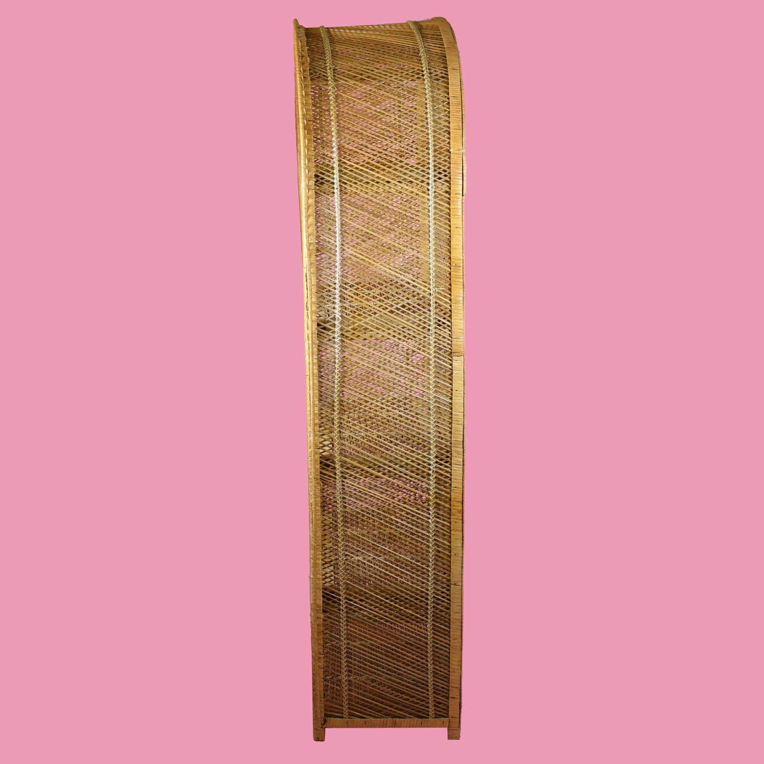 Buri Rattan Oval Etagere in nice as found vintage condition. There are minor scuffs, scrapes and wear to the original finish. (see photos)