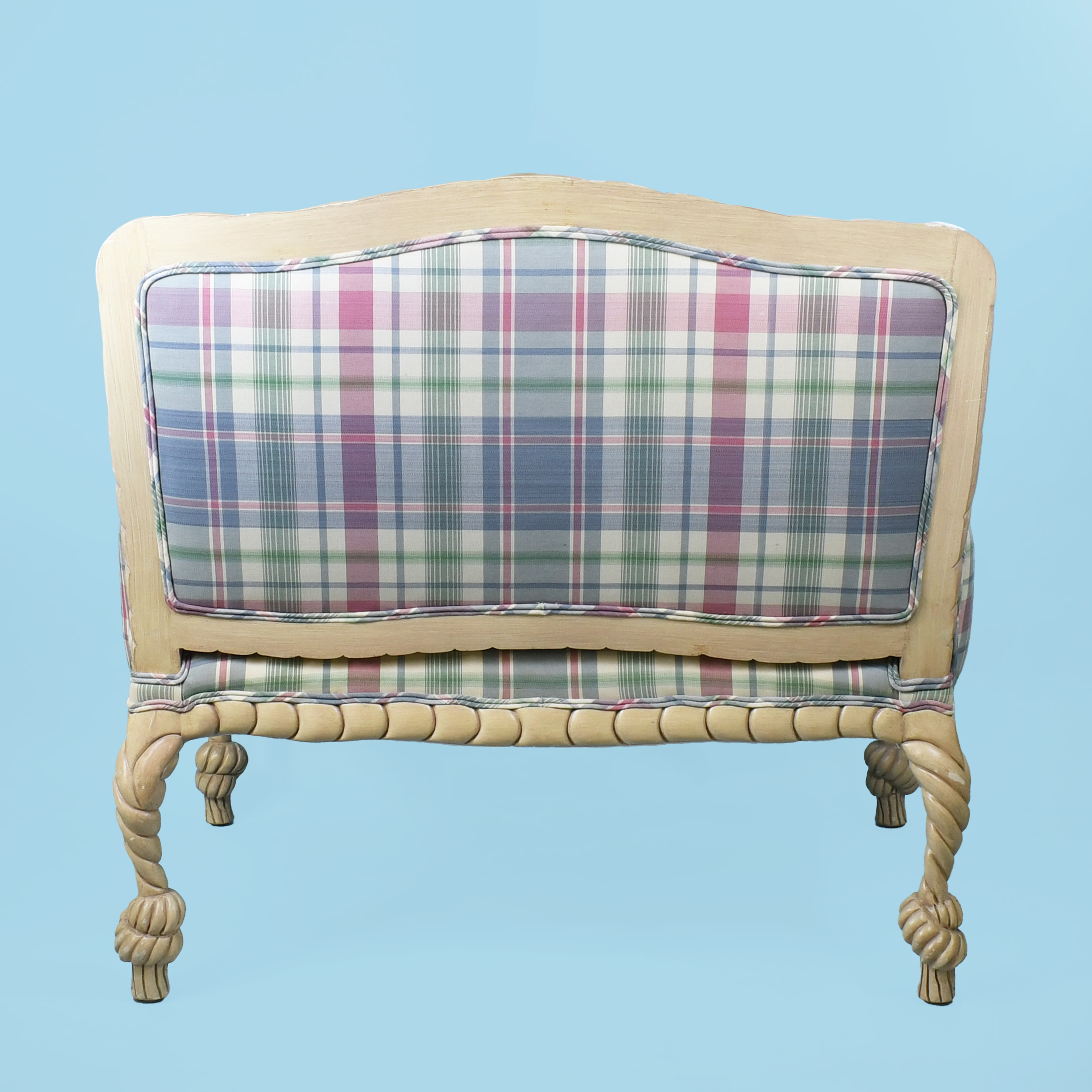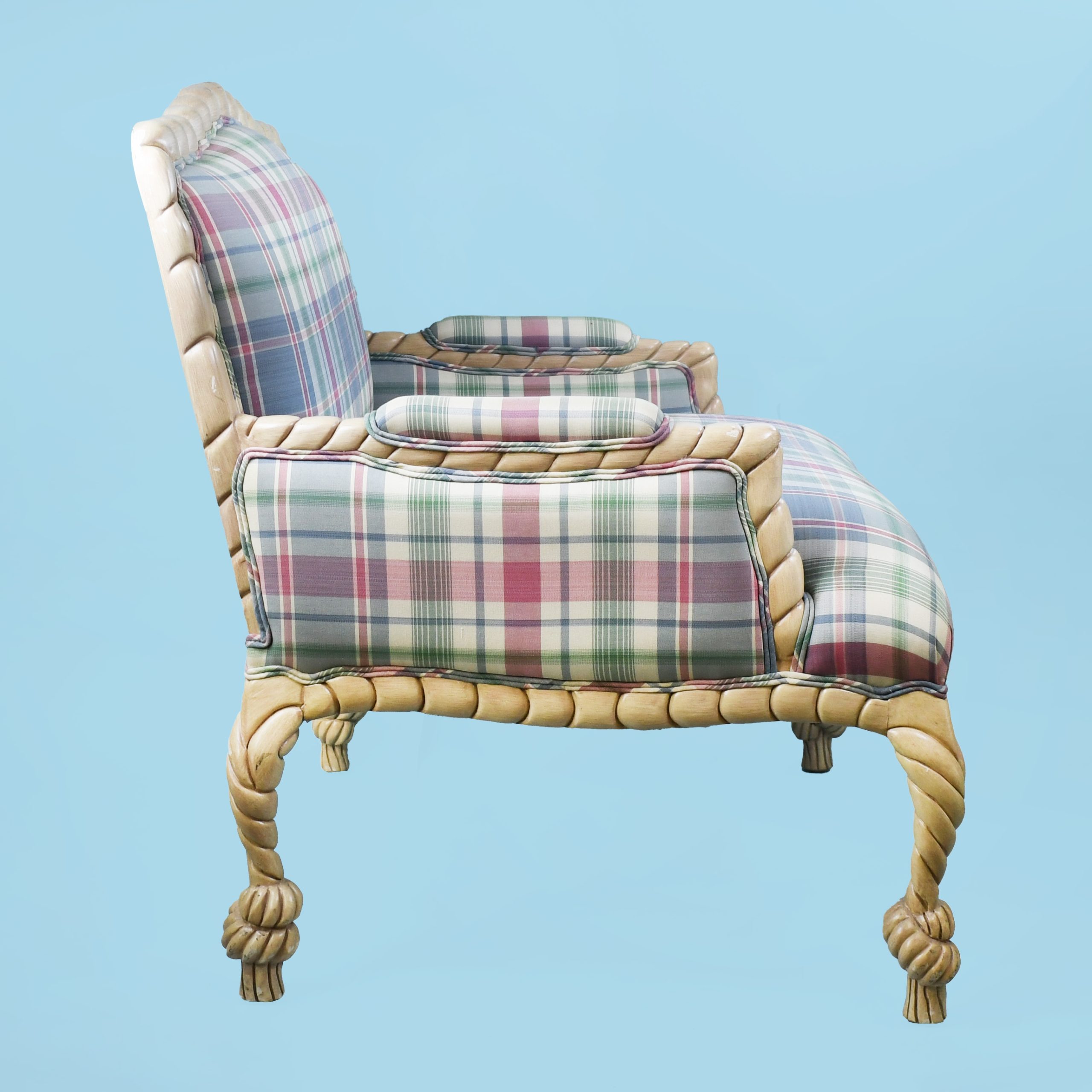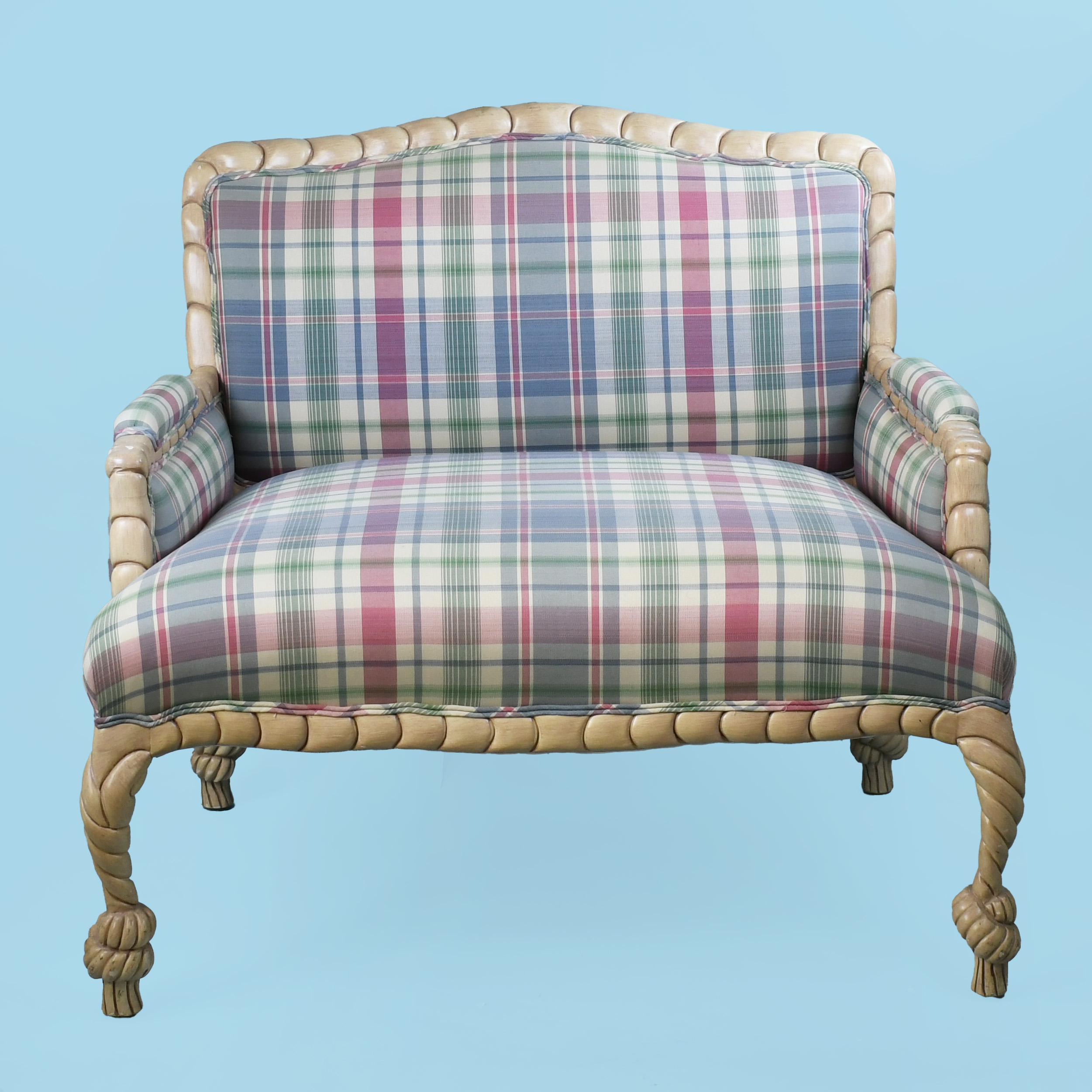 Carve Rope and Tassel Settee and Ottoman in nice as found VINTAGE condition. There are minor scuffs, scrapes and wear to the as found finish. As found Upholstery . (see photos)