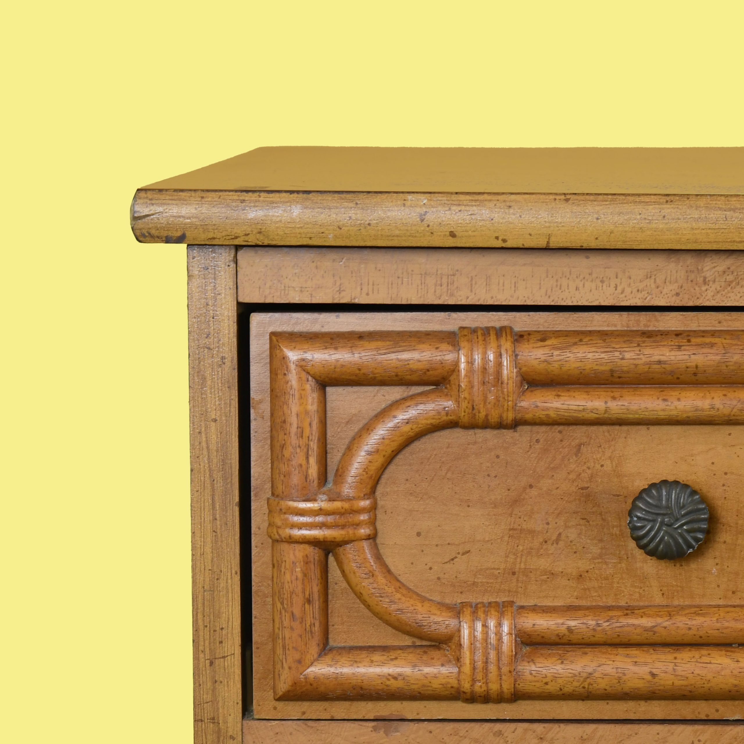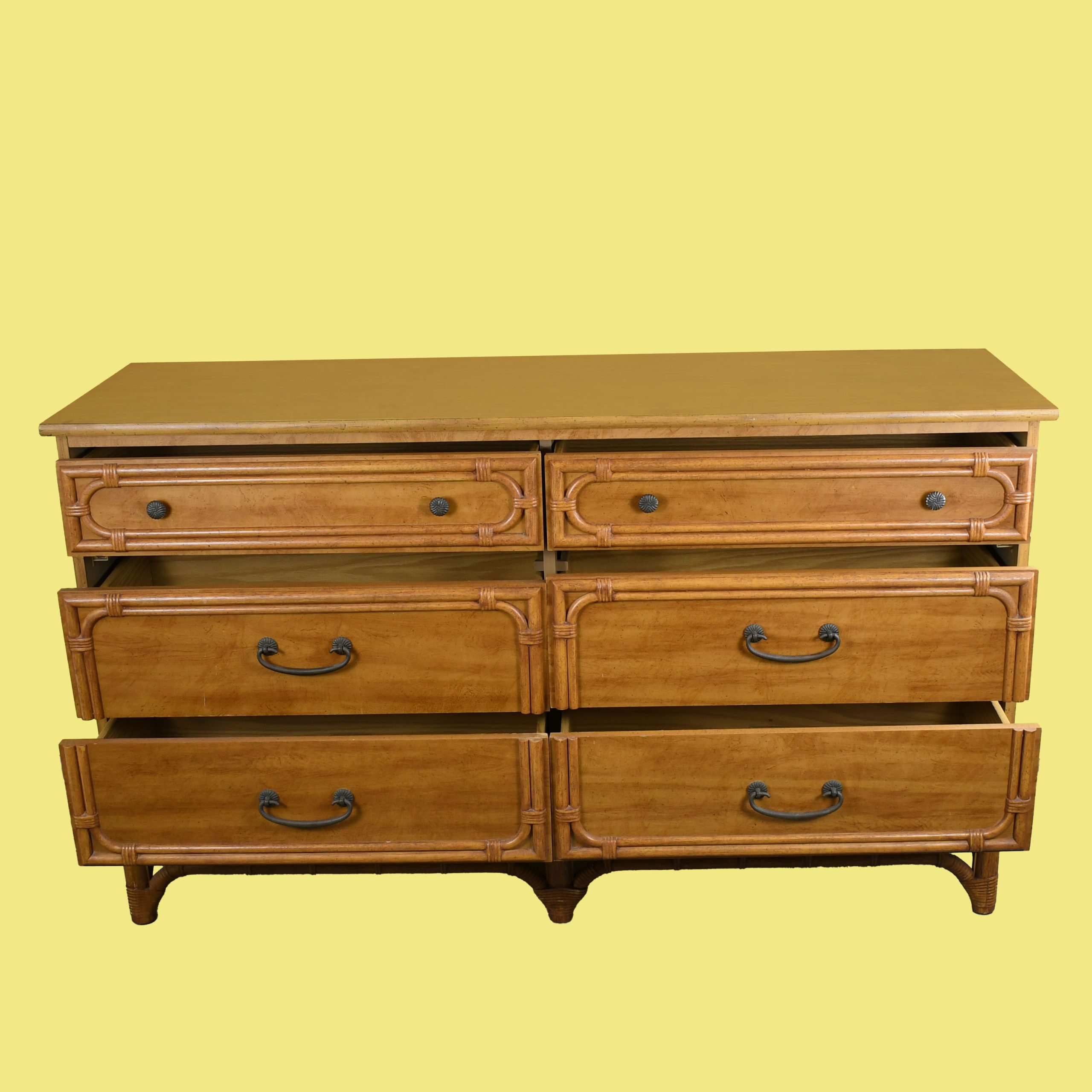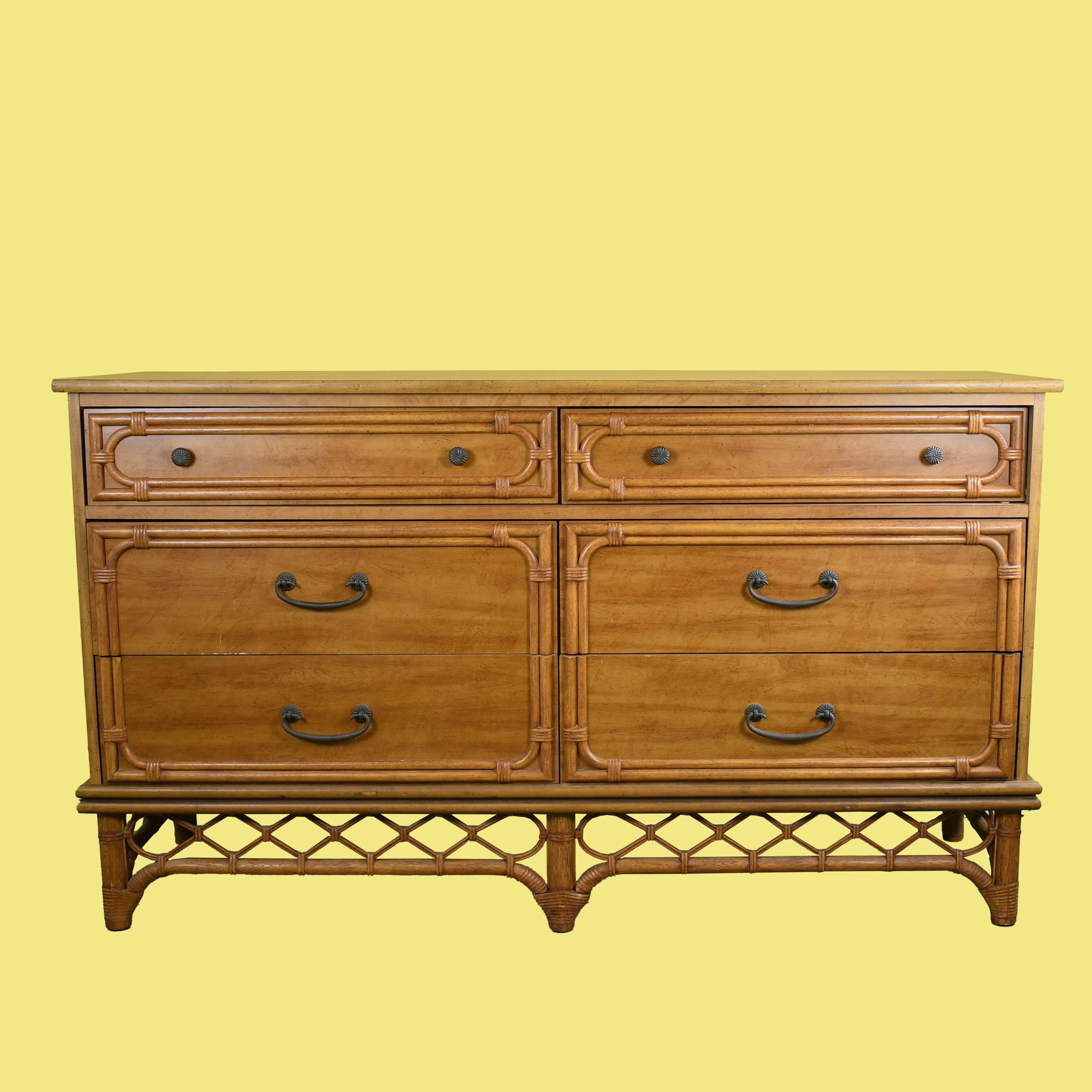 Faux Bamboo Double Dresser in nice as found vintage condition. There are minor scuffs, scrapes and wear to the original finish. (see photos)