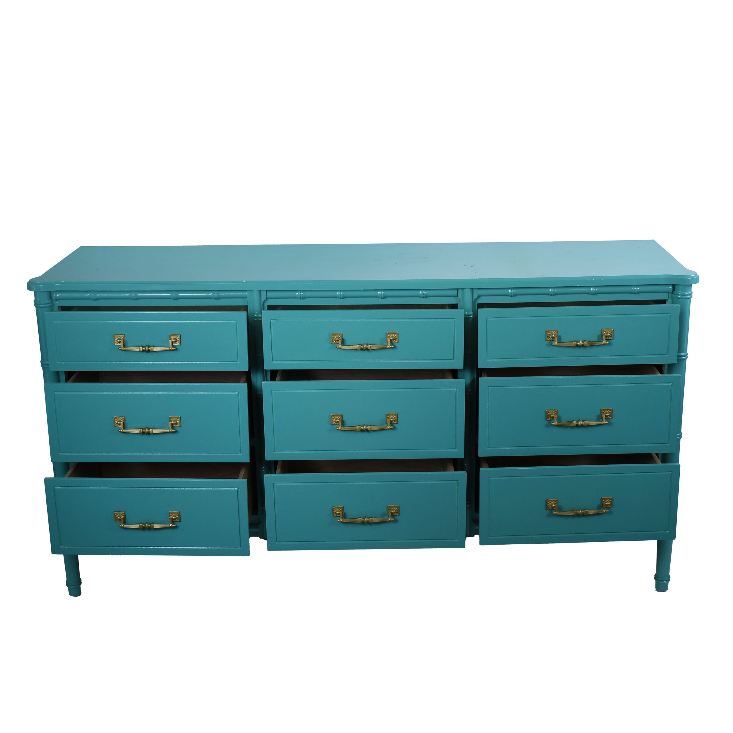 Faux Bamboo Teal Dresser in nice as found VINTAGE condition. There are minor scuffs, scrapes and wear to the as found finish. (see photos)