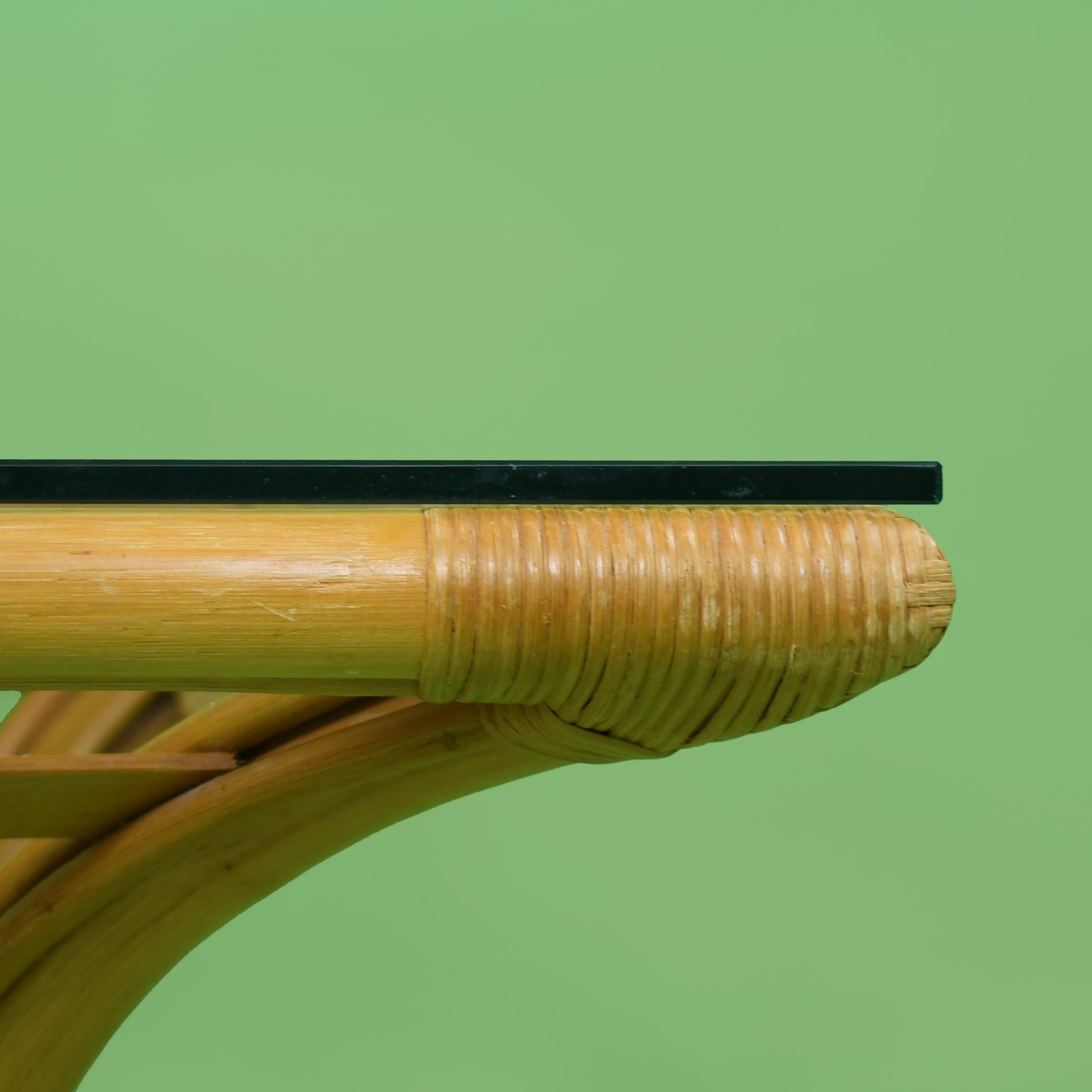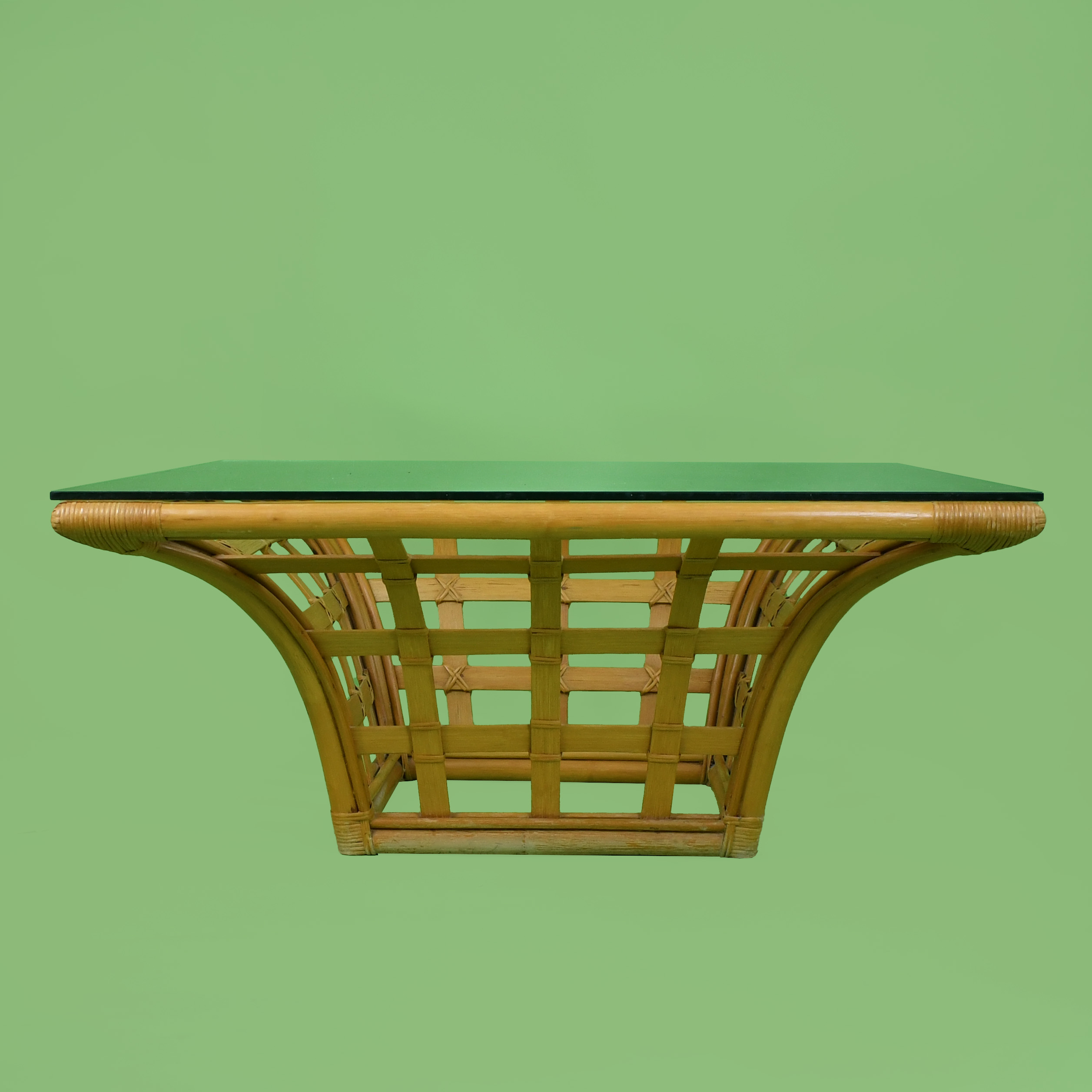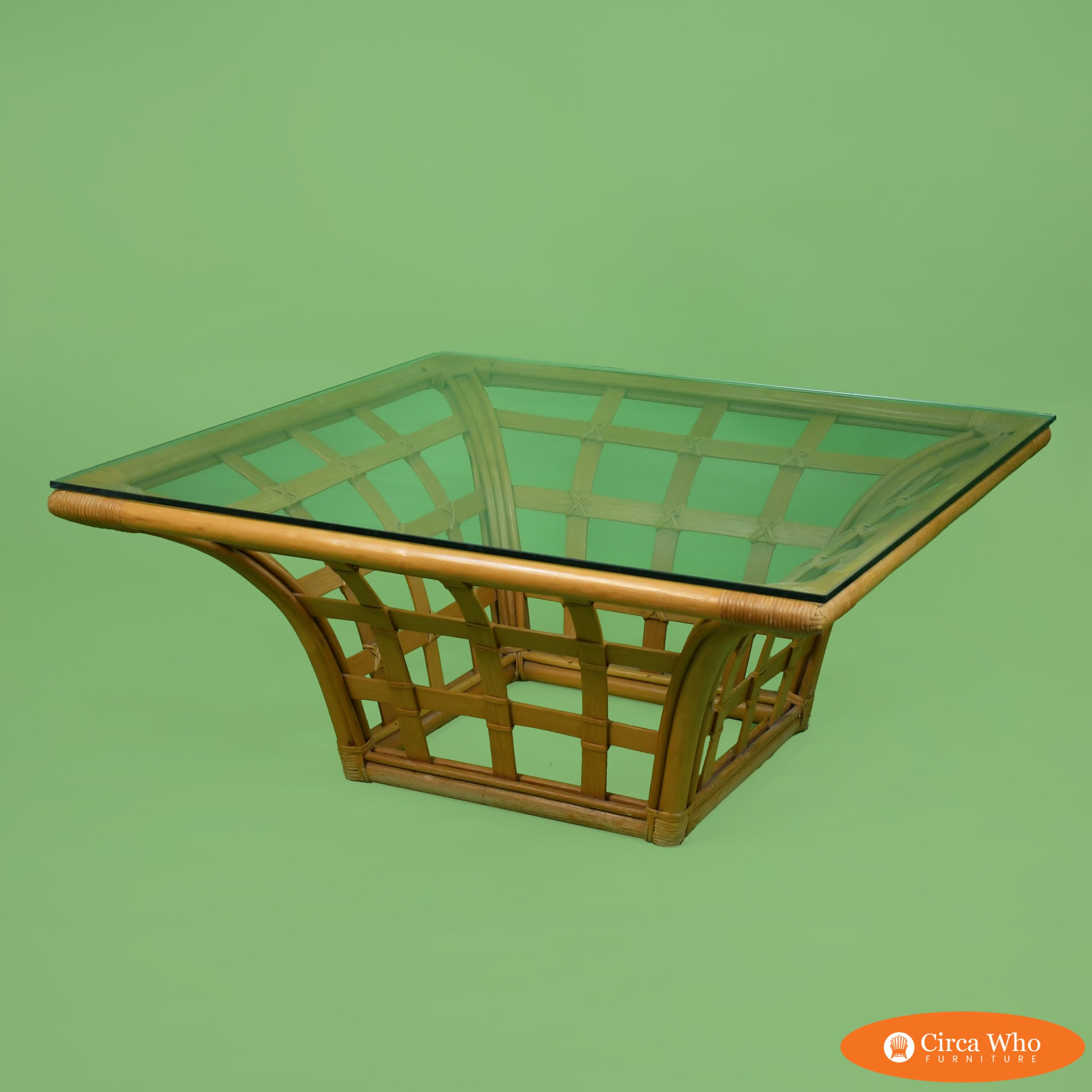 Fretwork Rattan Glass Top Coffee Table in nice as found condition. There are minor scuffs, scrapes and wear to the original finish. Wear to glass top from use. (see photos)