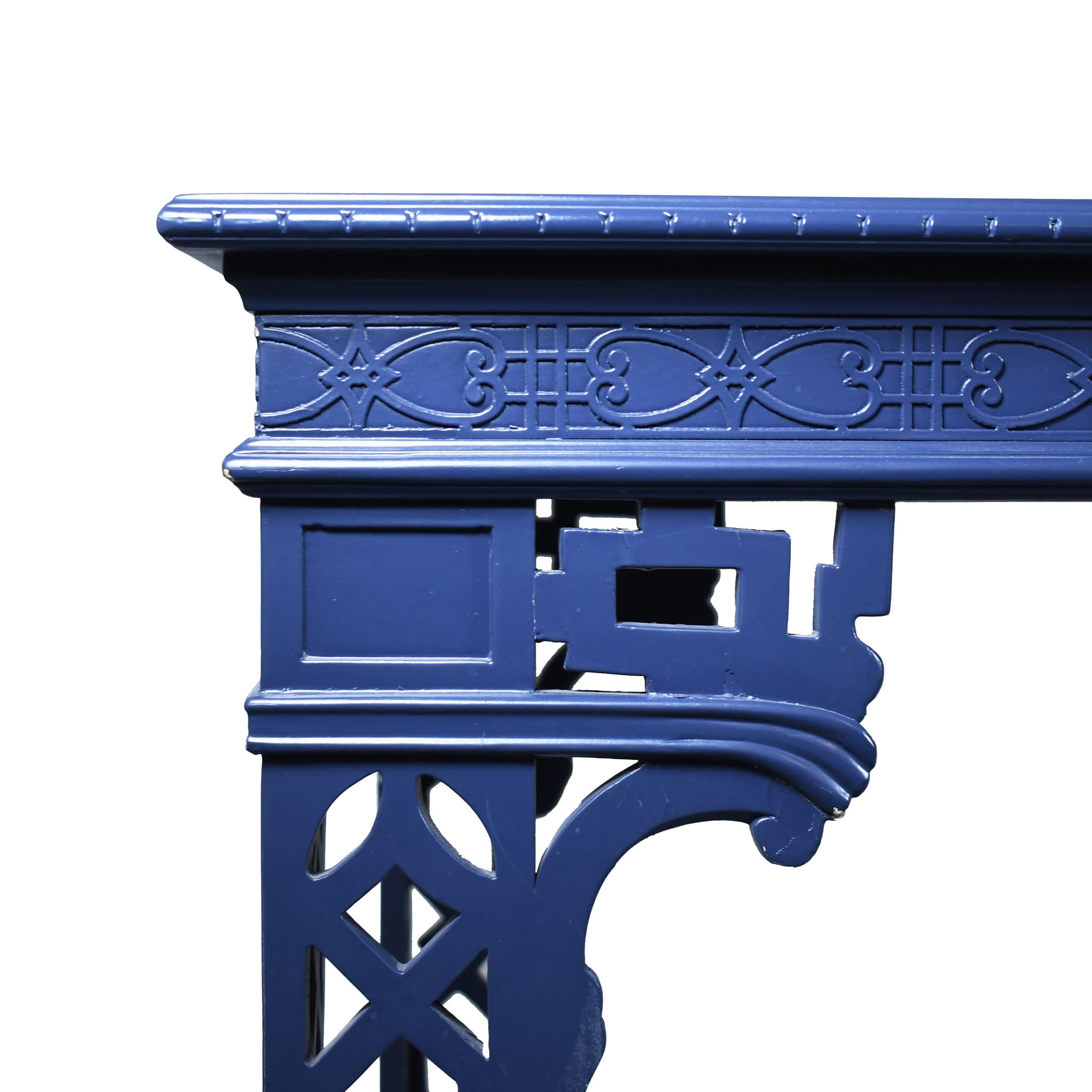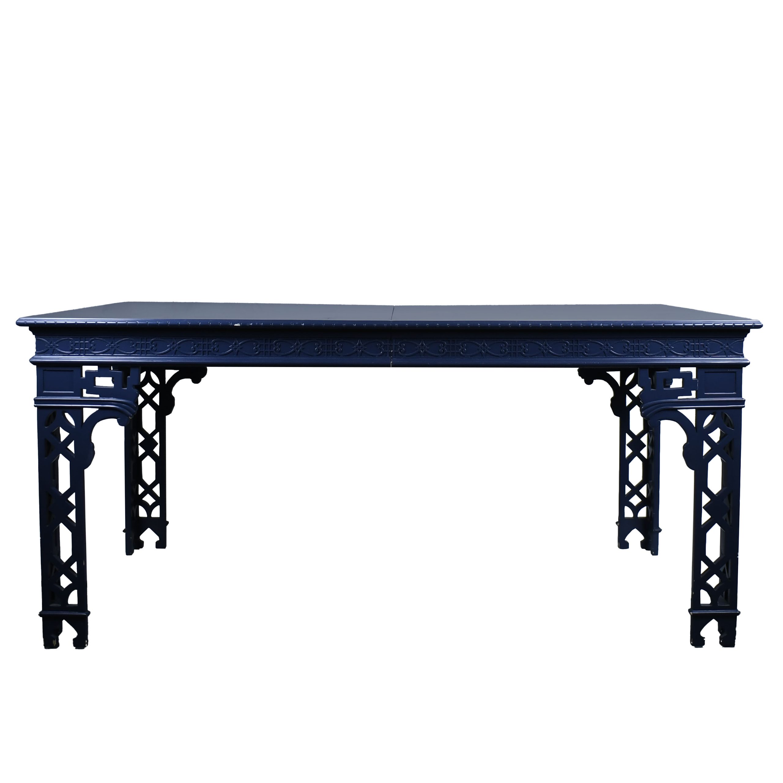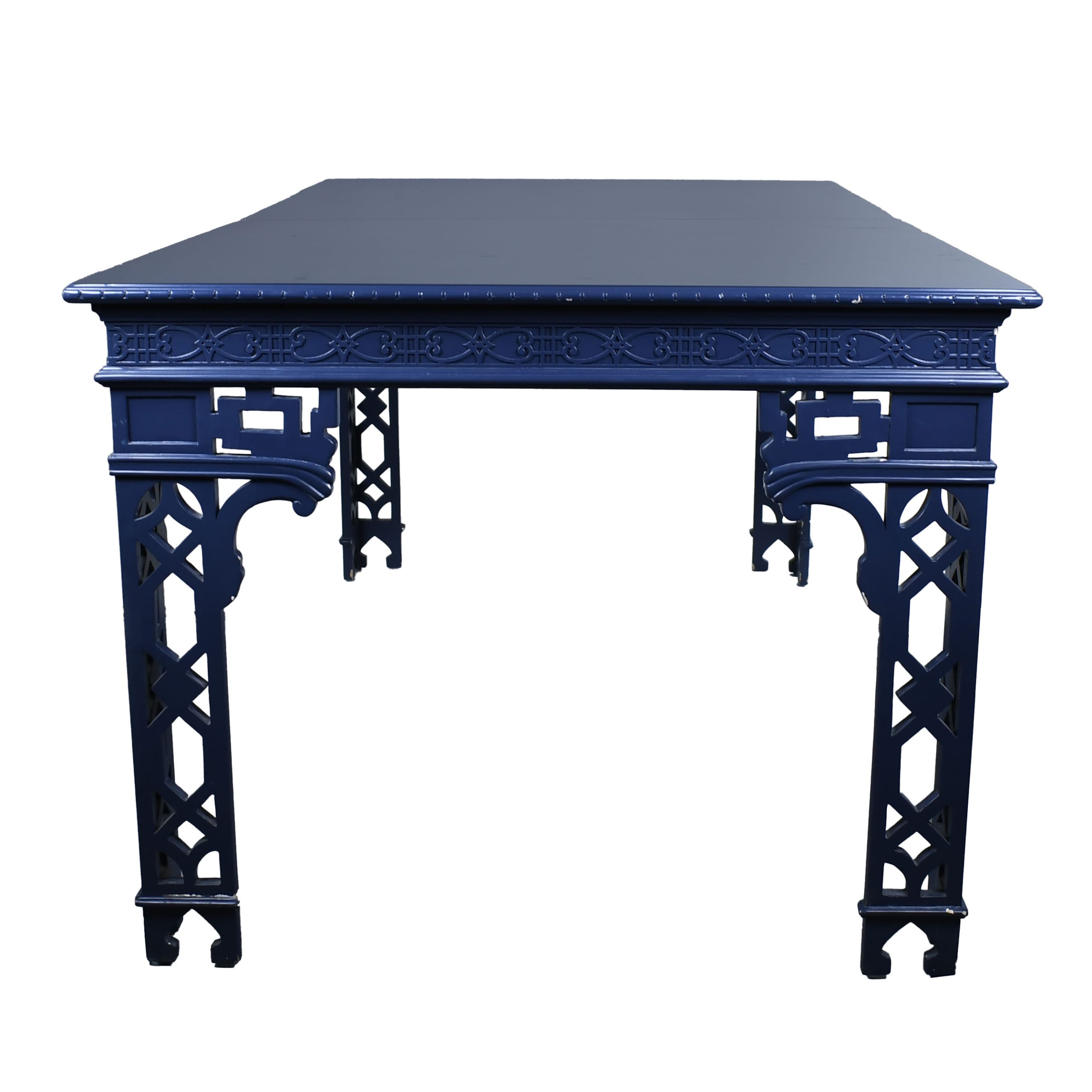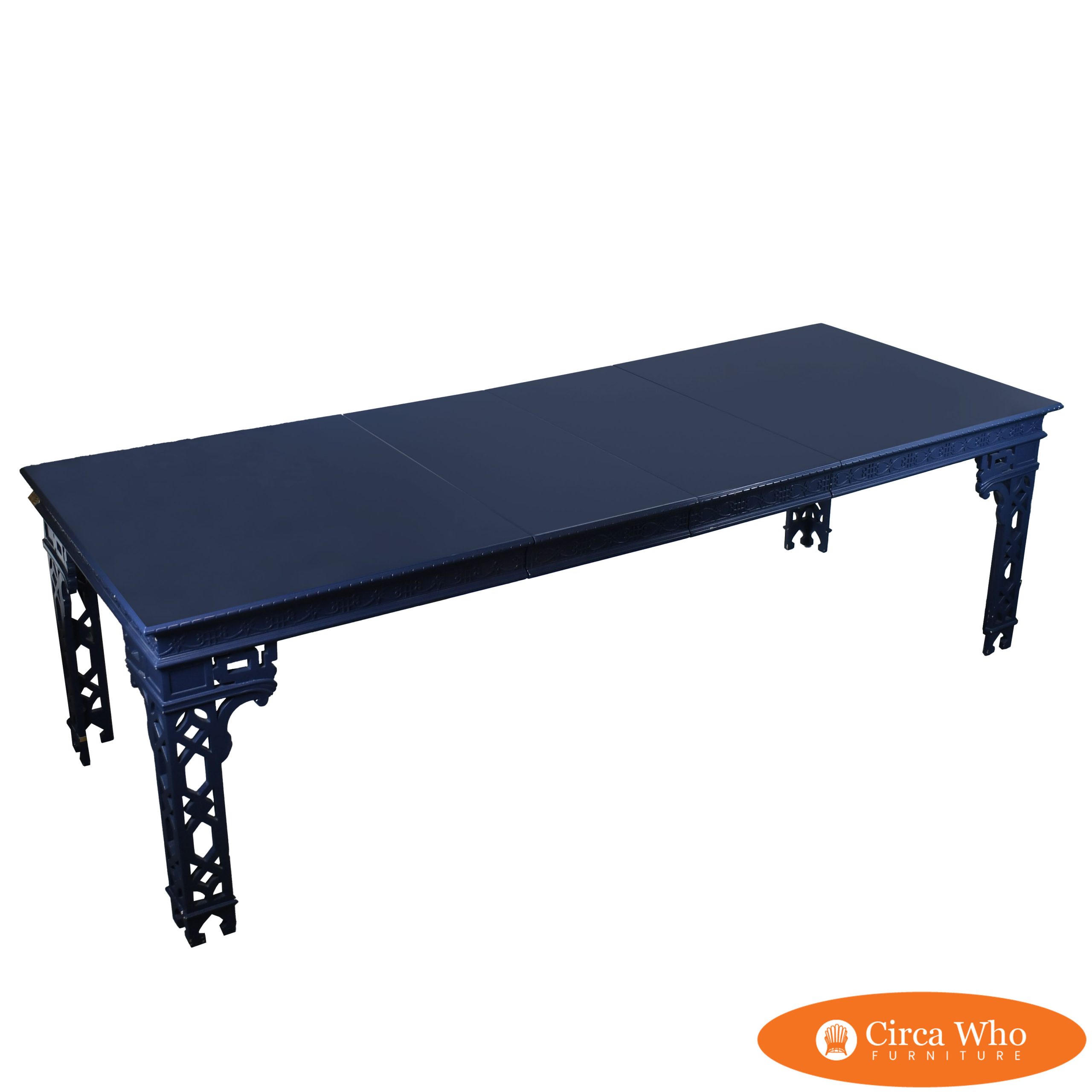 Hollywood Regency Navy Blue Extendable Dining Table in good as found condition. There are minor scuffs, scrapes and wear to the as found Lacquer finish. Comes With to Leaves that Match the Color . (see photos)