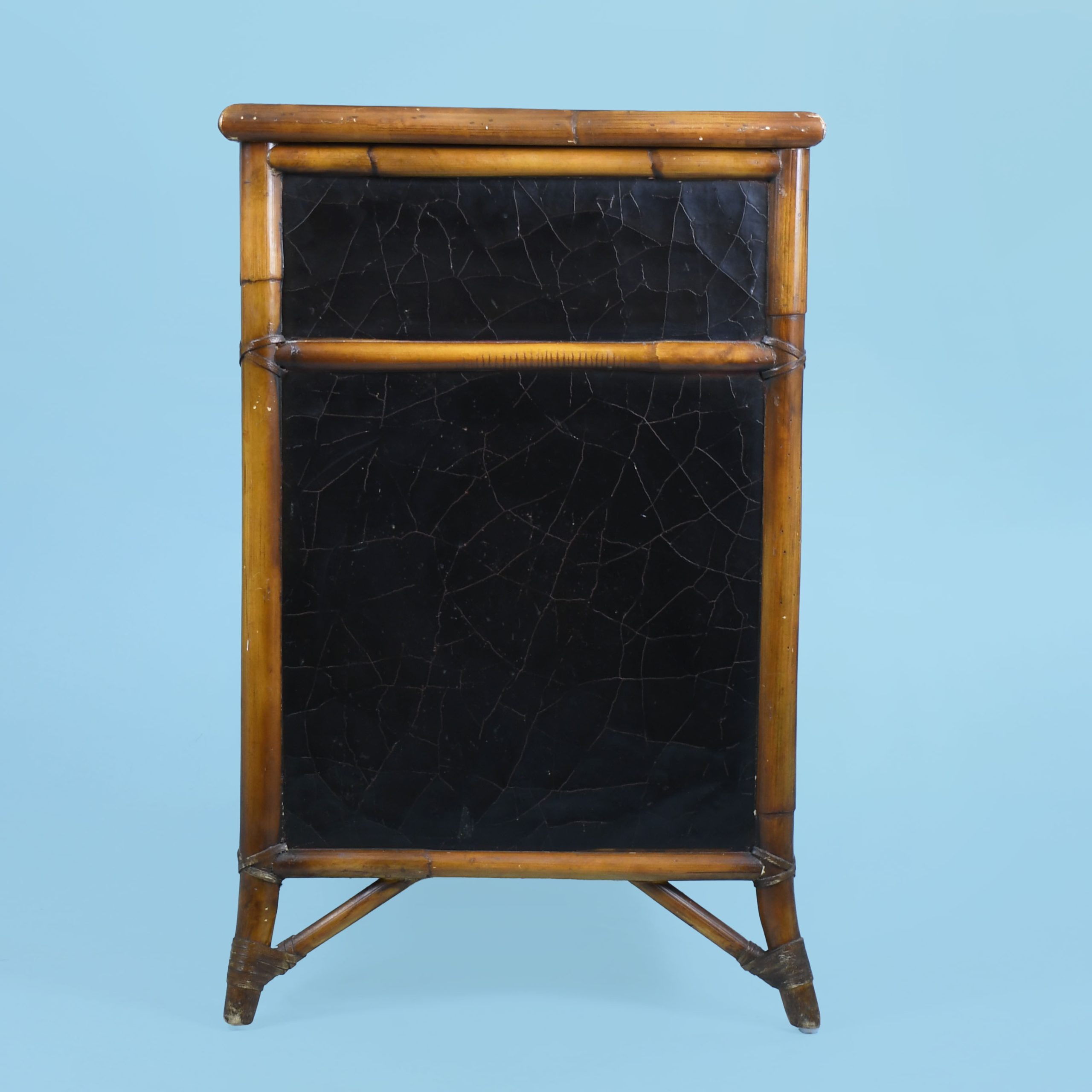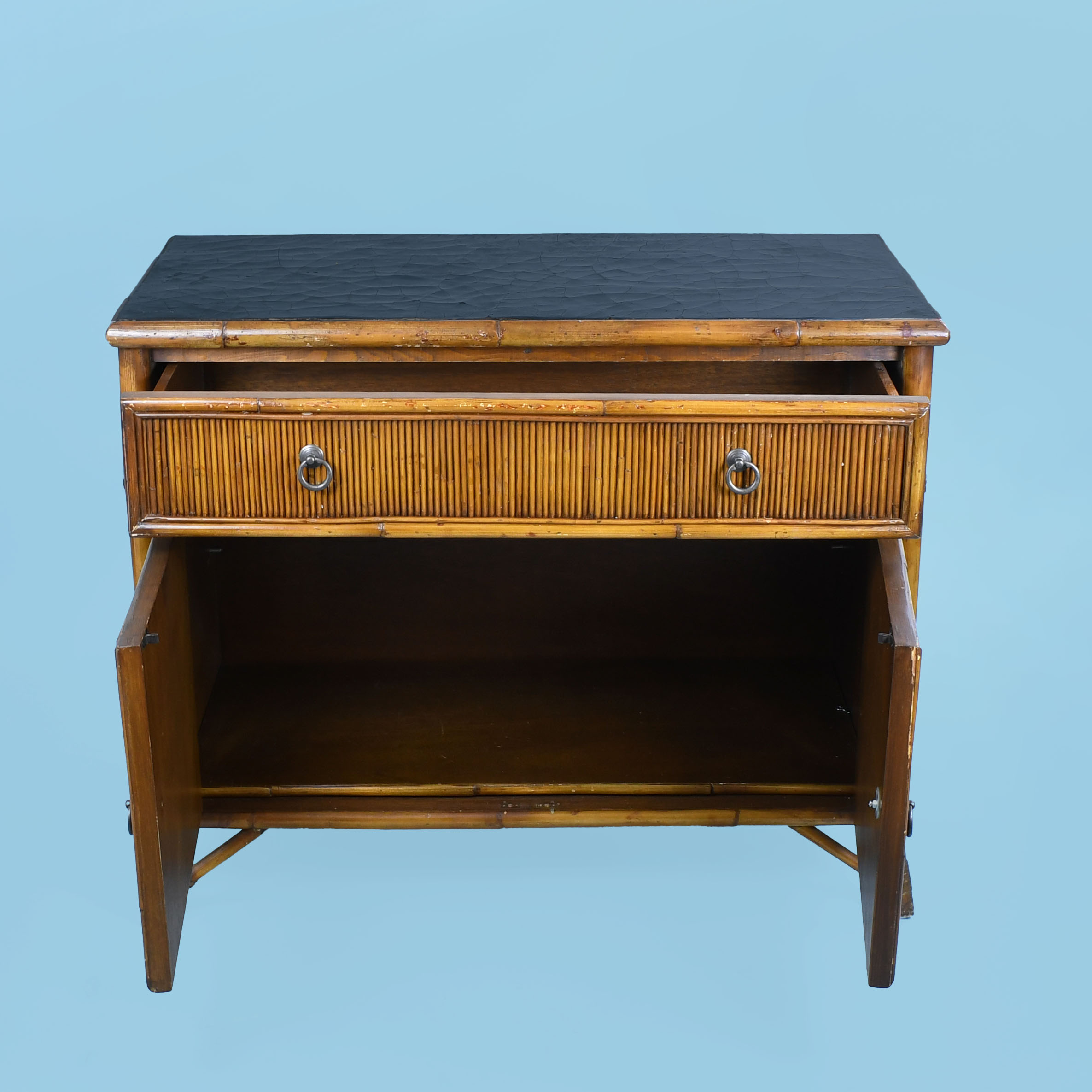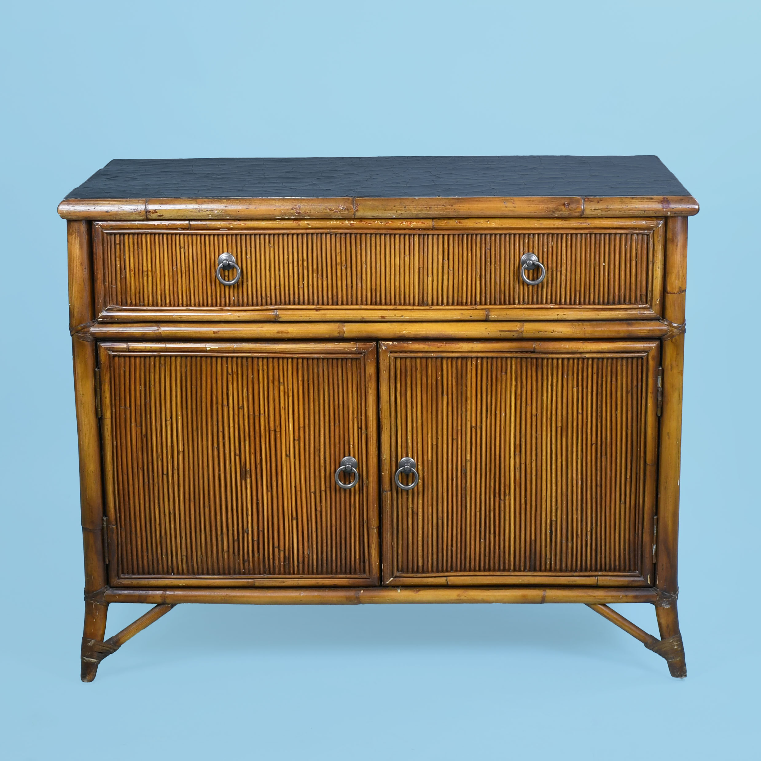 Leather and Split Bamboo Commode by Milling Road for Baker in nice as found VINTAGE condition. There are minor scuffs, scrapes and wear to the as found finish. (see photos)