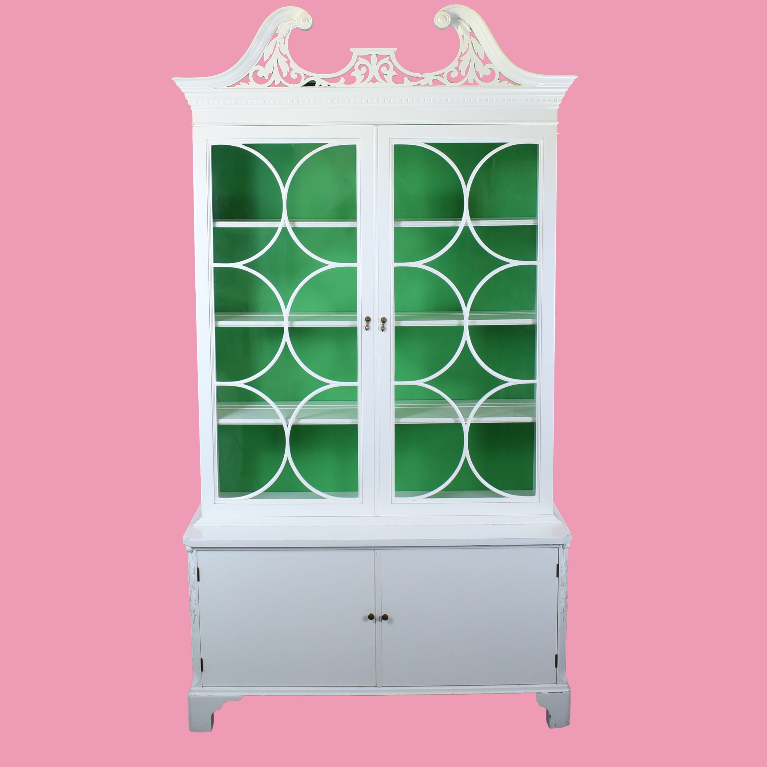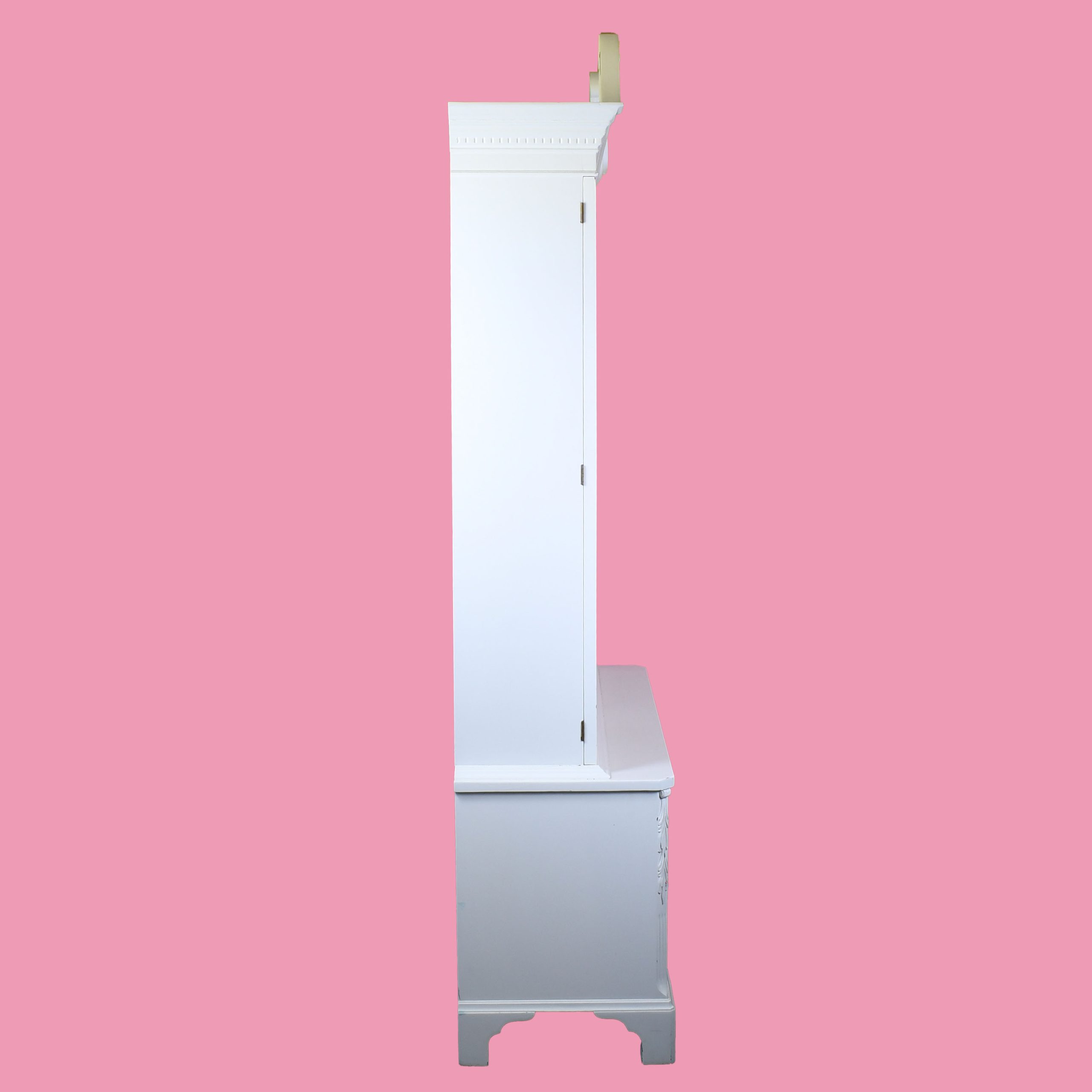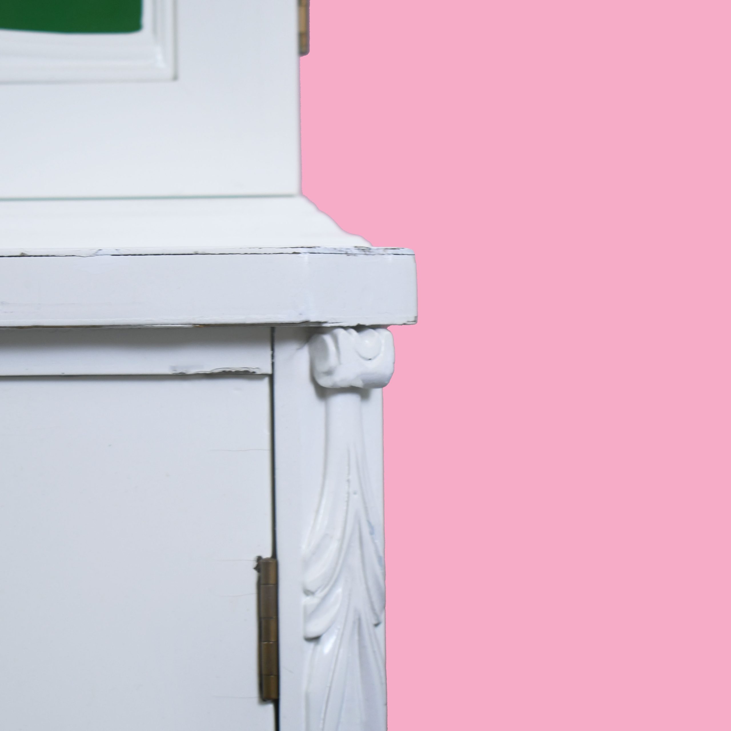 MCM Ornamental White Cabinet in nice as found condition. There are minor scuffs, scrapes and wear to the as found finish. Glass top has wear from use. (see photos)