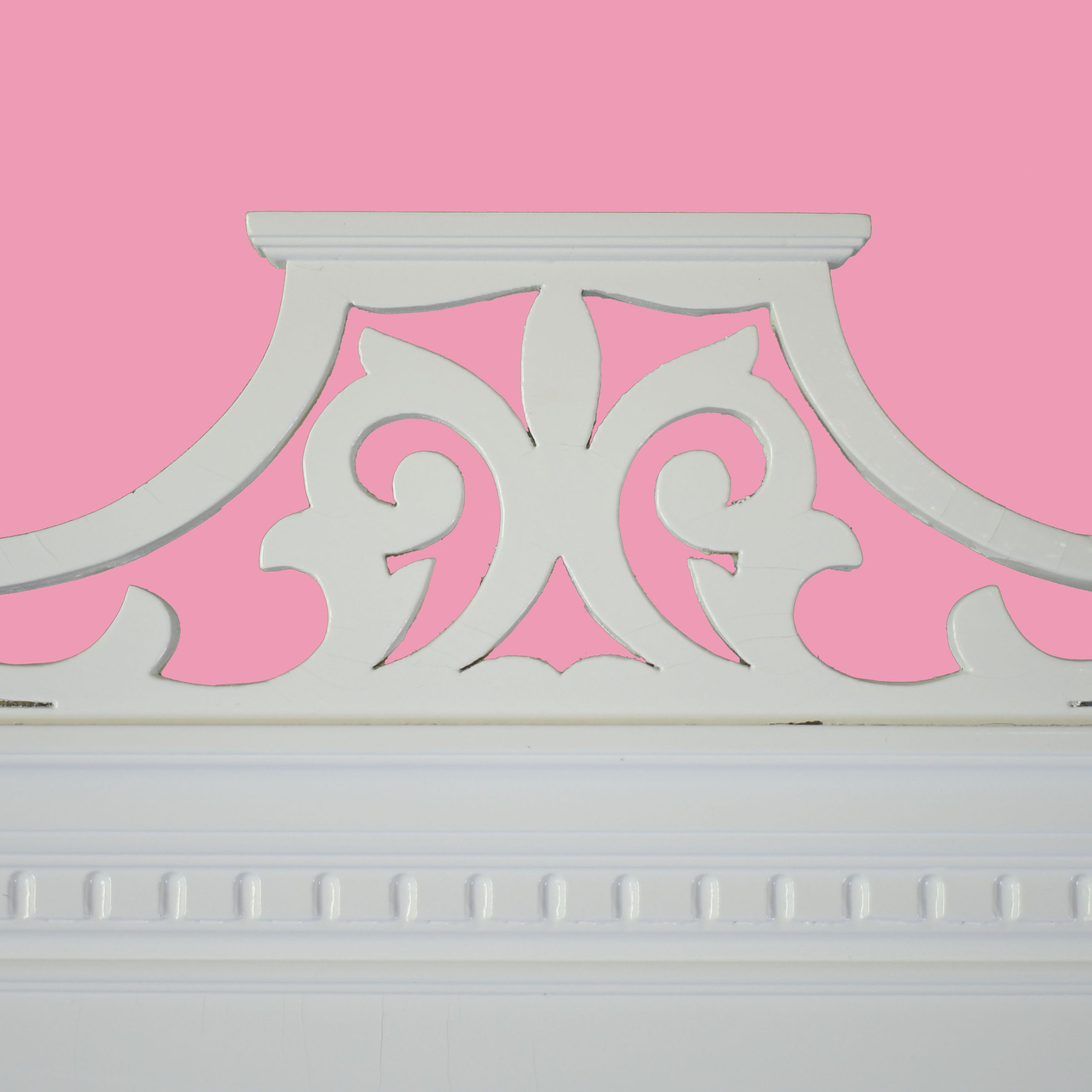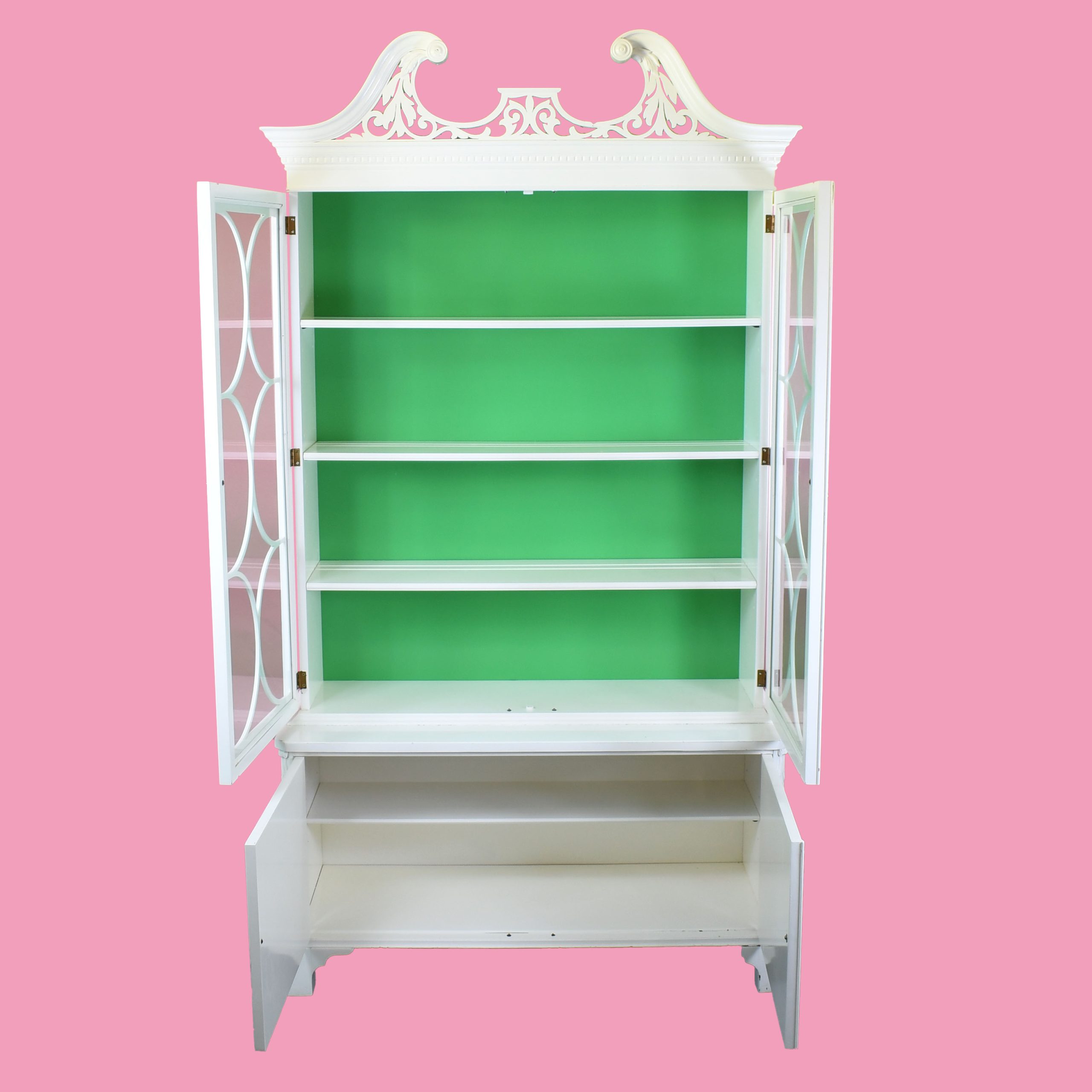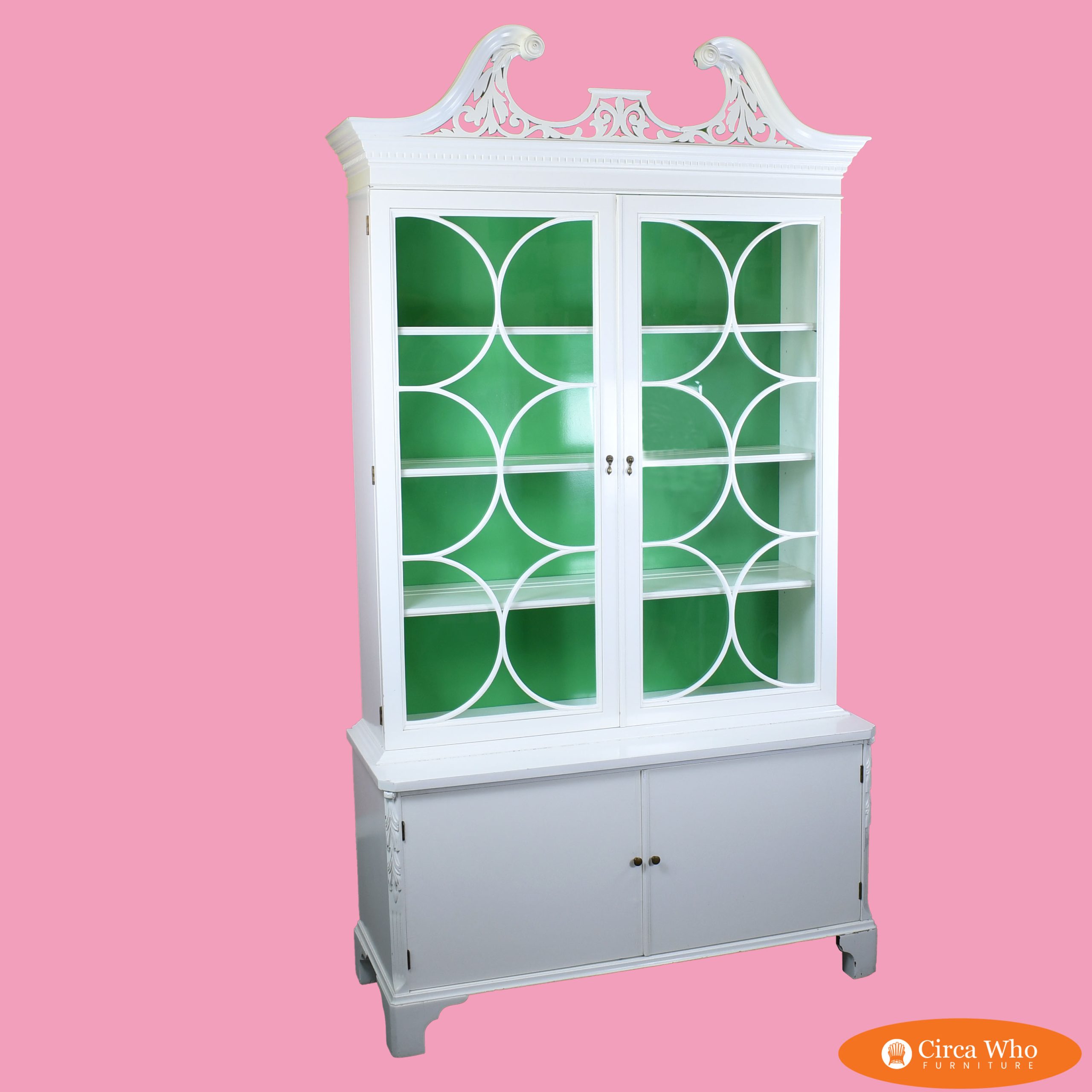 MCM Ornamental White Cabinet in nice as found condition. There are minor scuffs, scrapes and wear to the as found finish. Glass top has wear from use. (see photos)