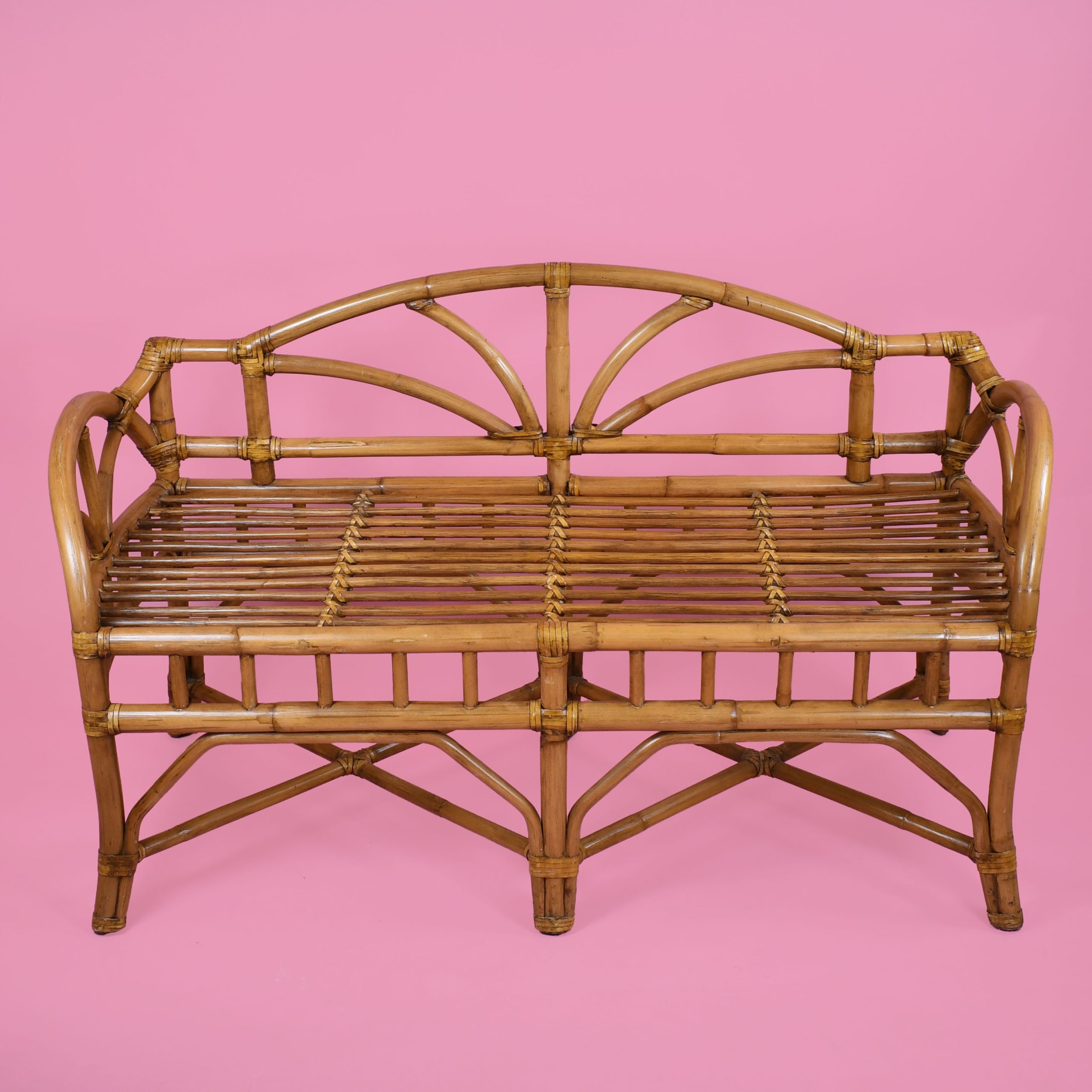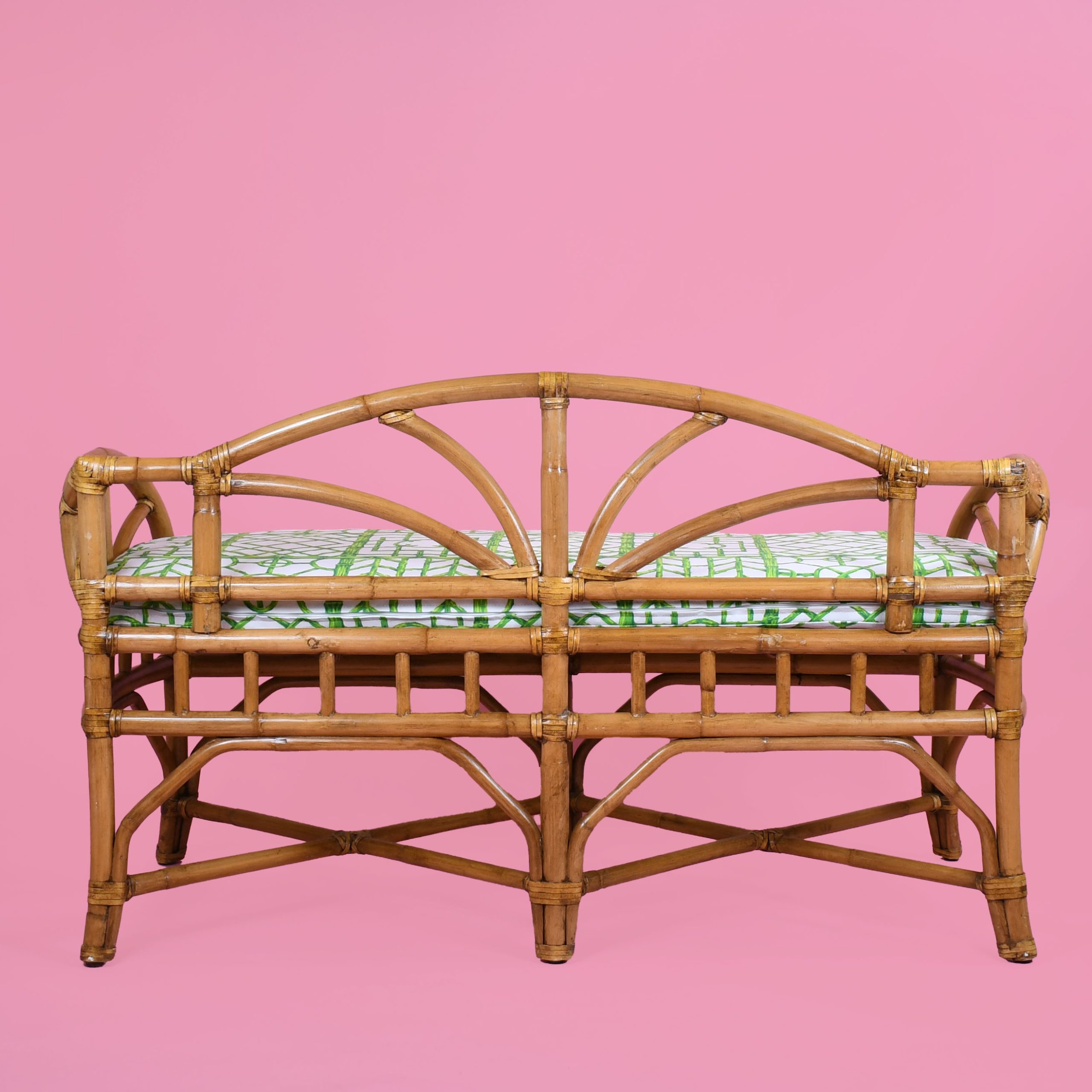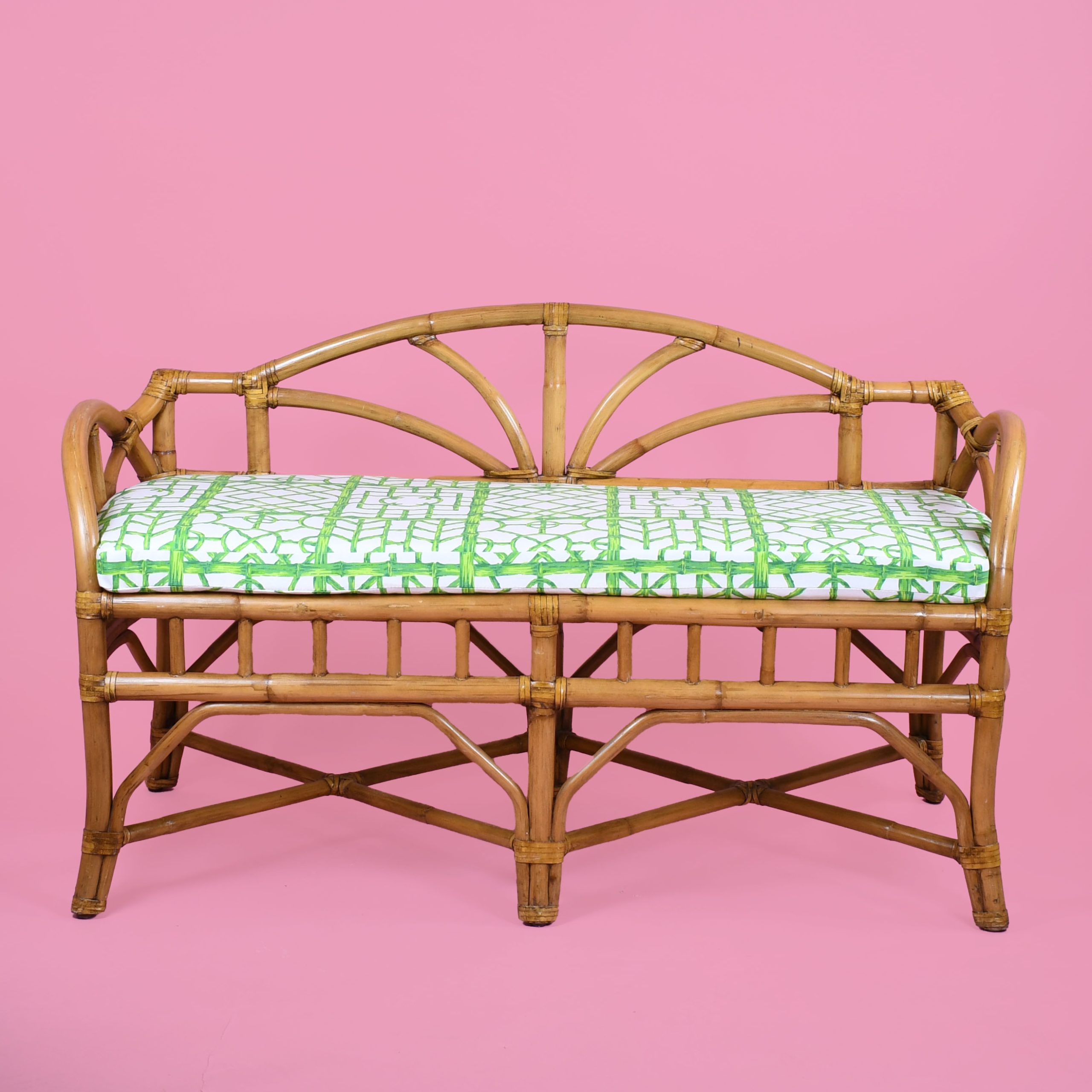 Newly Upholstered Fretwork Rattan Bench in nice as found VINTAGE condition. There are minor scuffs, scrapes and wear to the as found Finish.Newly Upholstery . (see photos)