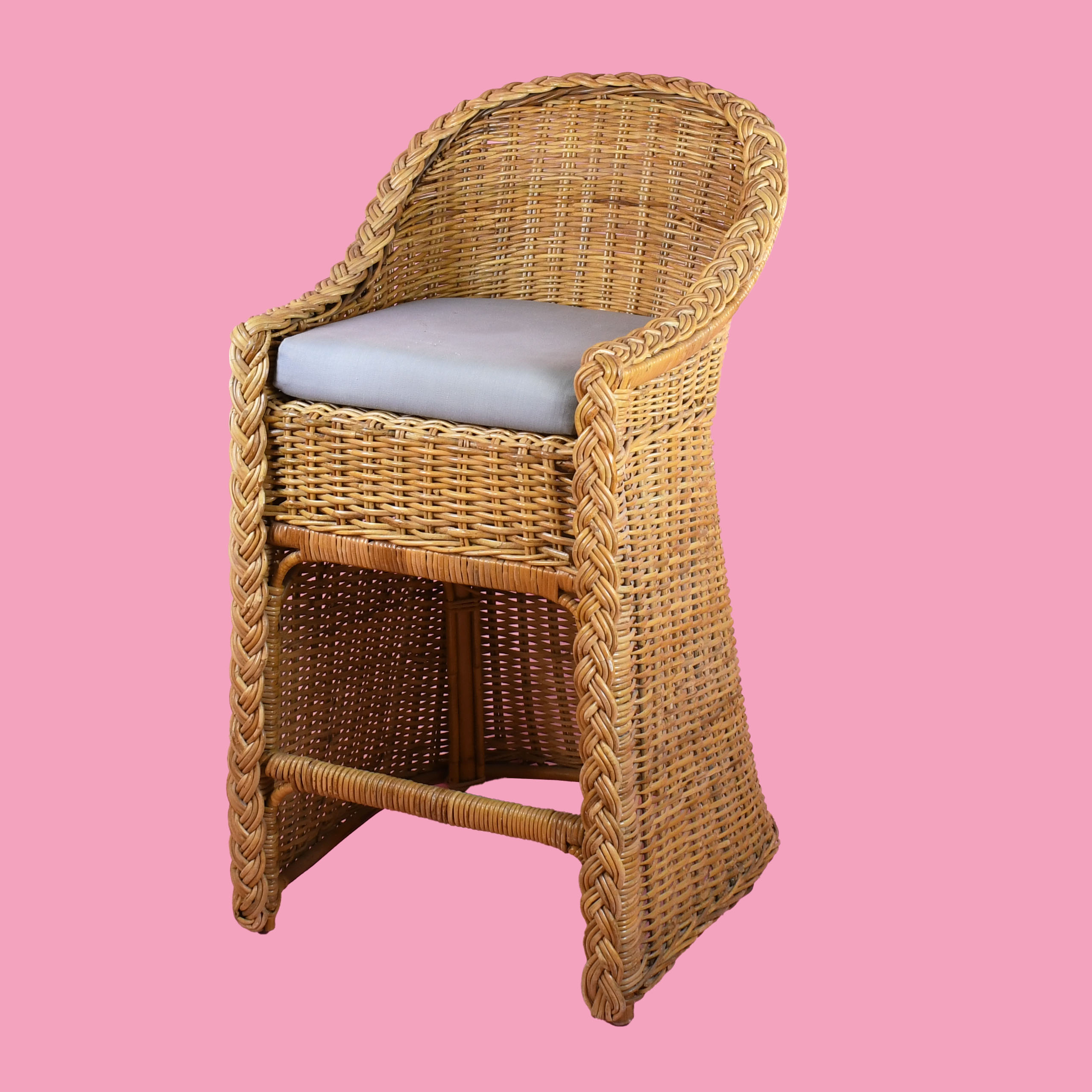 Pair of Braided Rattan Counter Stool in nice as found vintage condition. There are minor scuffs, scrapes and wear to the original finish. As found upholstery. (see photos)