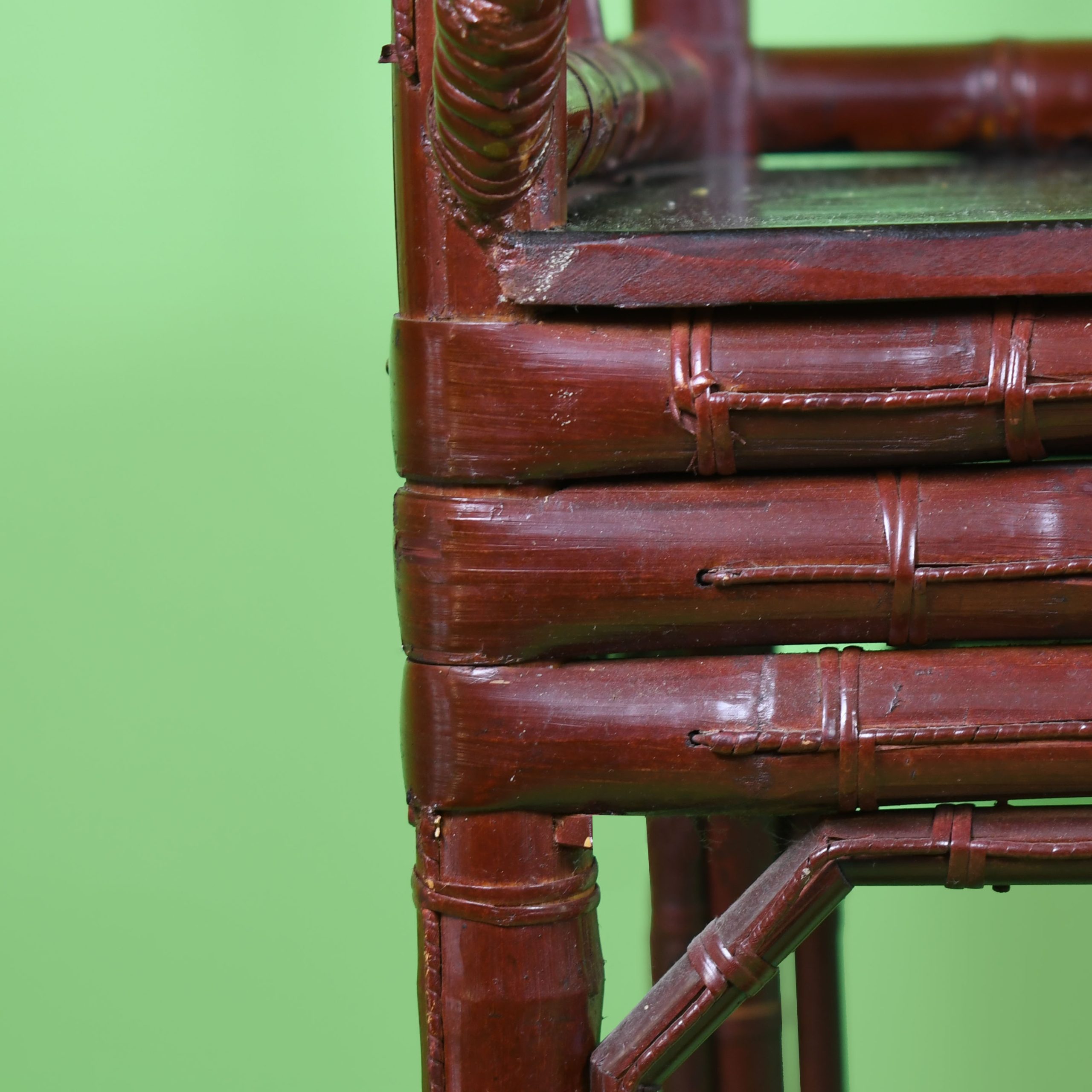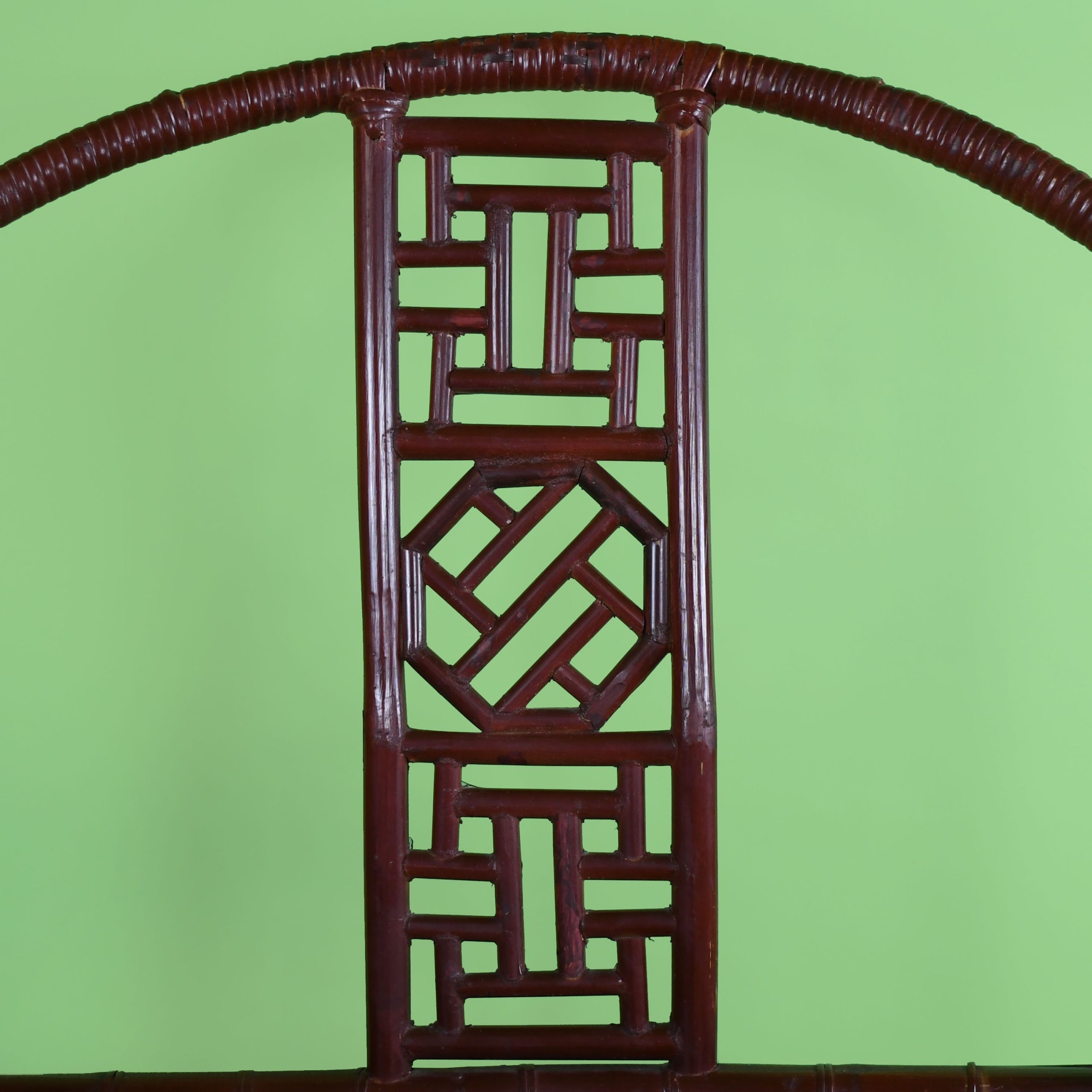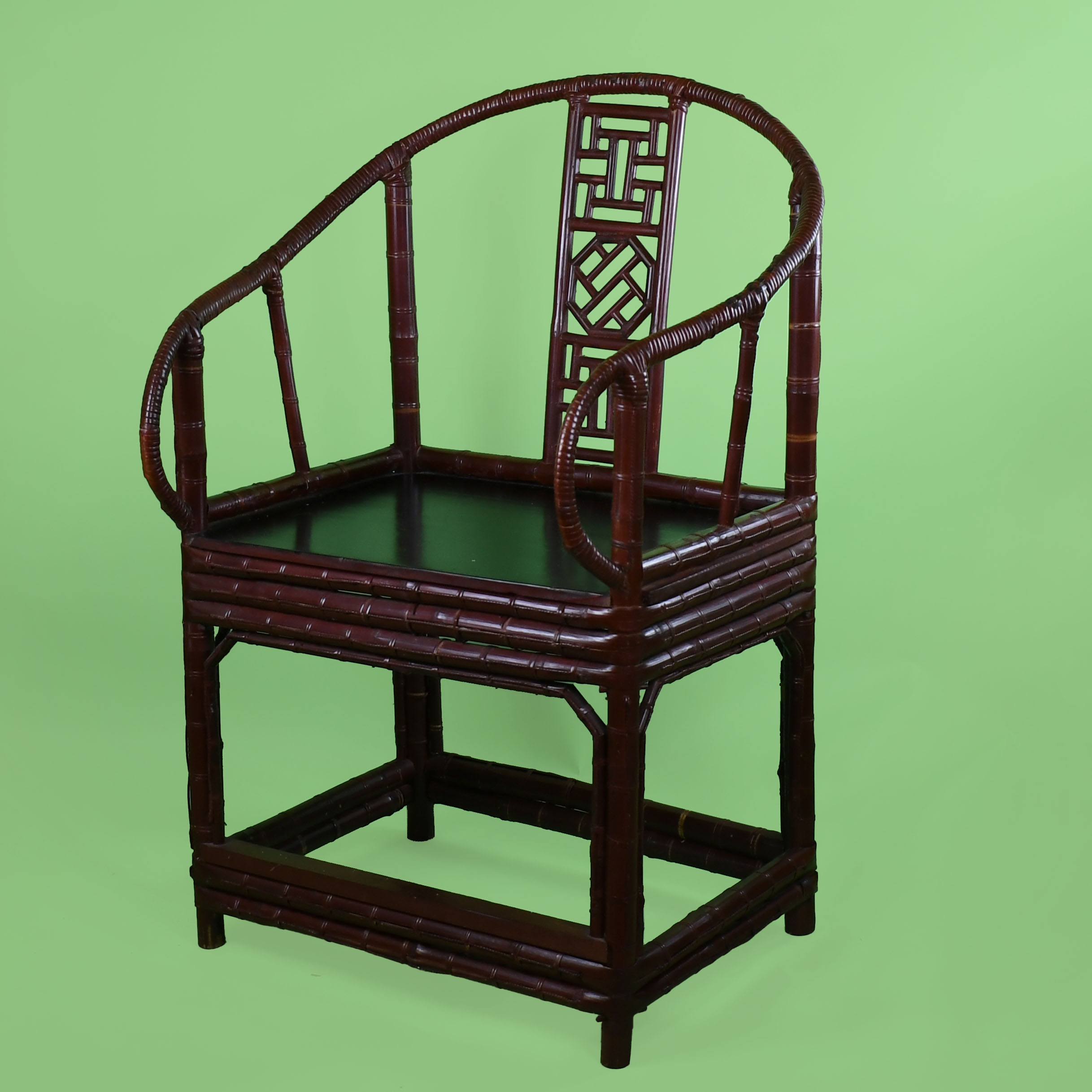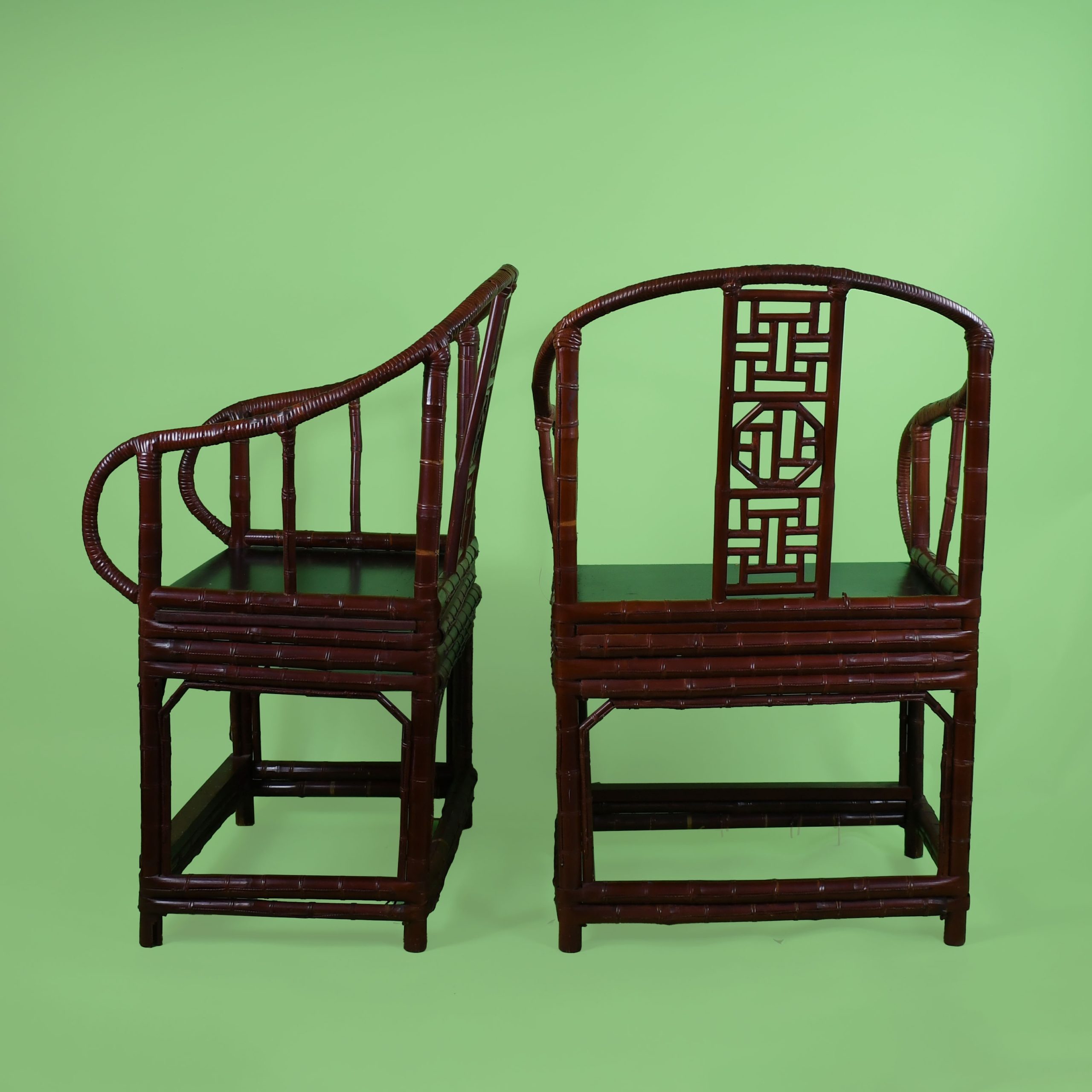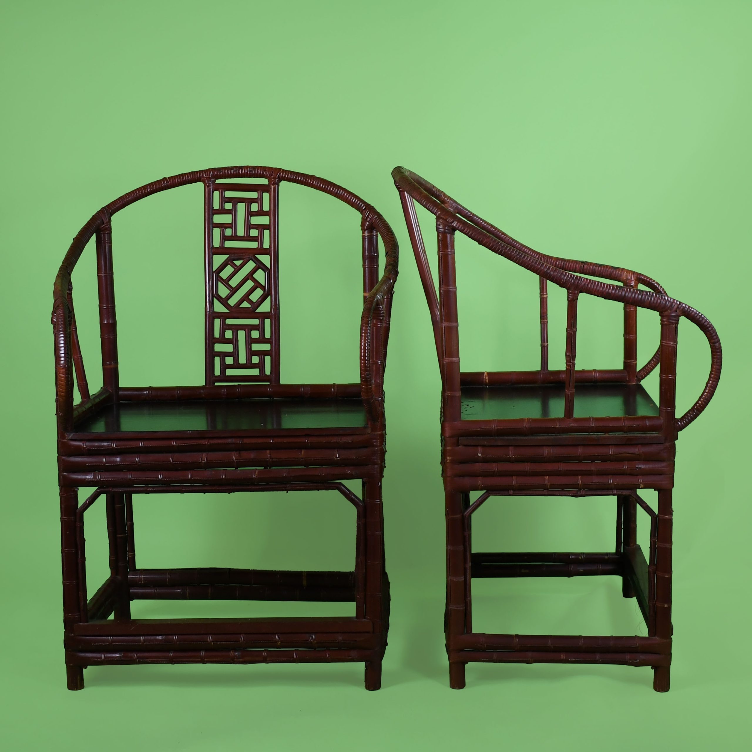Pair of Chinoiserie Burgundy Barrel Chairs in nice as found VINTAGE condition. There are minor scuffs, scrapes and wear to the as found finish. (see photos)