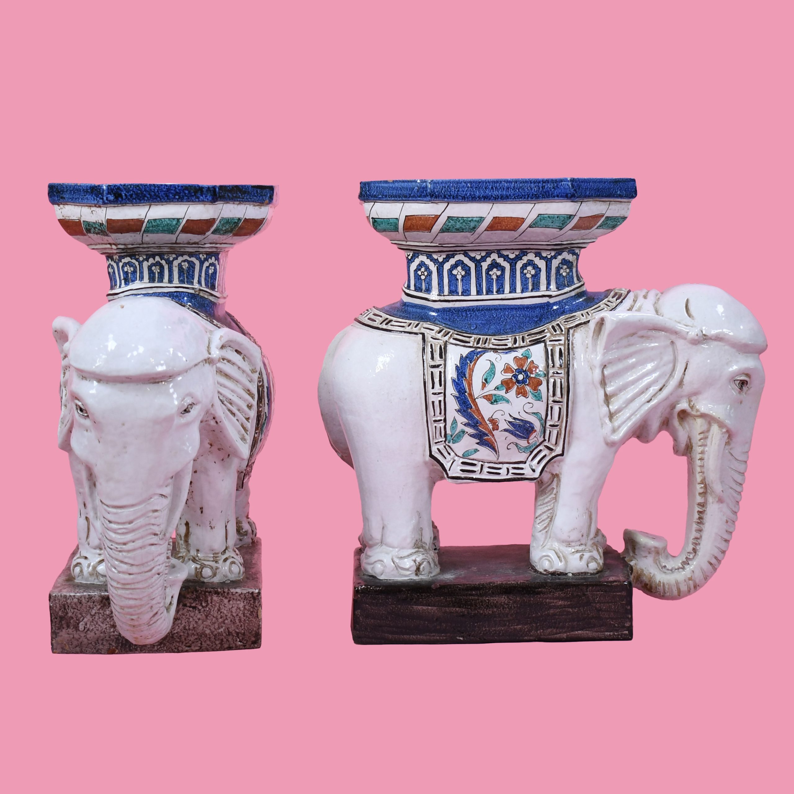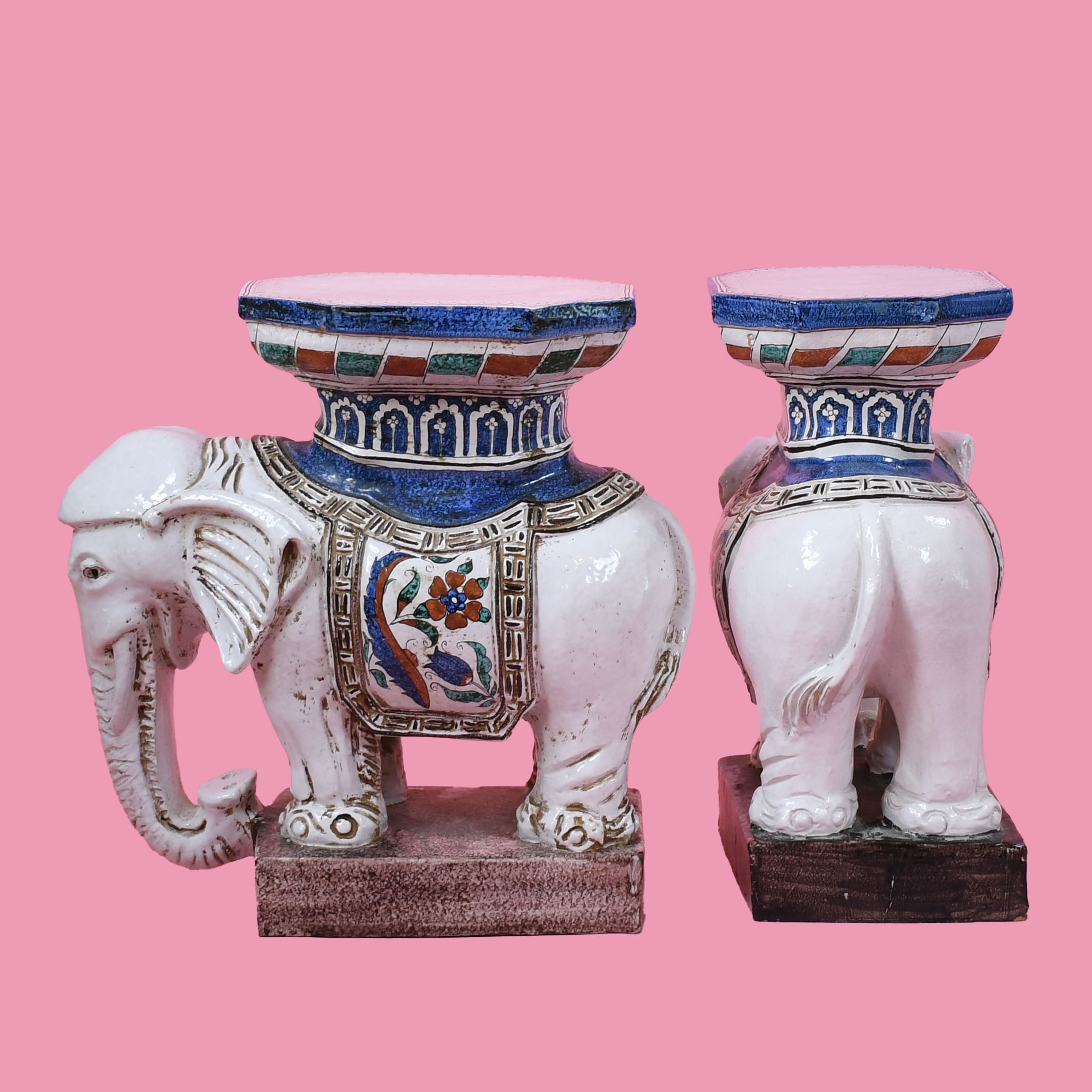 Pair of Chinoiserie White Elephant Garden Seats in nice as found VINTAGE condition. There are minor scuffs, scrapes and wear to the glazed finish. (see photos)