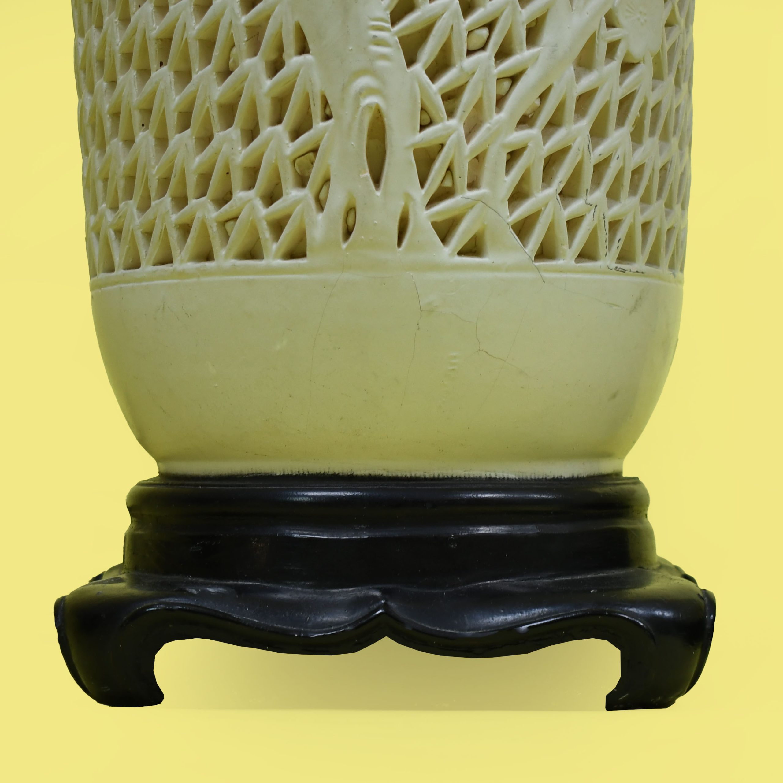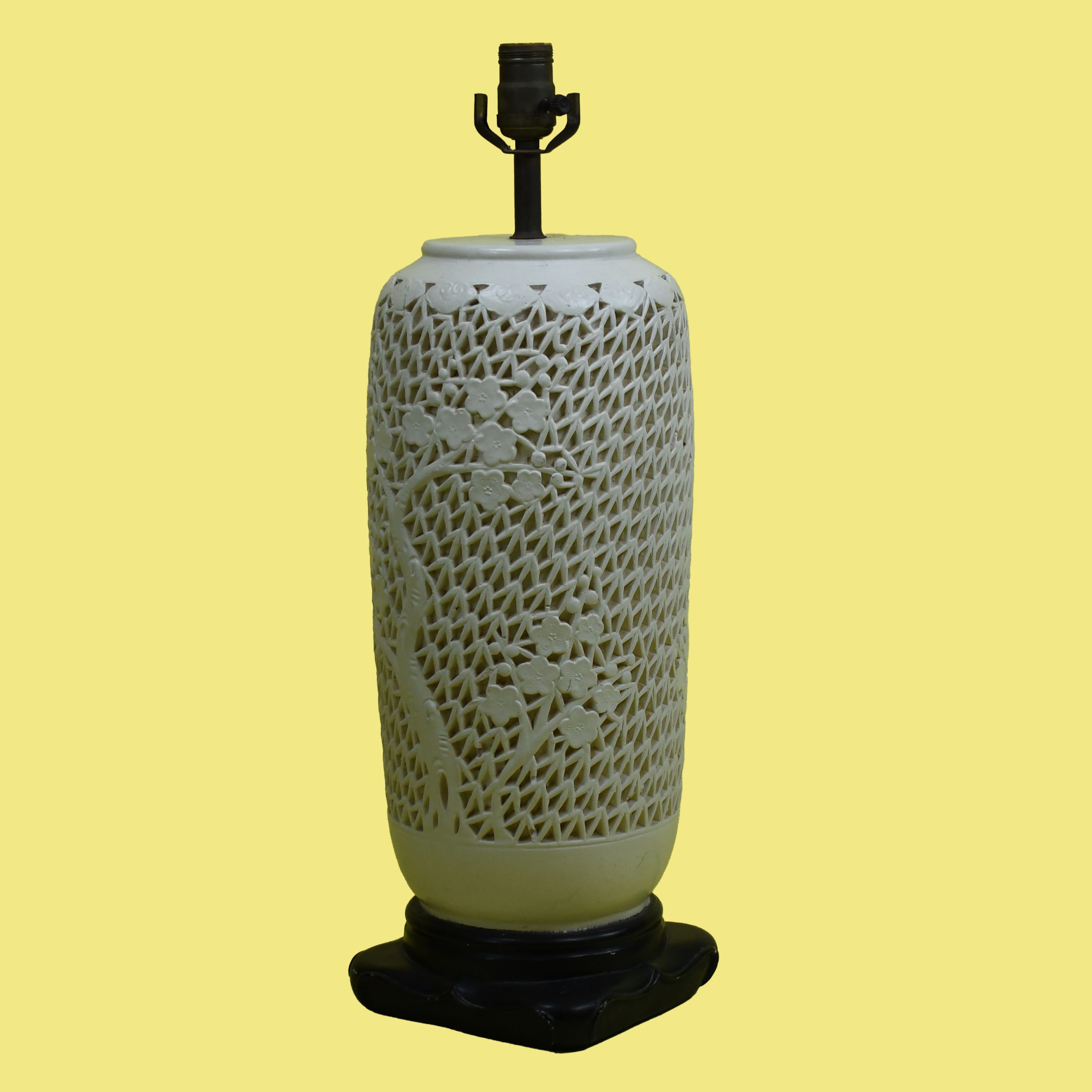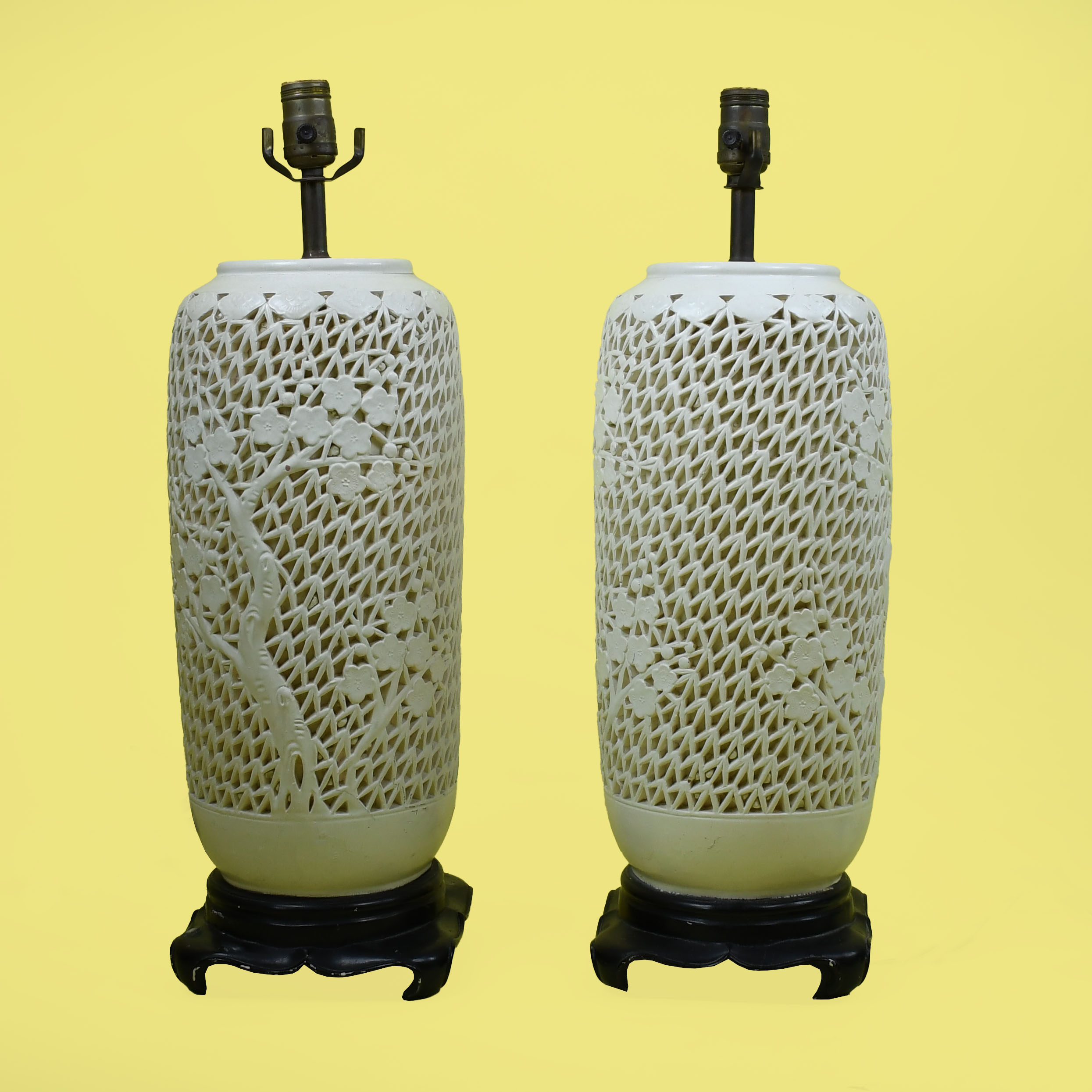 Pair of Chinoiserie White Table Lamps in nice as found VINTAGE condition. There are scuffs, scrapes, wear and lots of patina to the original finish. Original wiring. (see photos)