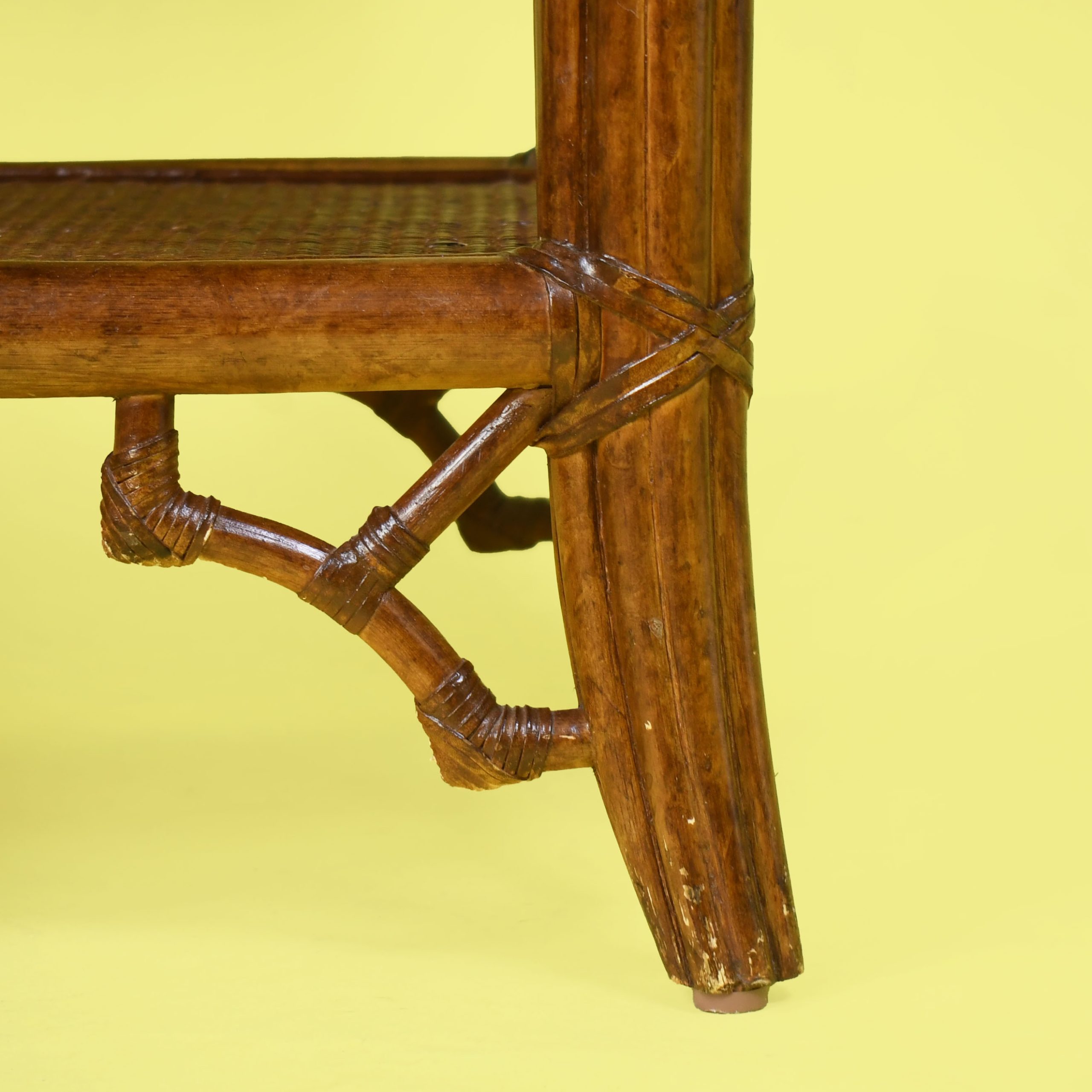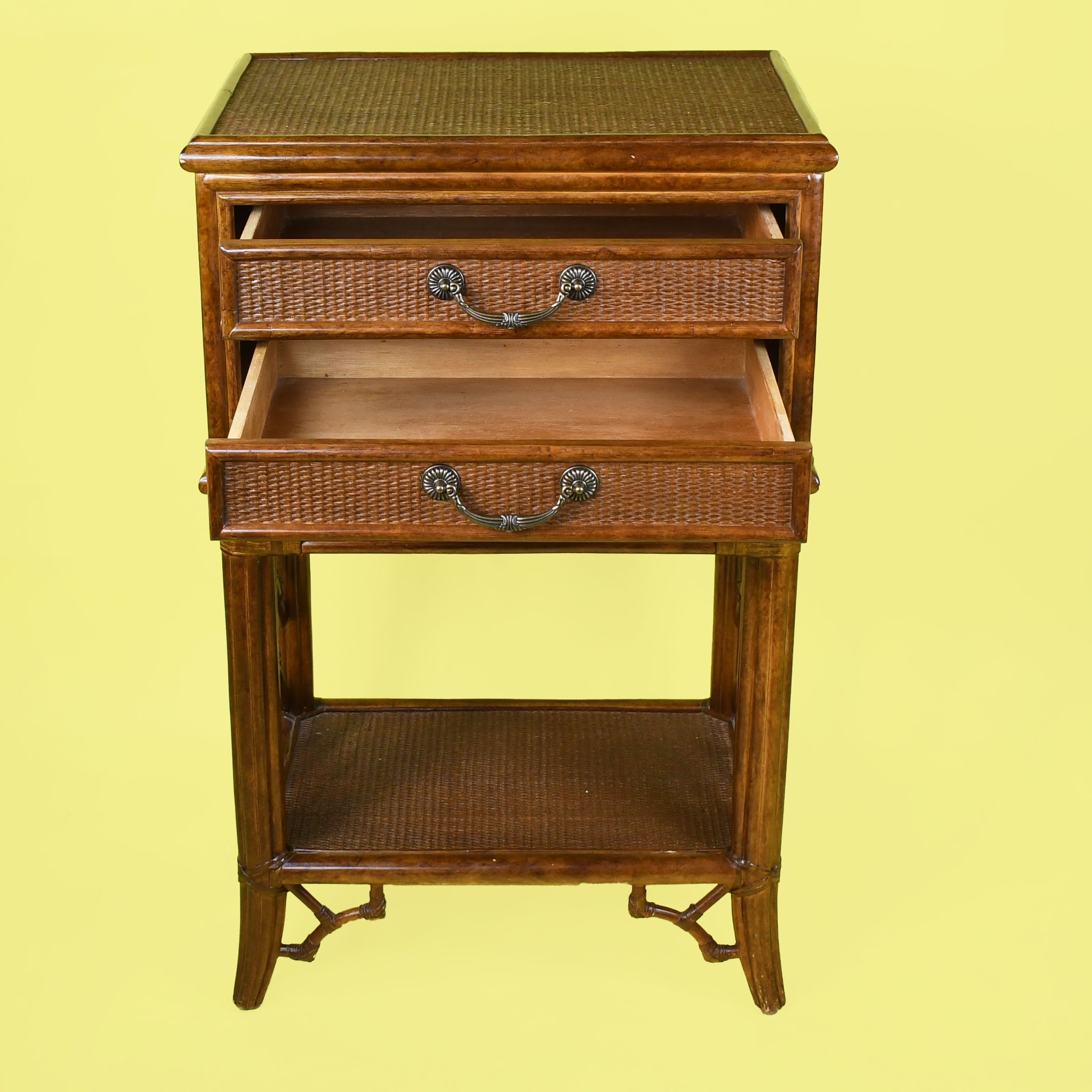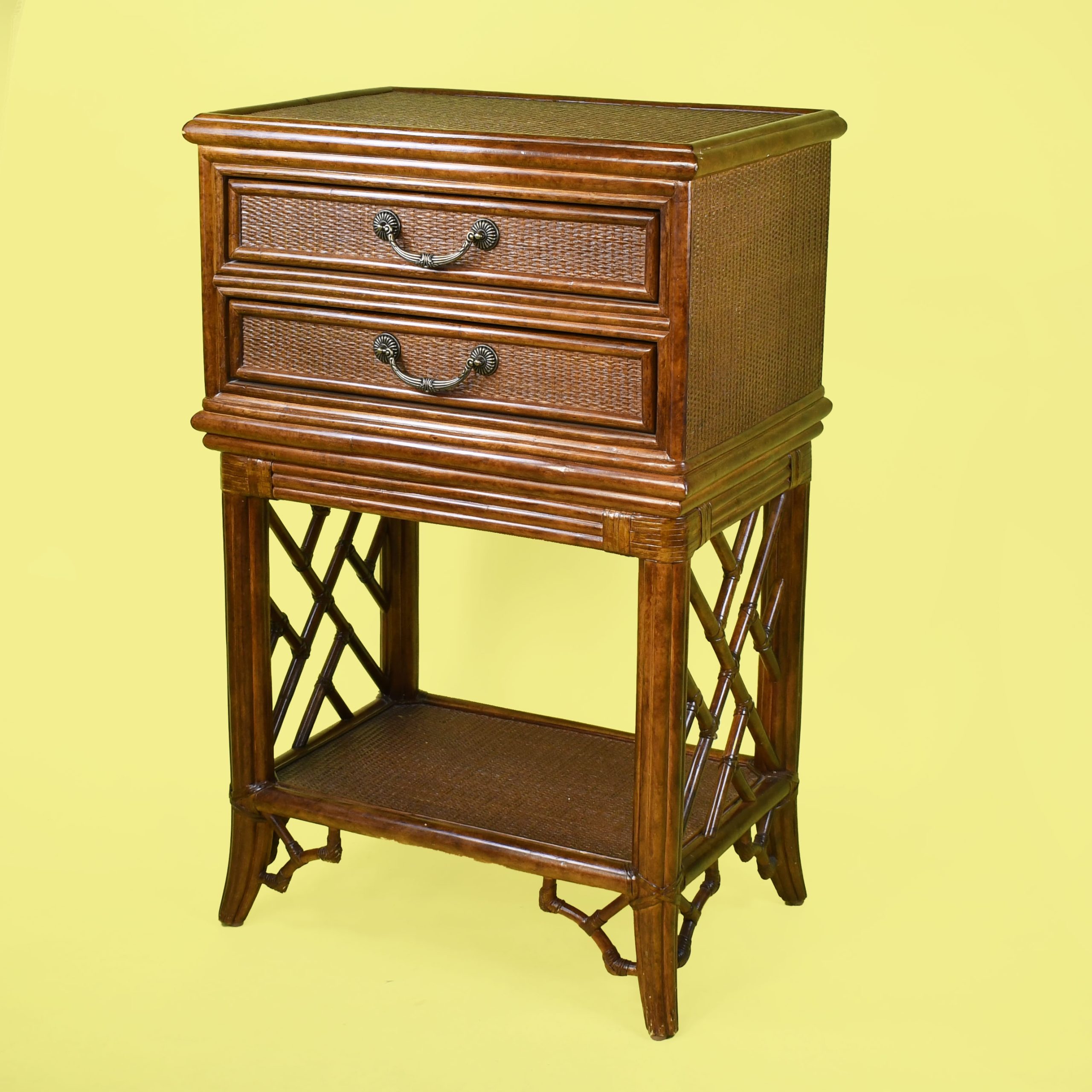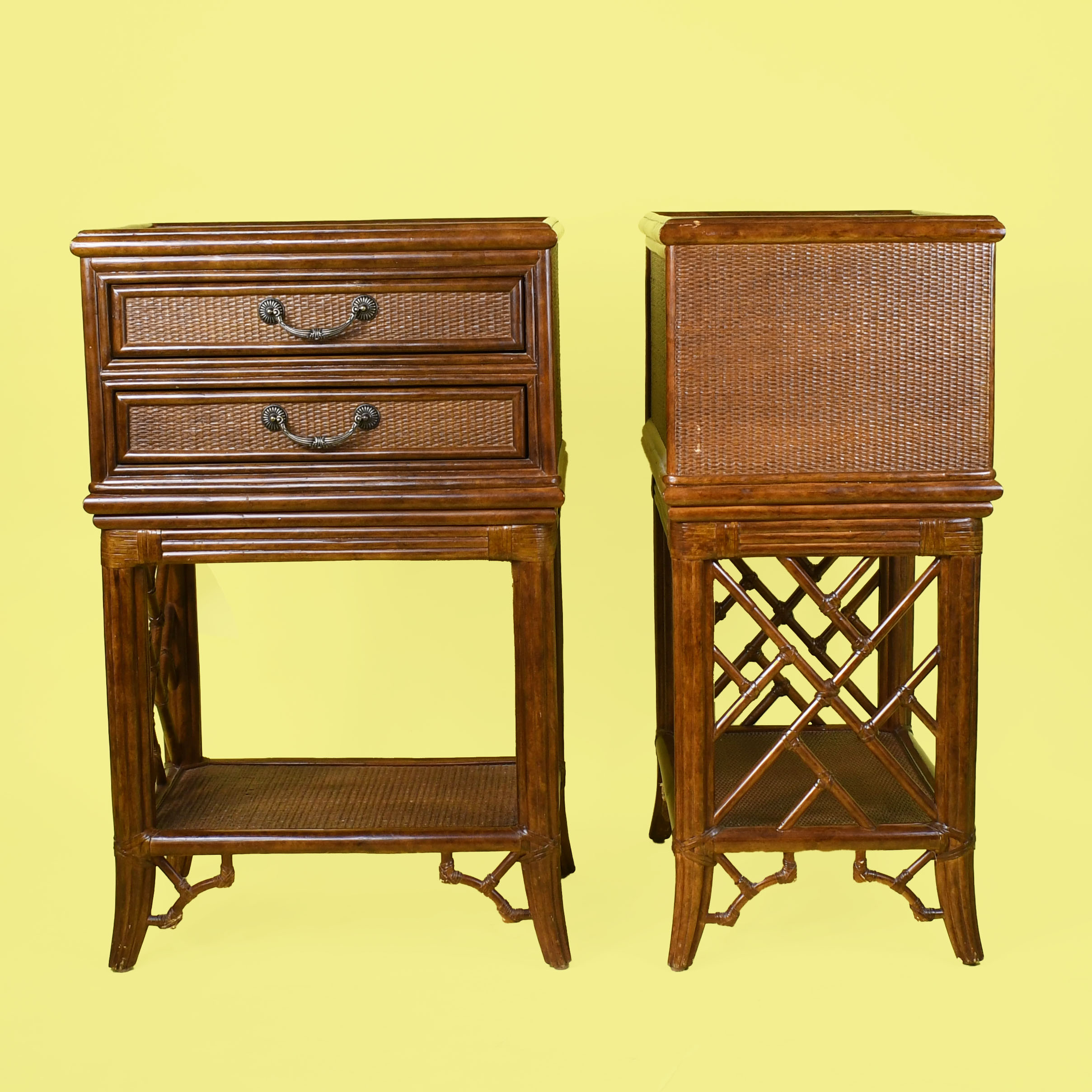 Pair of Fretwork Woven Rattan Tall Nightstands in nice as found vintage condition. There are minor scuffs, scrapes and wear to the original finish. (see photos)