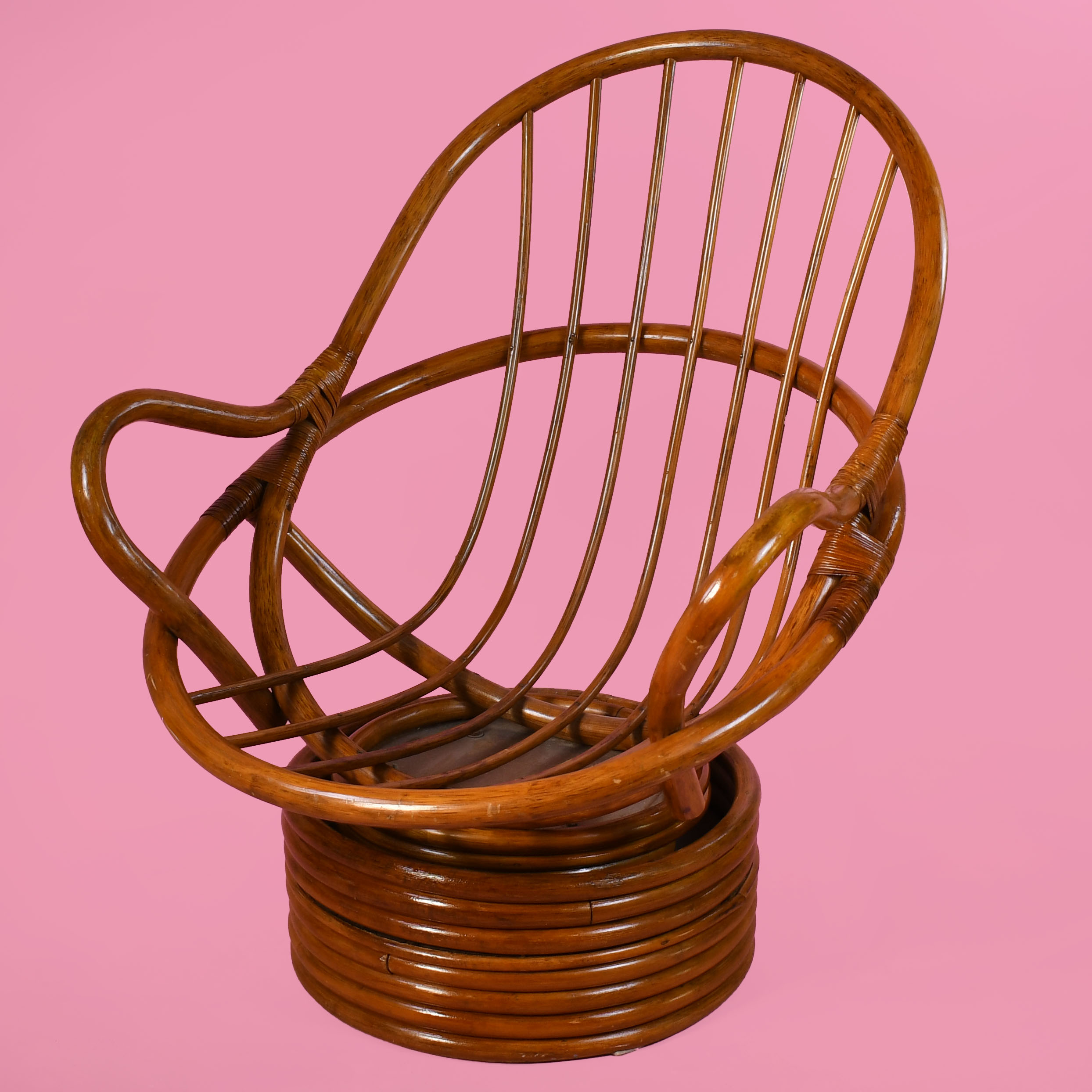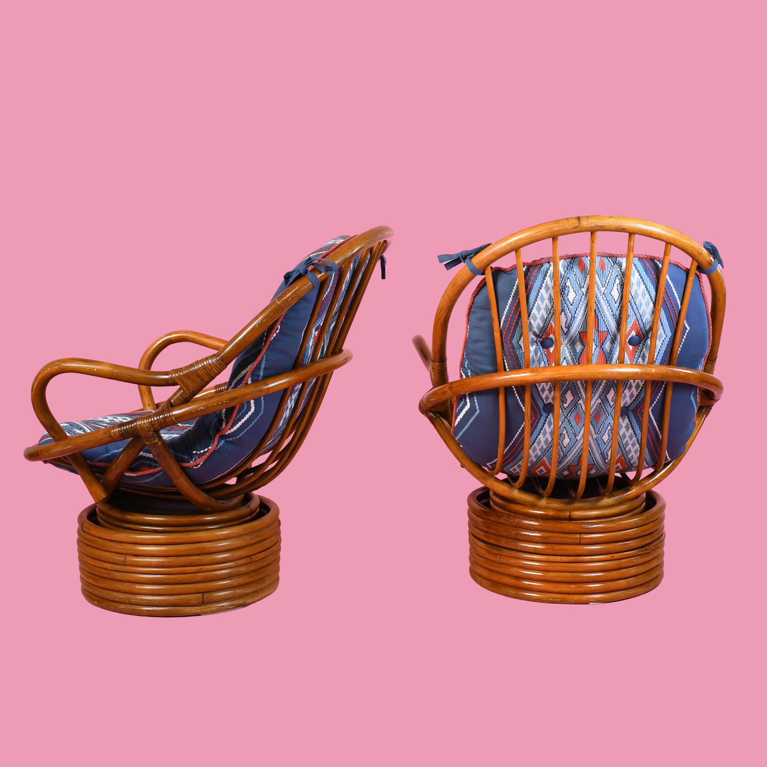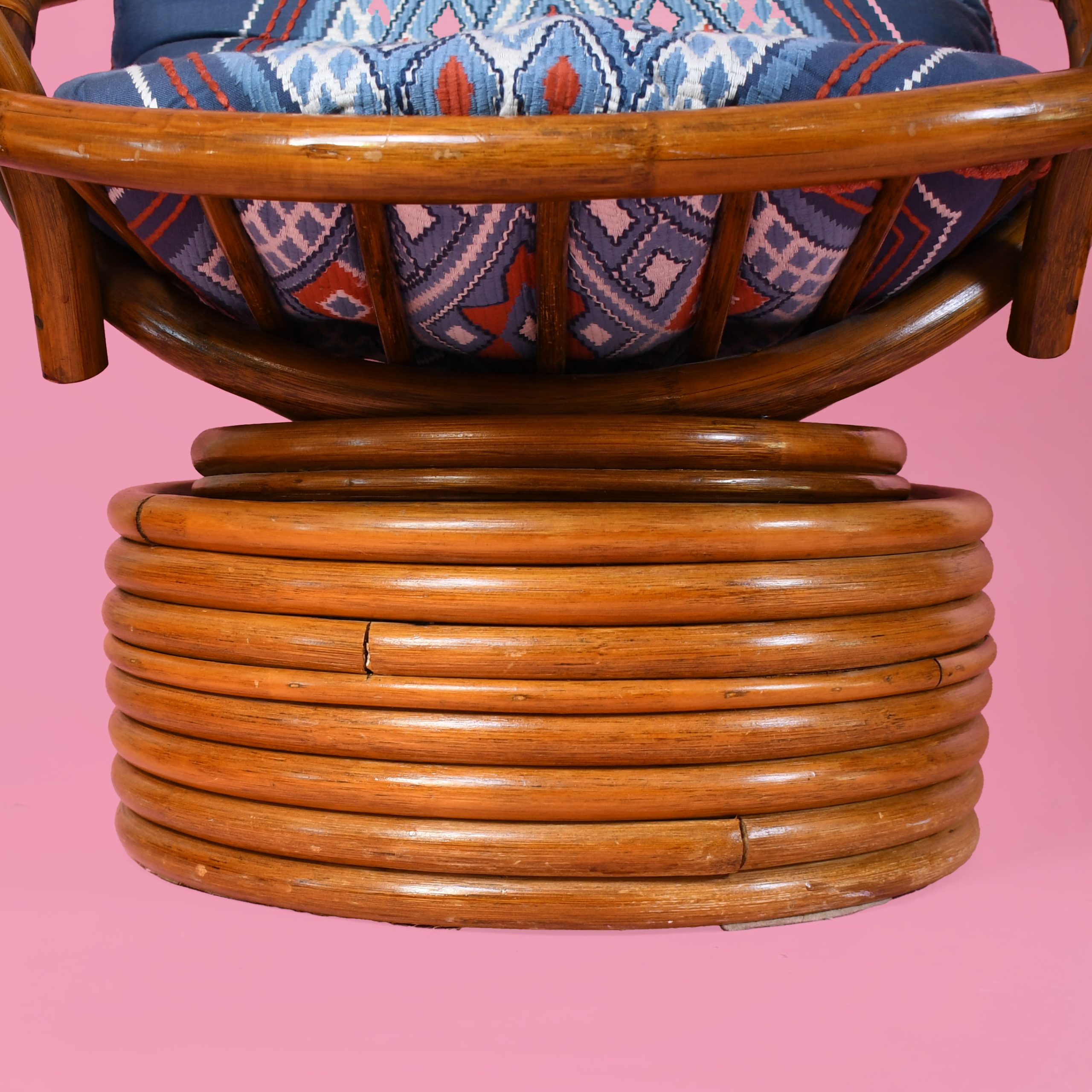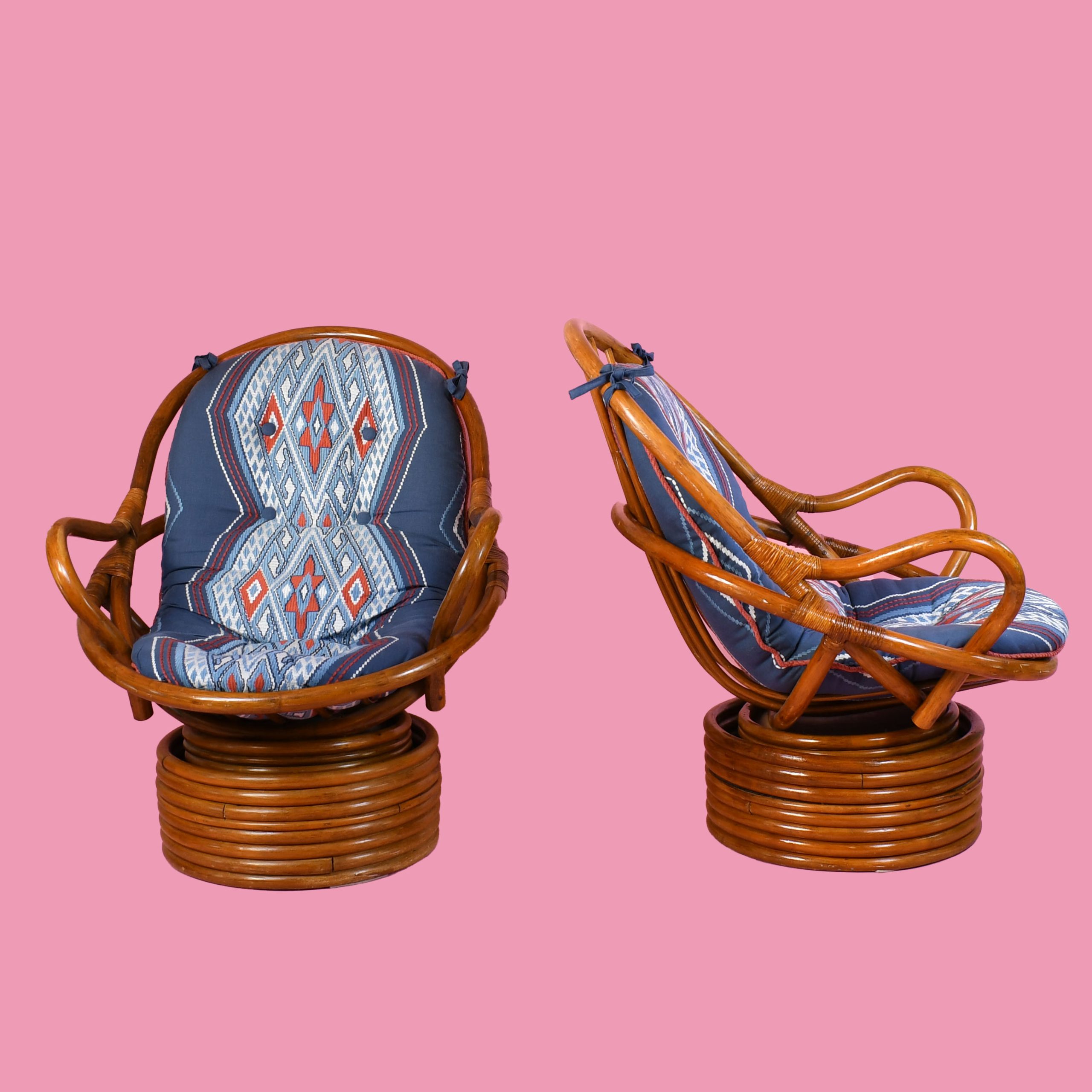Pair of Low Rattan Papasan Chair in nice as found vintage condition. There are minor scuffs, scrapes and wear to the original finish. As found upholstery. (see photos)