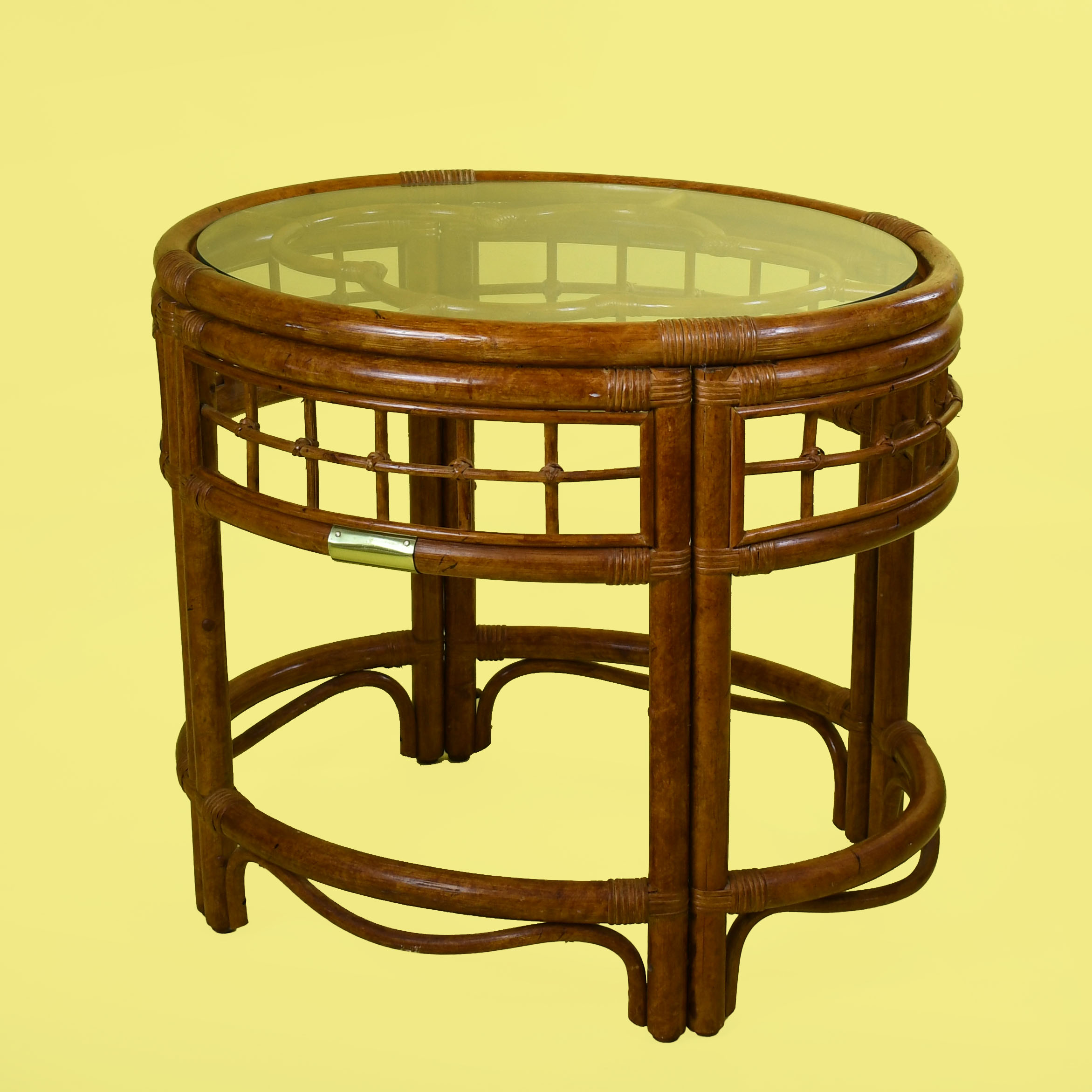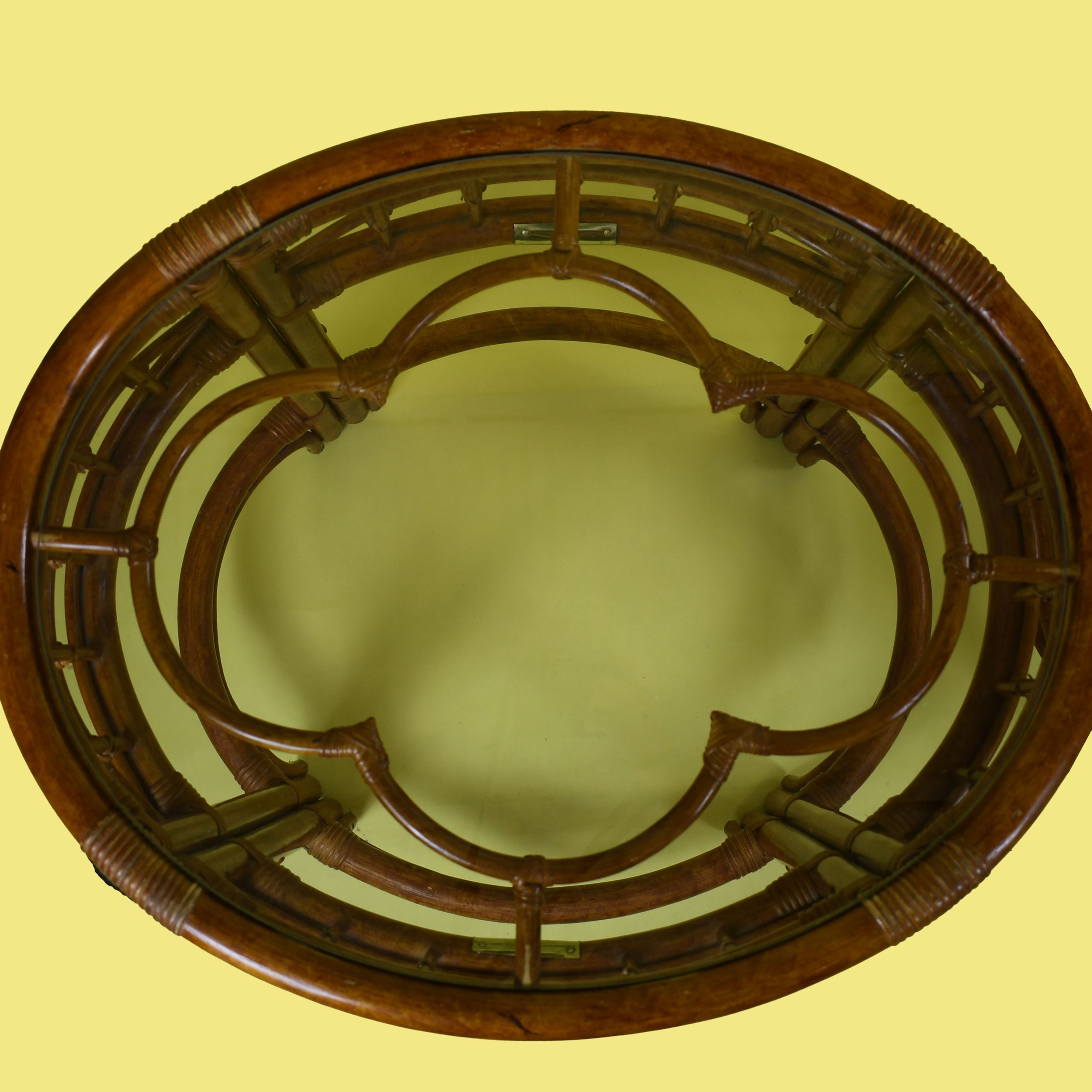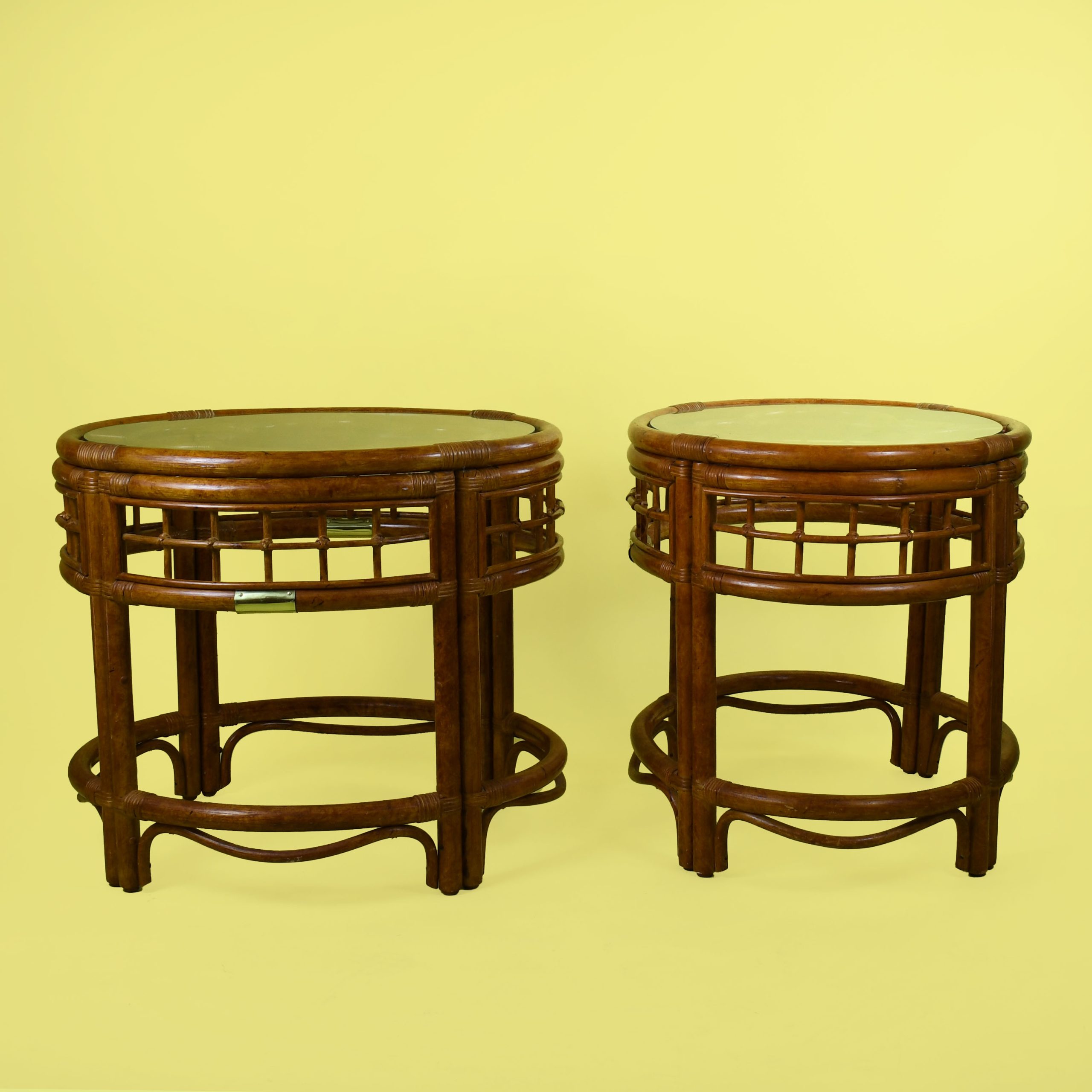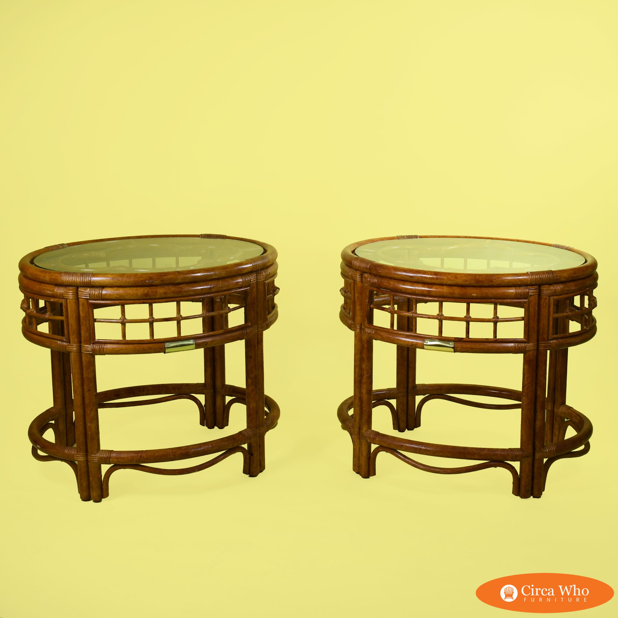 Pair of Oval Tortoise Side Table in nice as found condition. There are minor scuffs, scrapes and wear to the as found finish. Glass top has wear from use. (see photos)