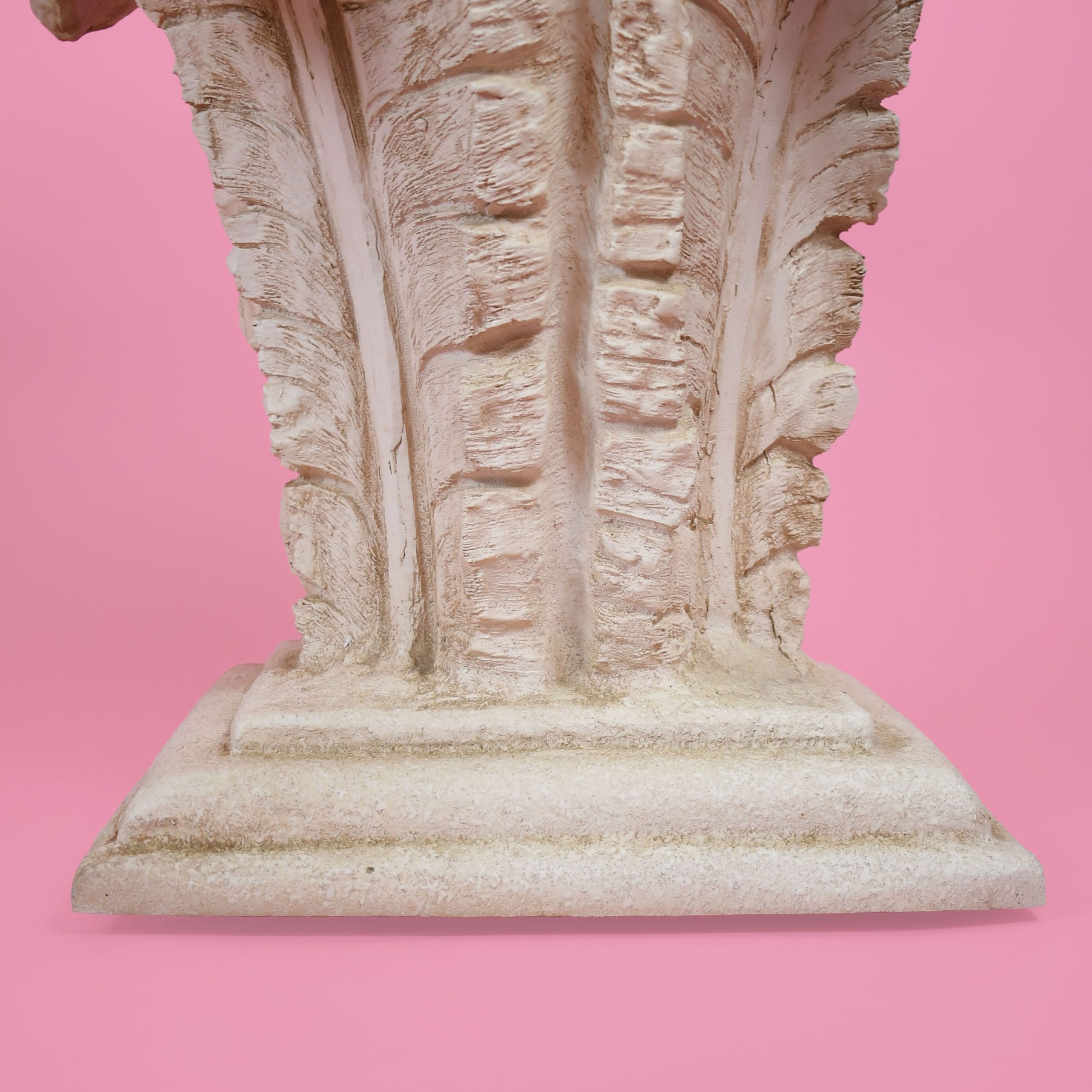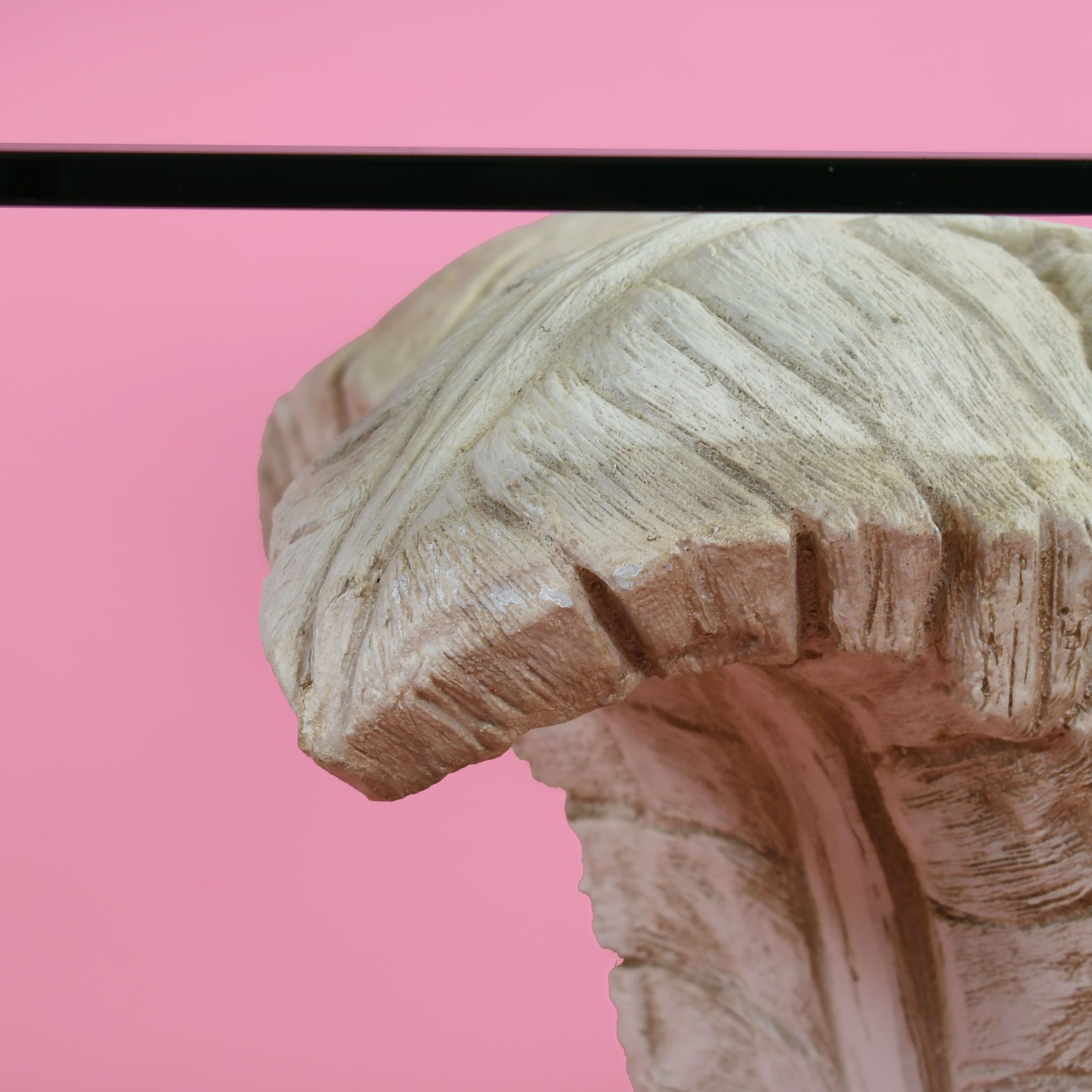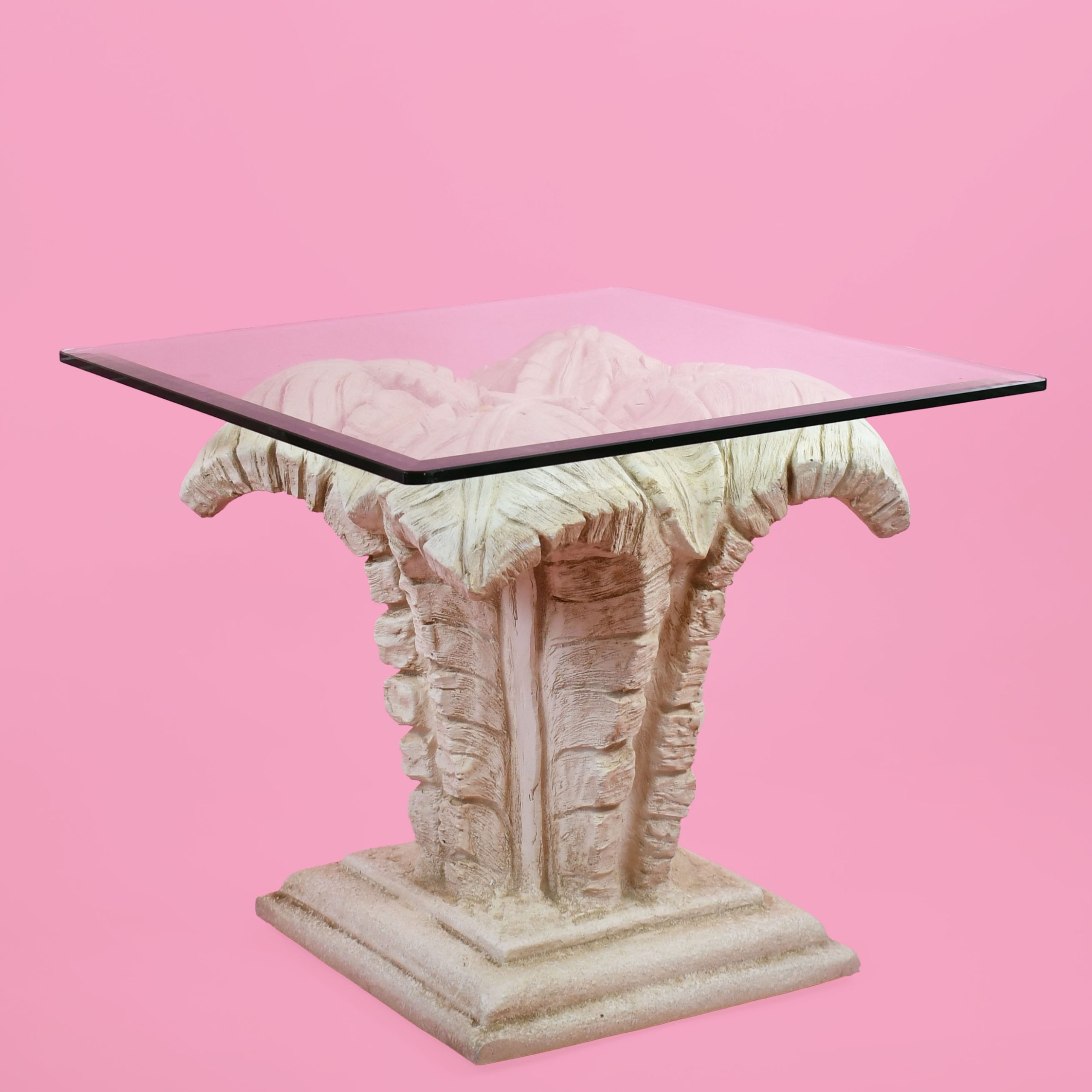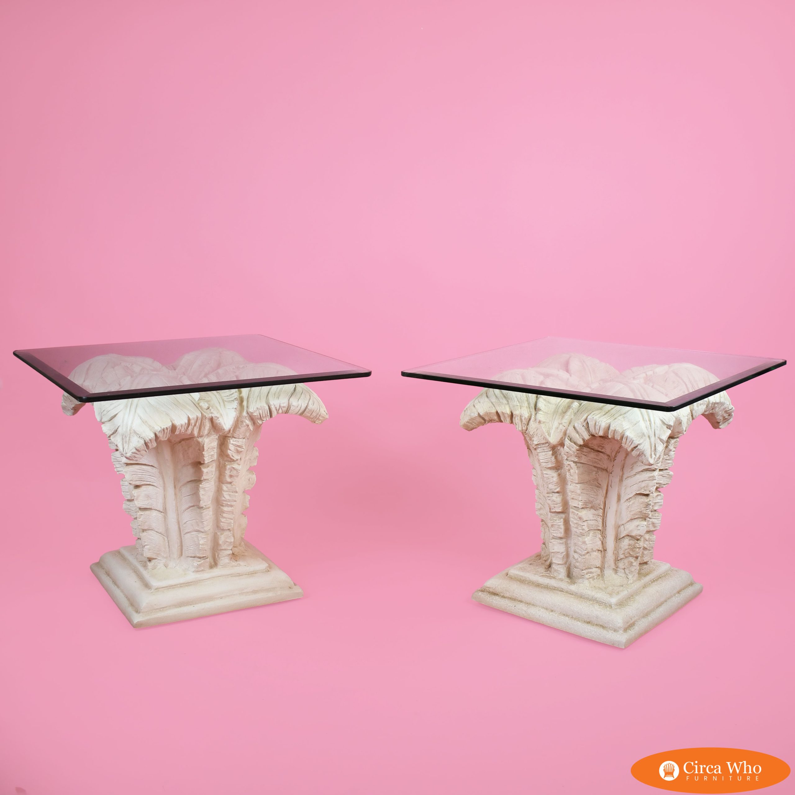 Pair of Palm Leaf Plaster Side Tables in nice as found condition. There are minor scuffs, scrapes and wear to the as found finish. Glass top has wear from use. (see photos)
