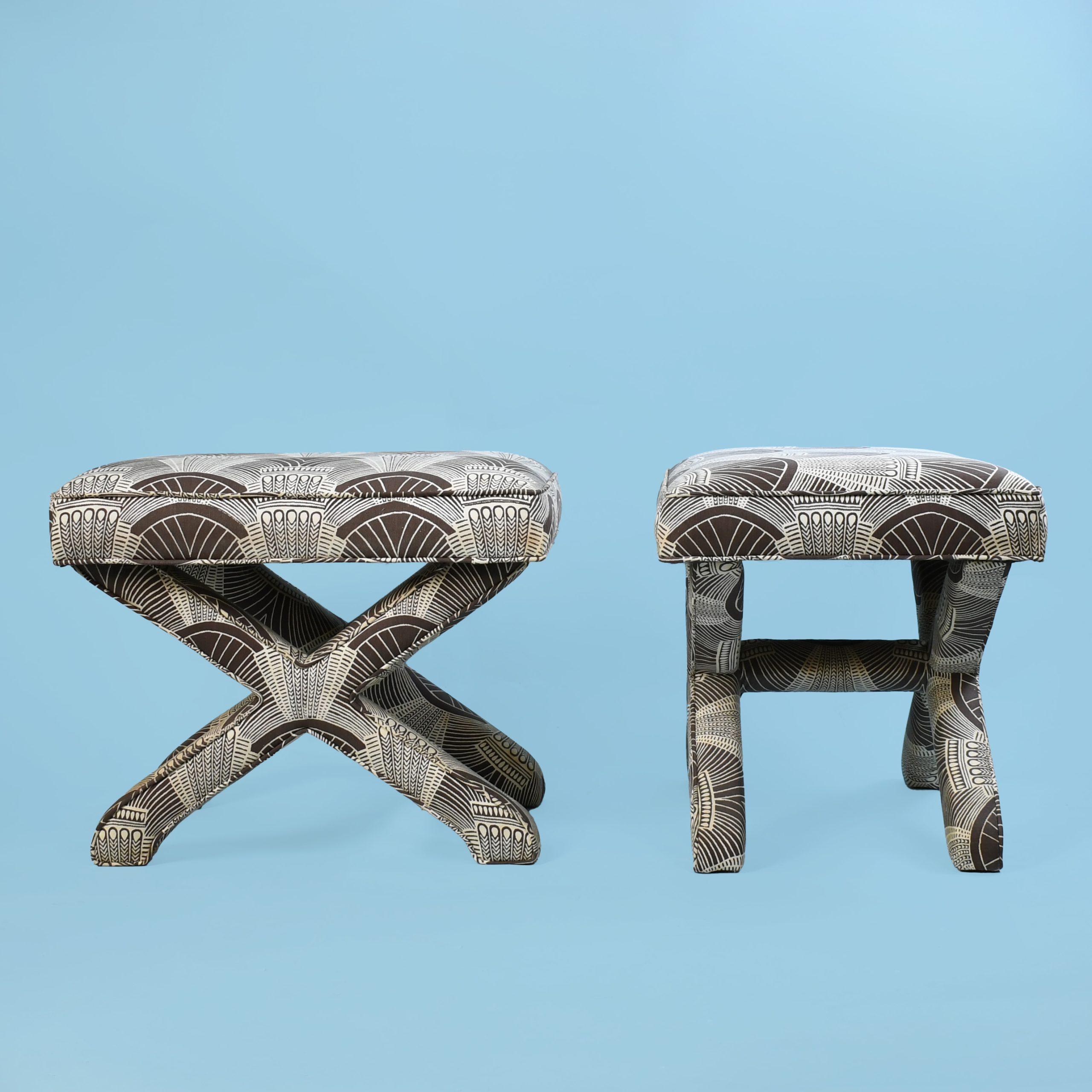 Pair of Vintage X Benches in nice as found VINTAGE condition. There are minor scuffs, scrapes and wear to the as found finish. As found Upholstery . (see photos)