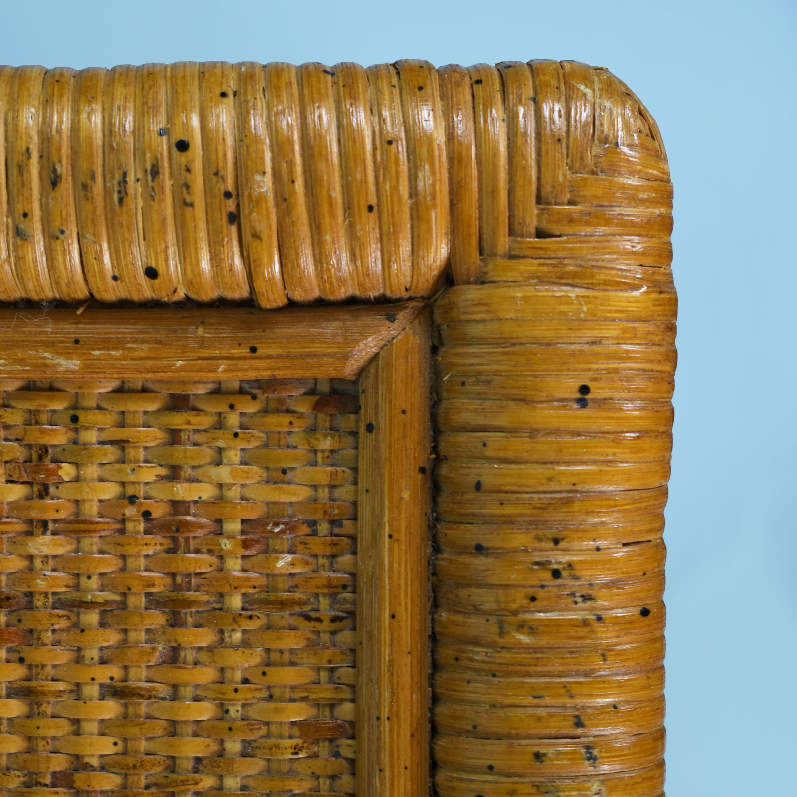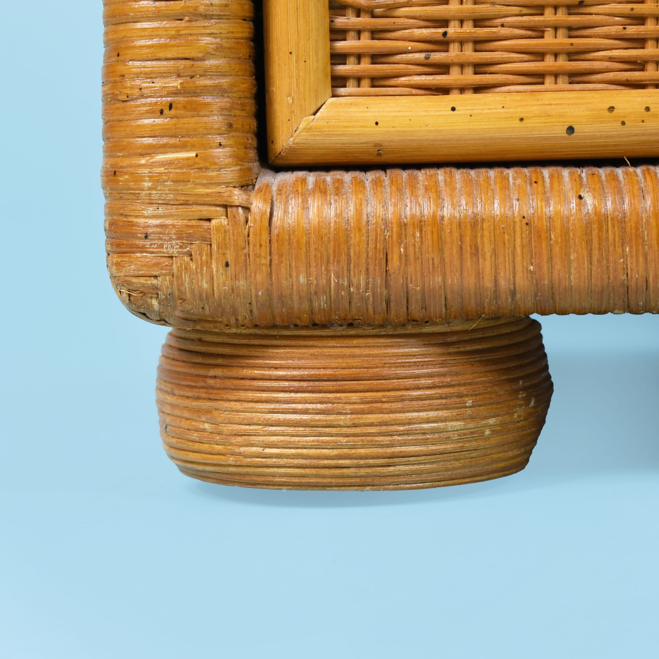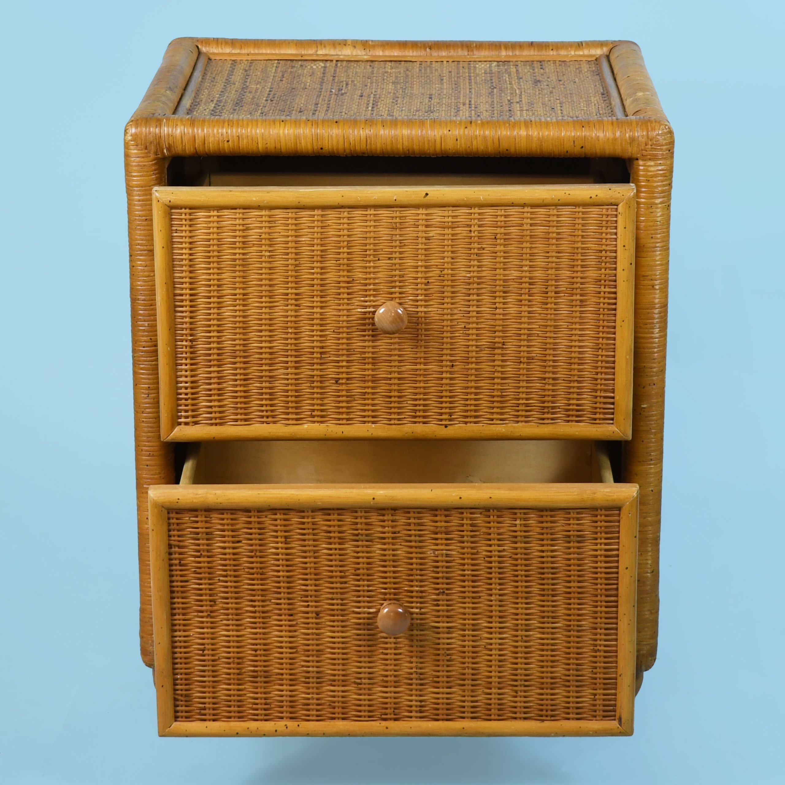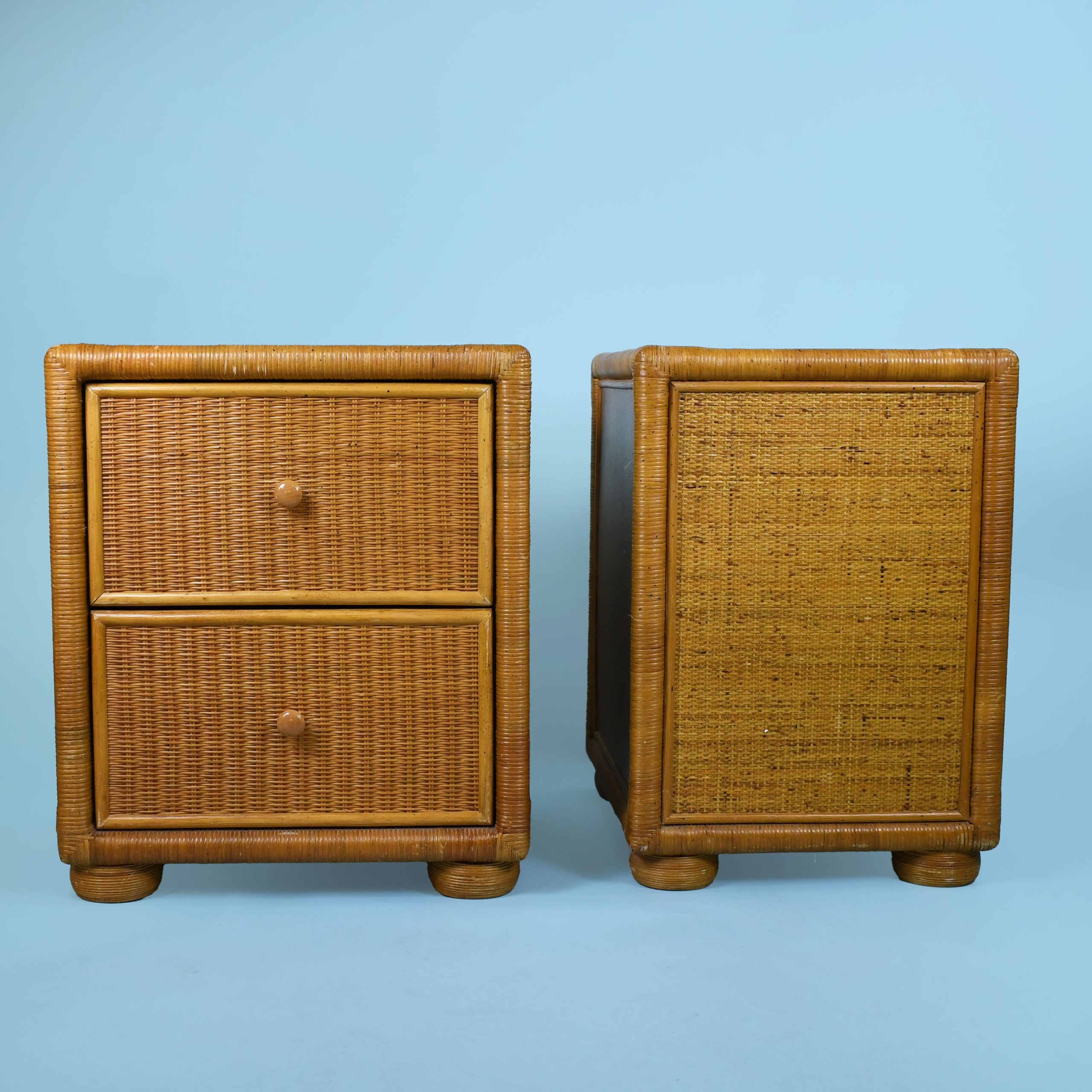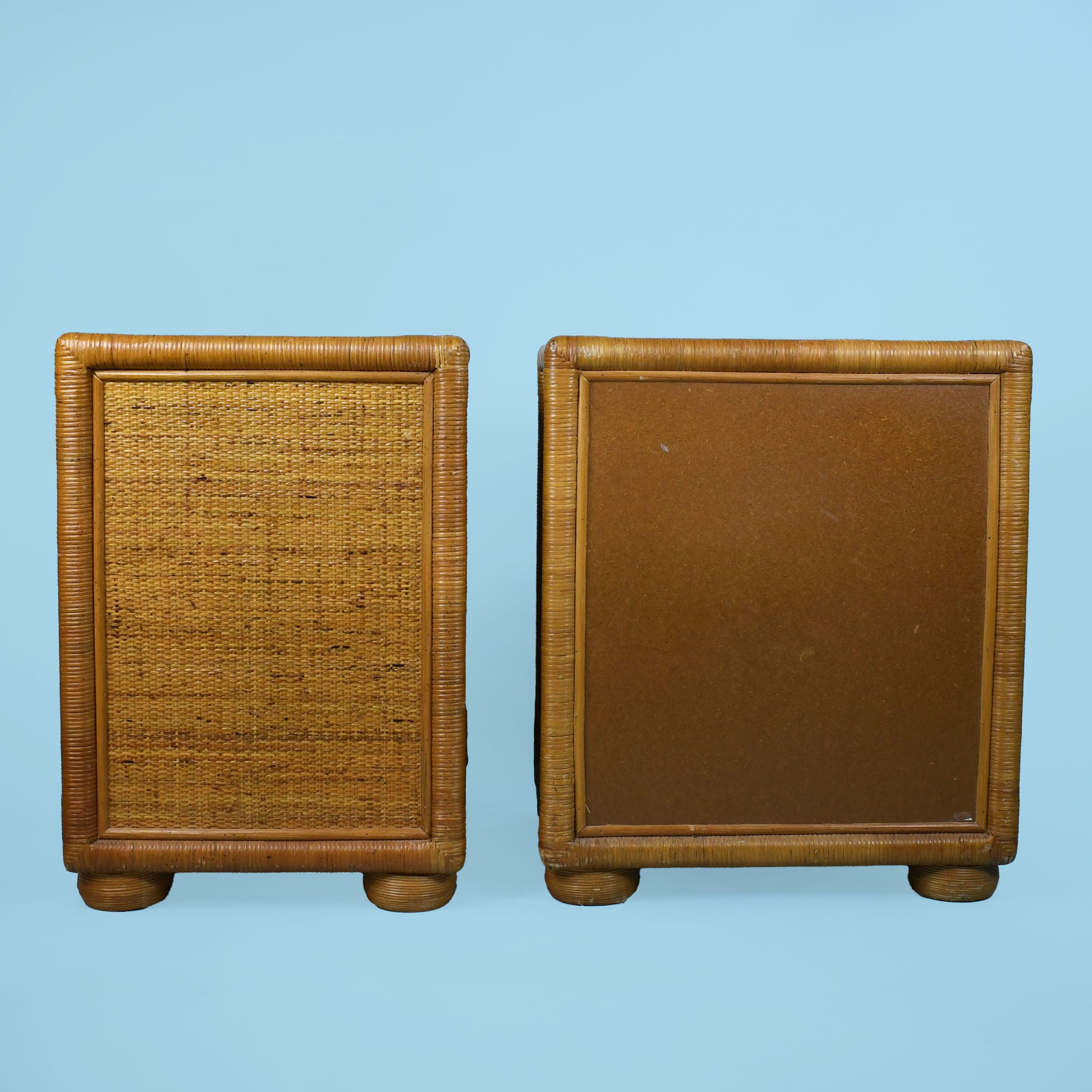 Pair of Woven Rattan and Cane Nightstands in nice as found vintage condition. There are minor scuffs, scrapes and wear to the original finish. (see photos)