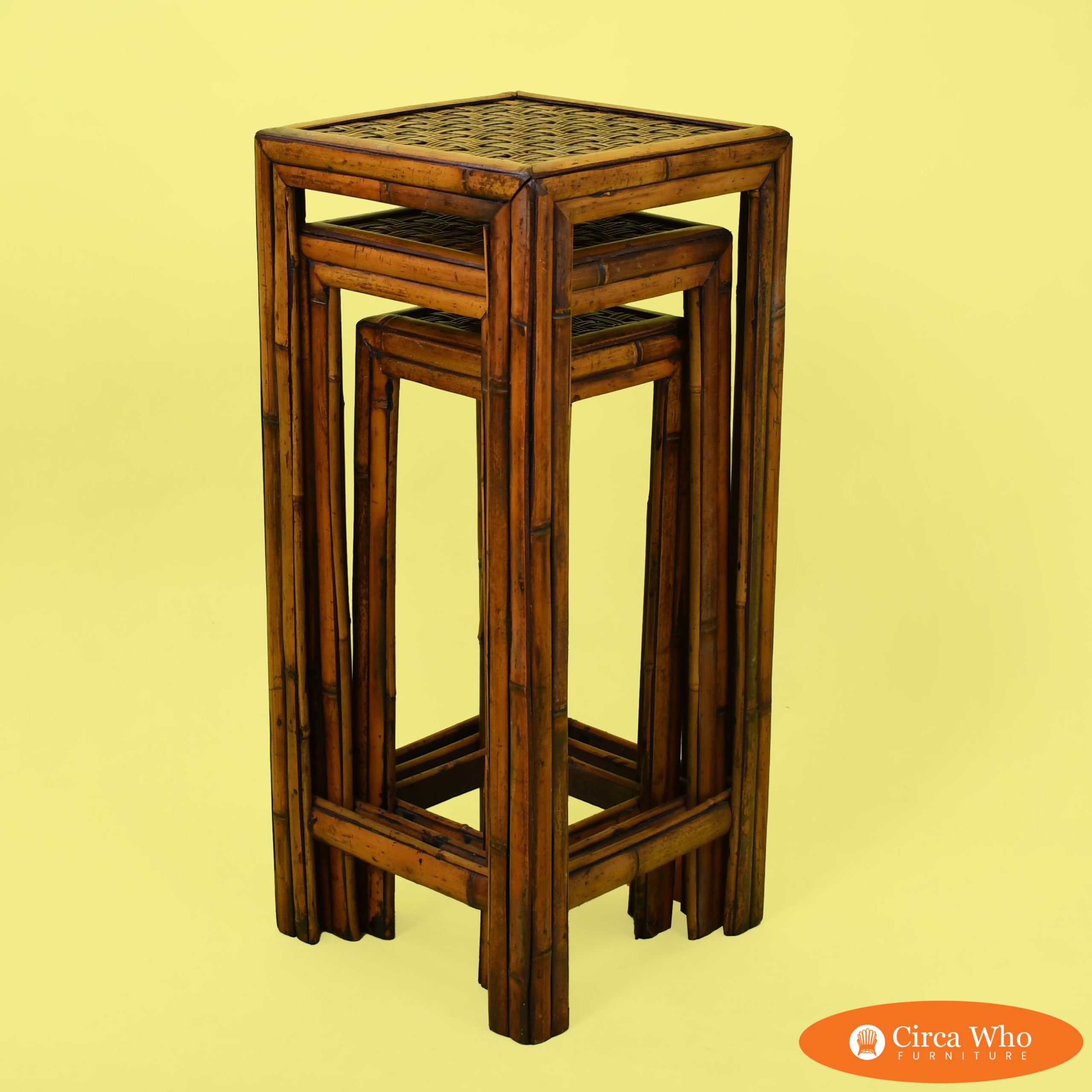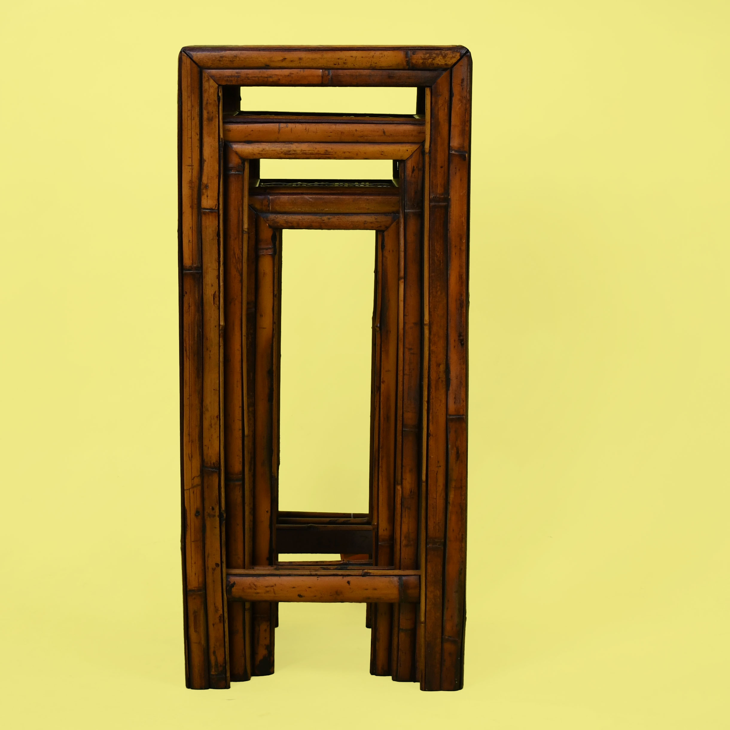 Set of 3 Tall Bamboo Nesting Tables in nice as found vintage condition. There are minor scuffs, scrapes and wear to the original finish. (see photos)
