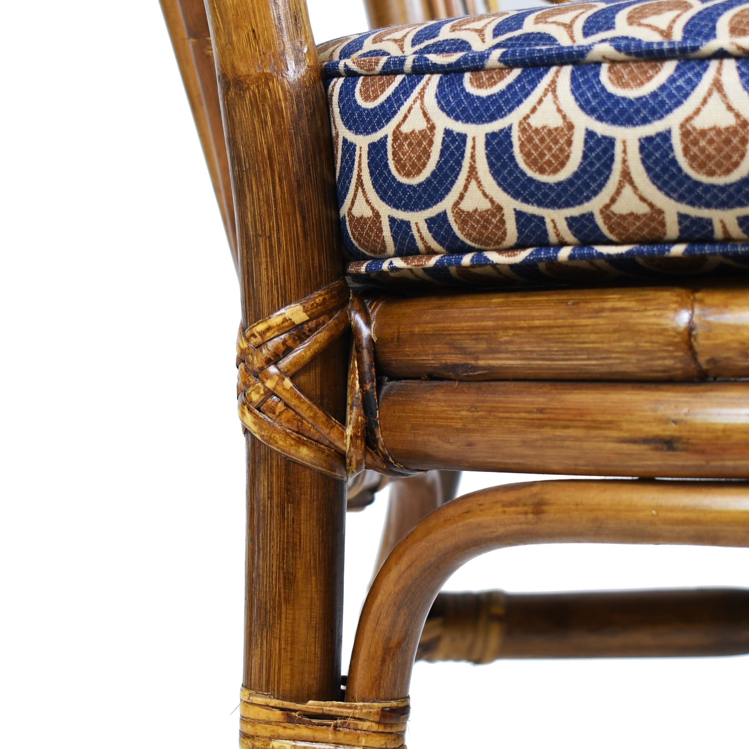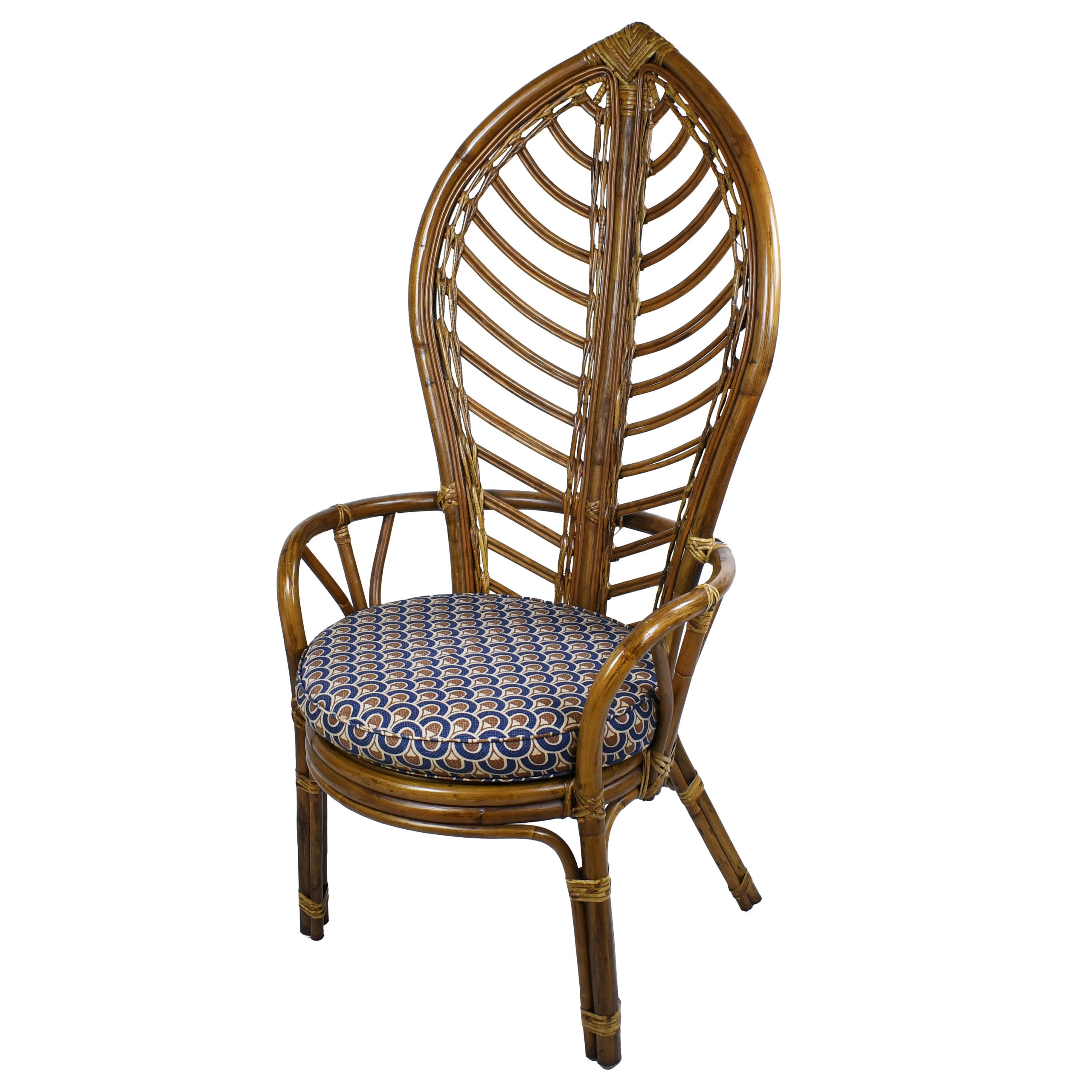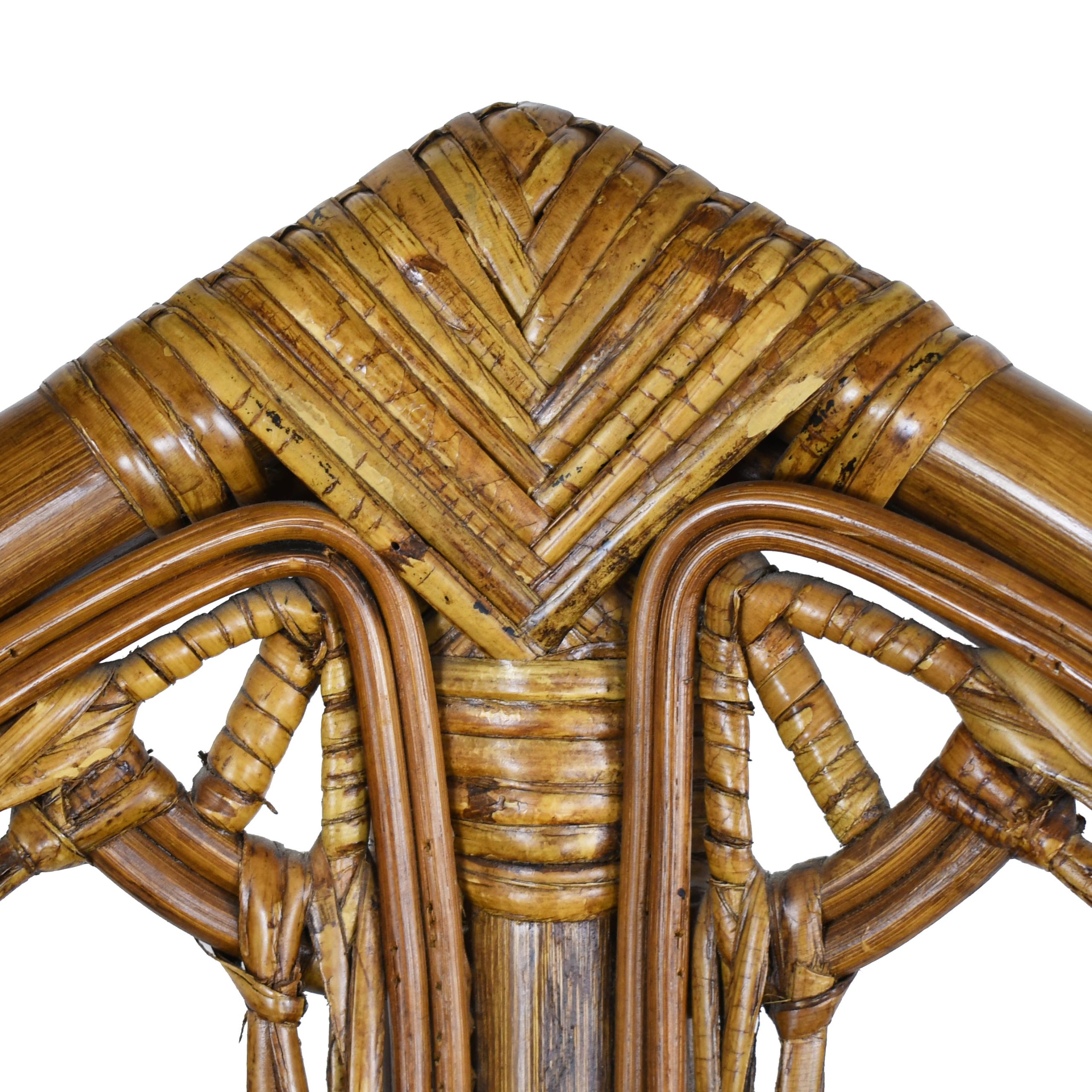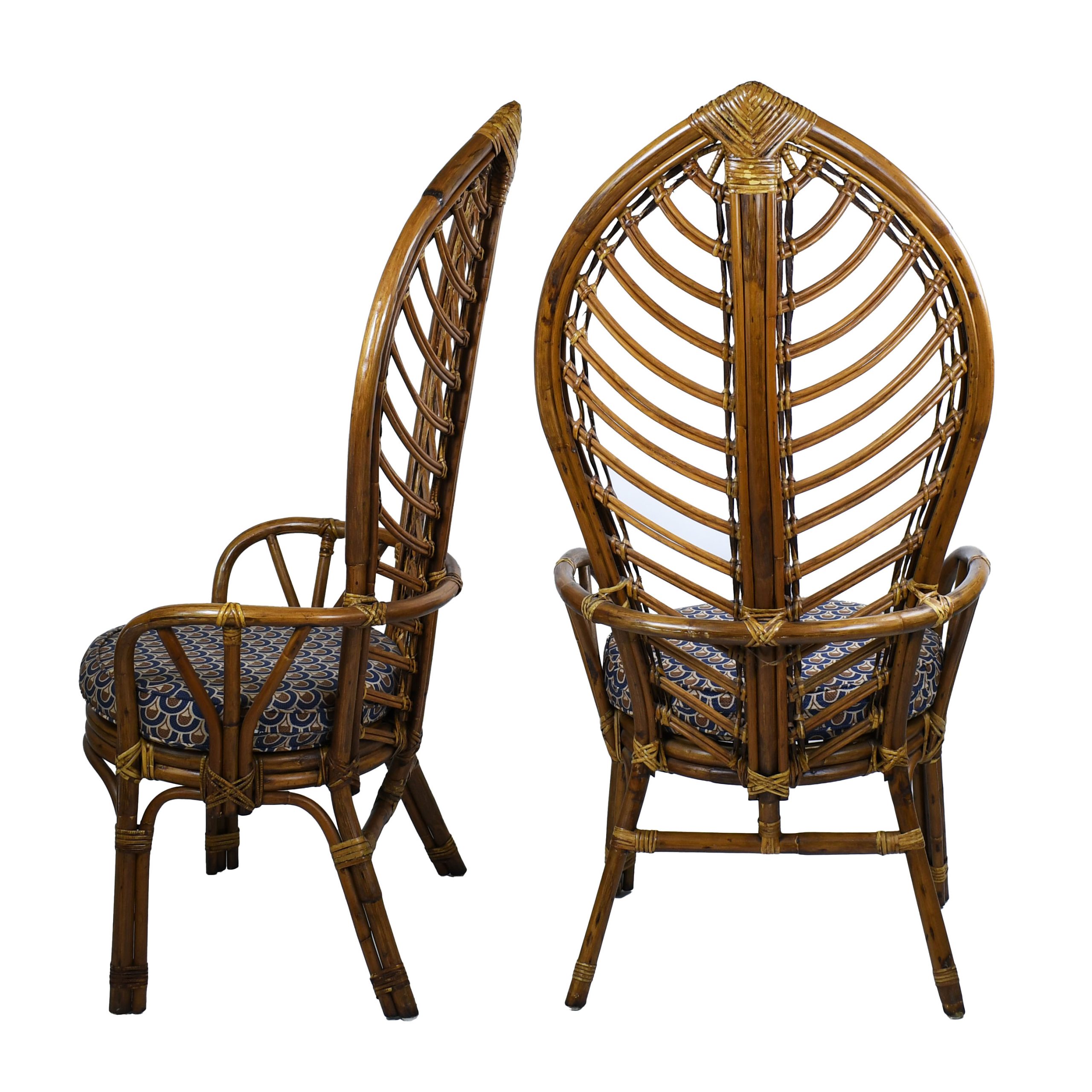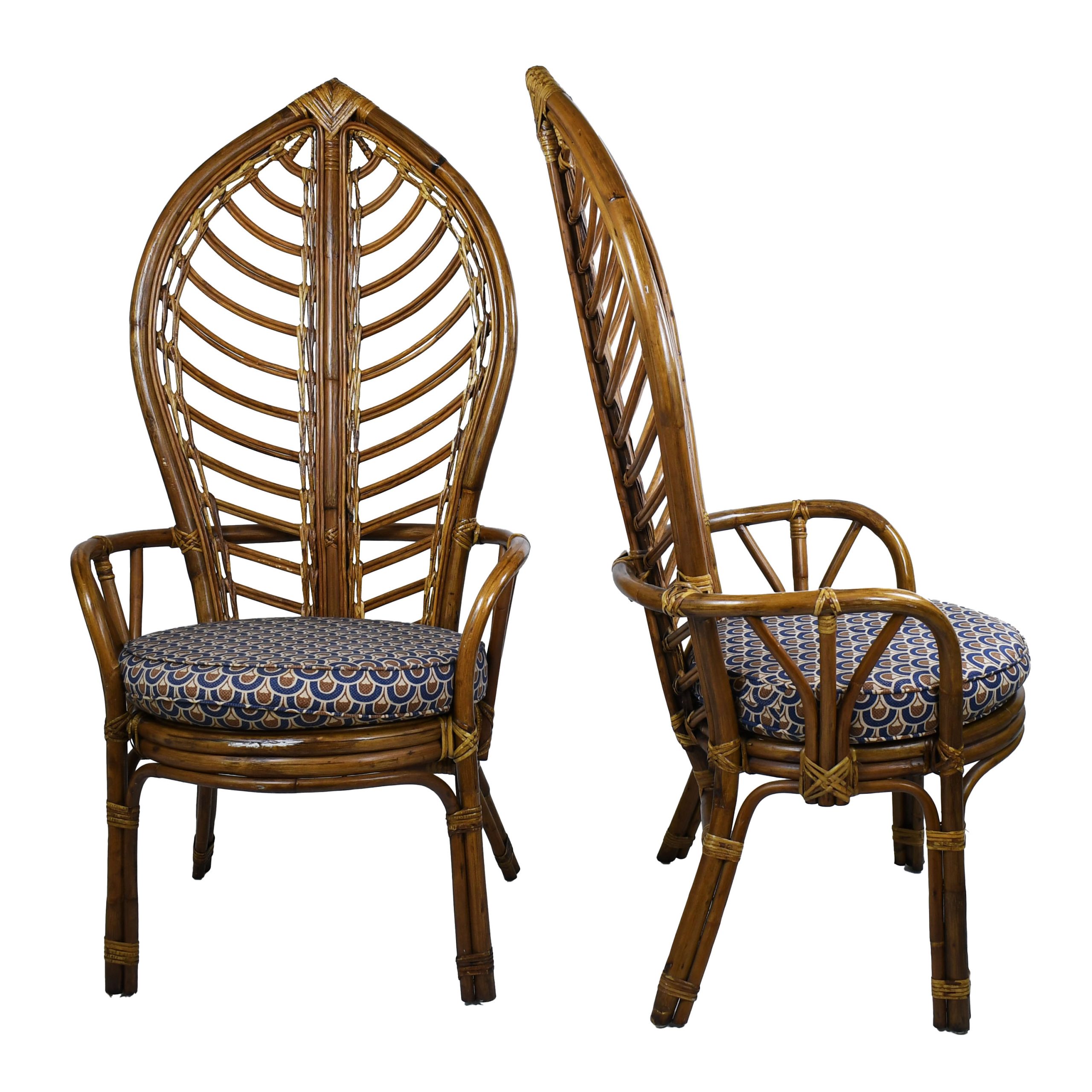 Set of 5 Rattan High Back Leaves Chairs in nice as found vintage condition. There are minor scuffs, scrapes and wear to the original finish. As found upholstery. (see photos)