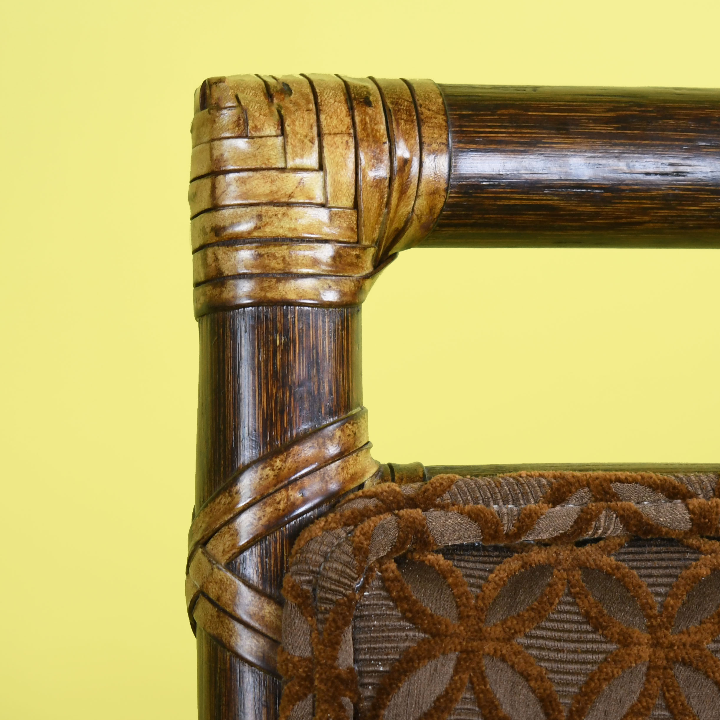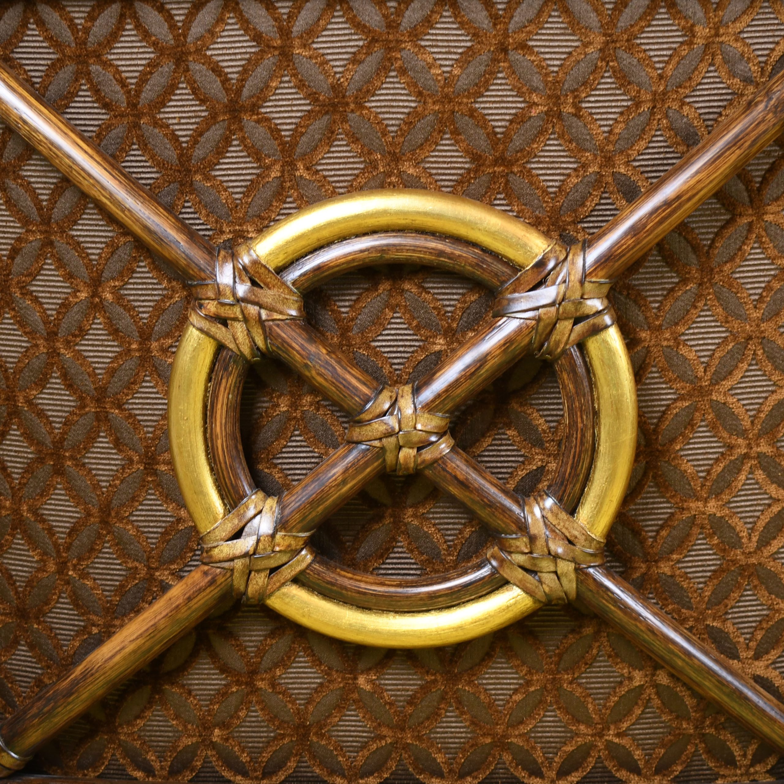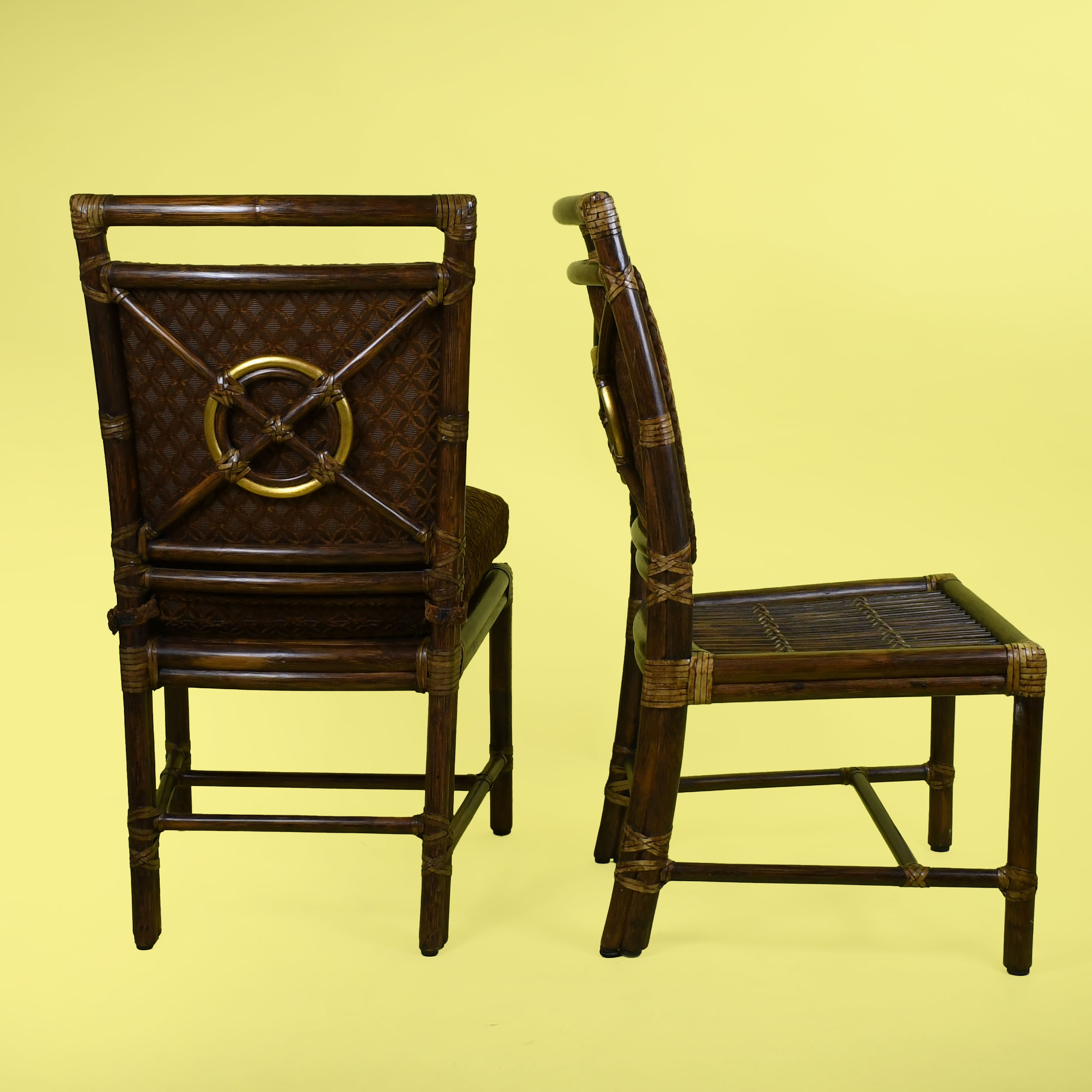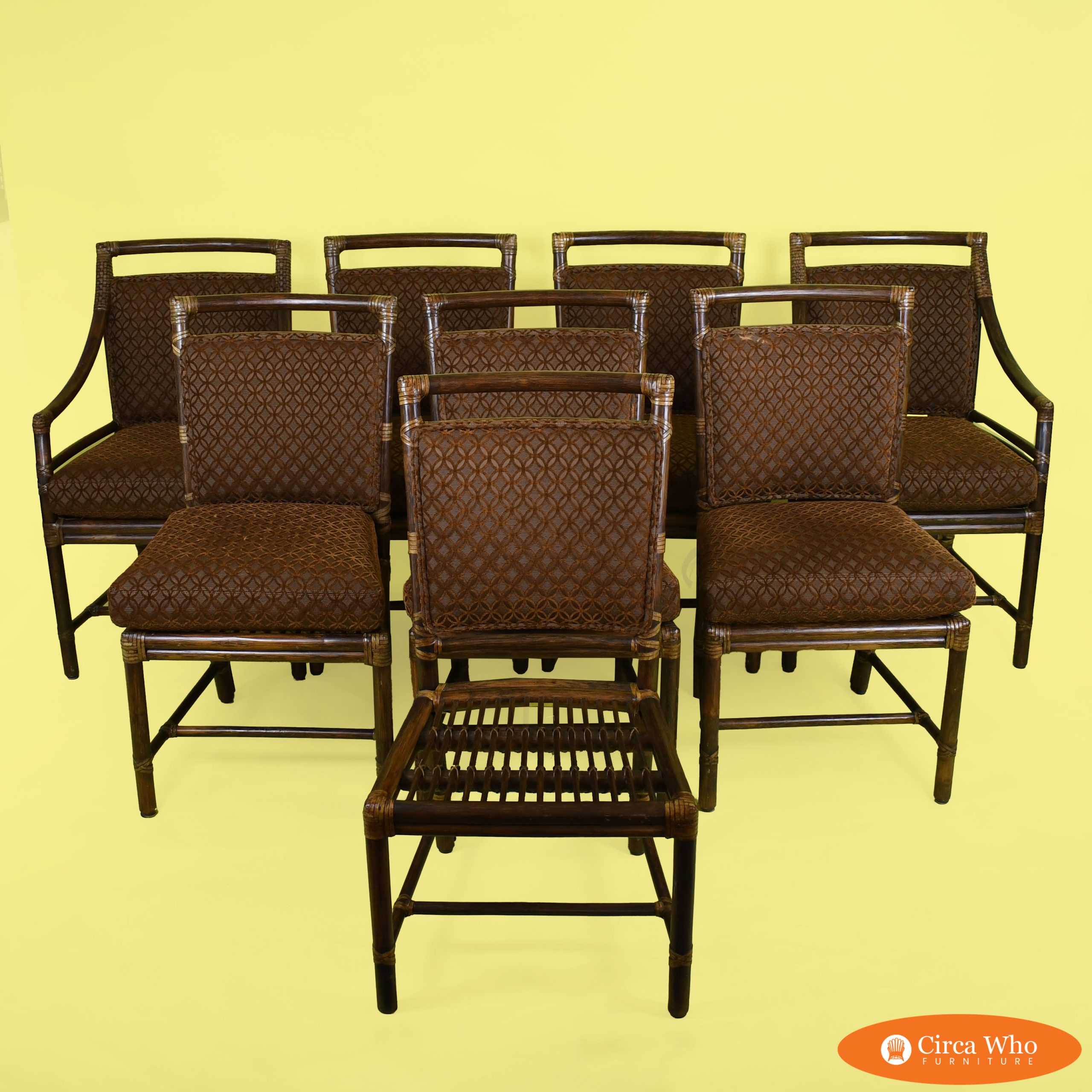 Set of 8 Target Back McGuire Dining Chairs in nice as found VINTAGE condition. There are minor scuffs, scrapes and wear to the as found finish. As found Upholstery . 2 Arms , 6 Side Chairs .(see photos)