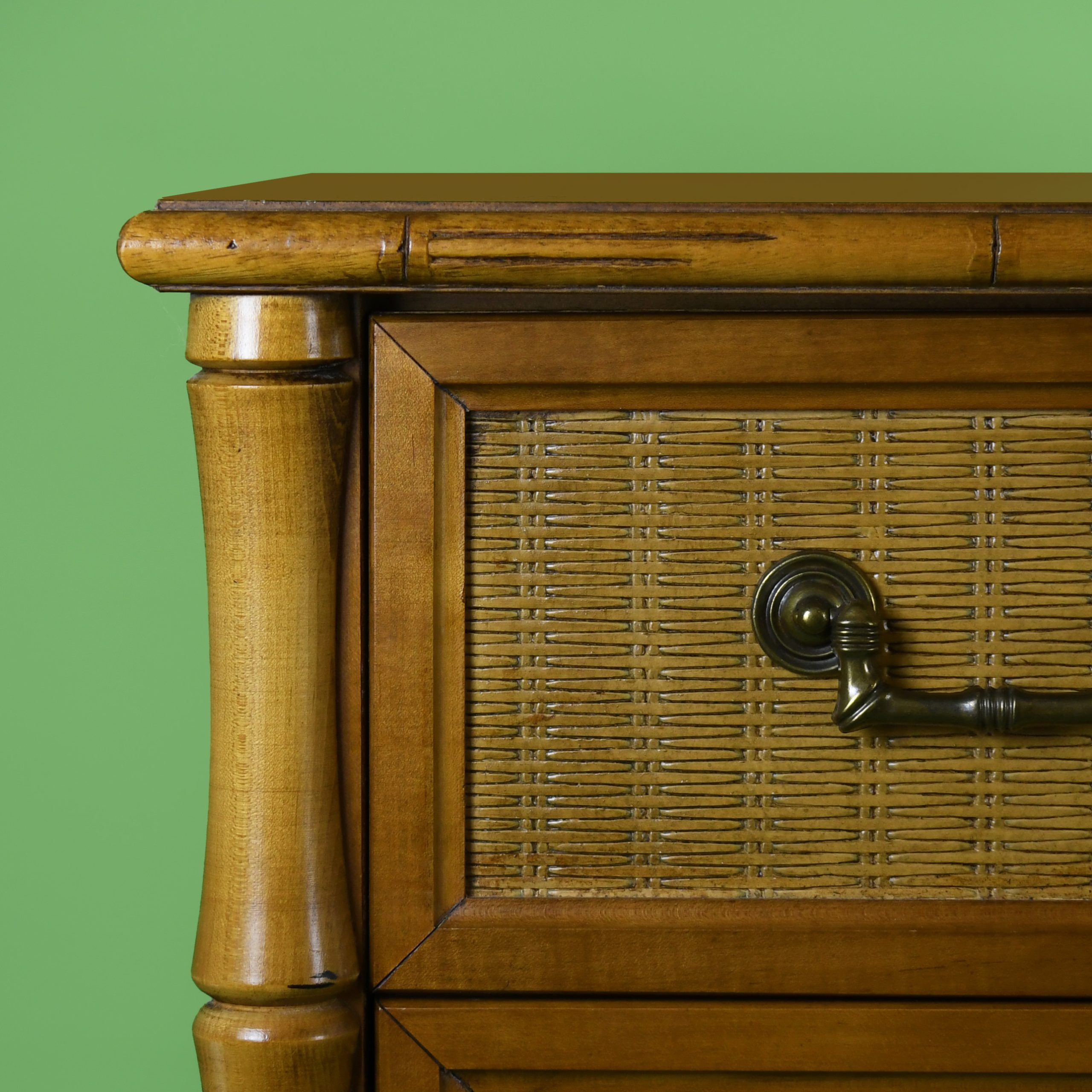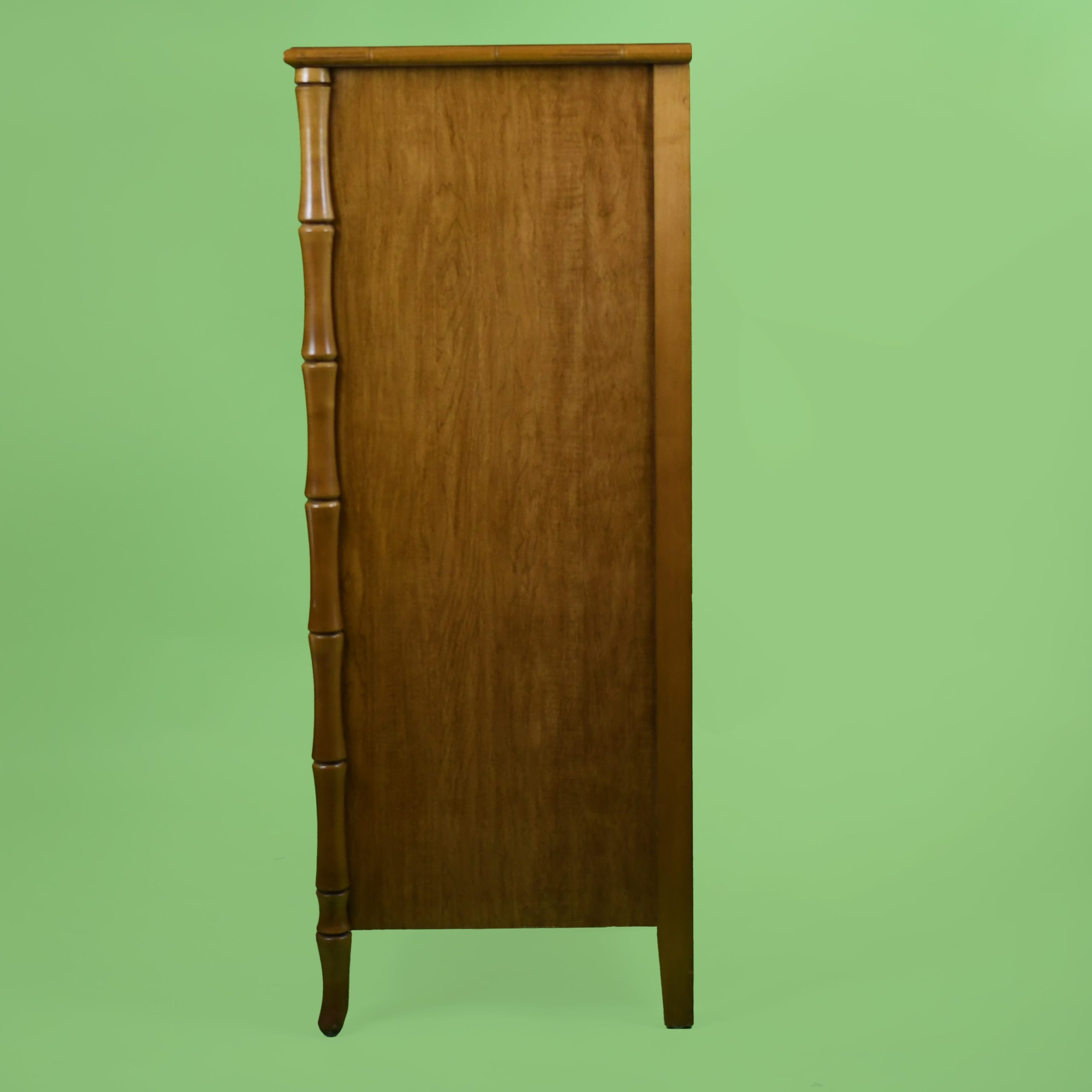 Tall Faux Bamboo Chest by Broyhill in nice as found vintage condition. There are scuffs, scrapes and wear to the original natural finish. (see photos)