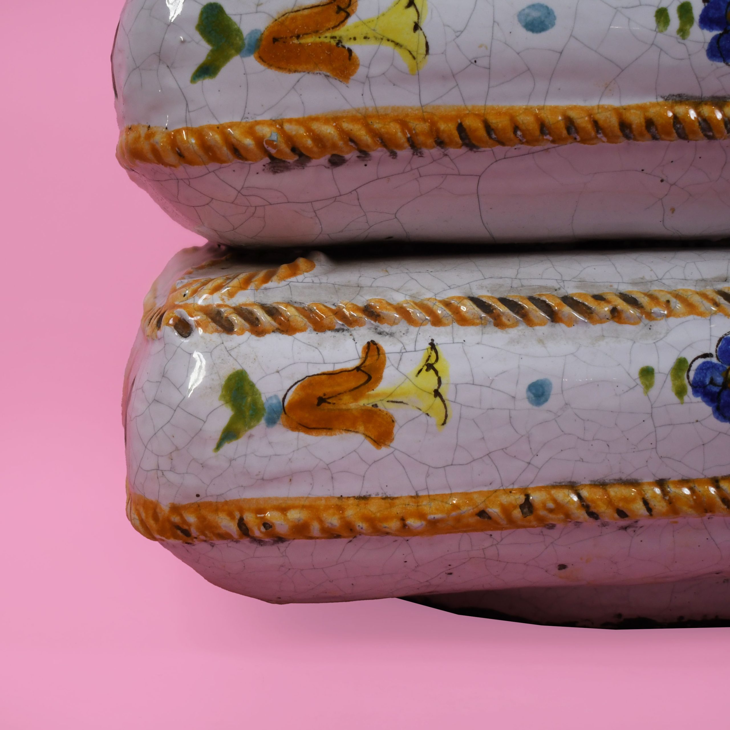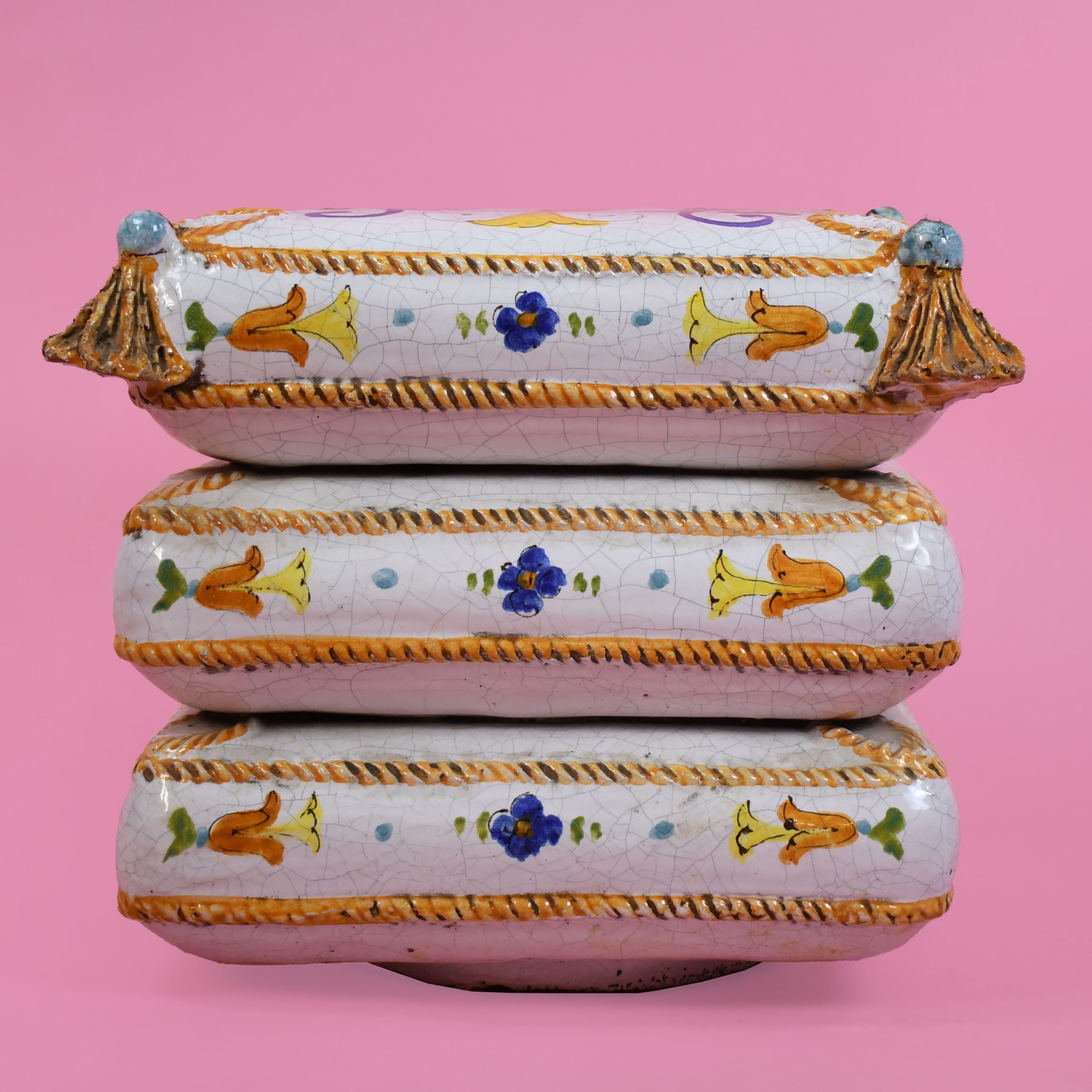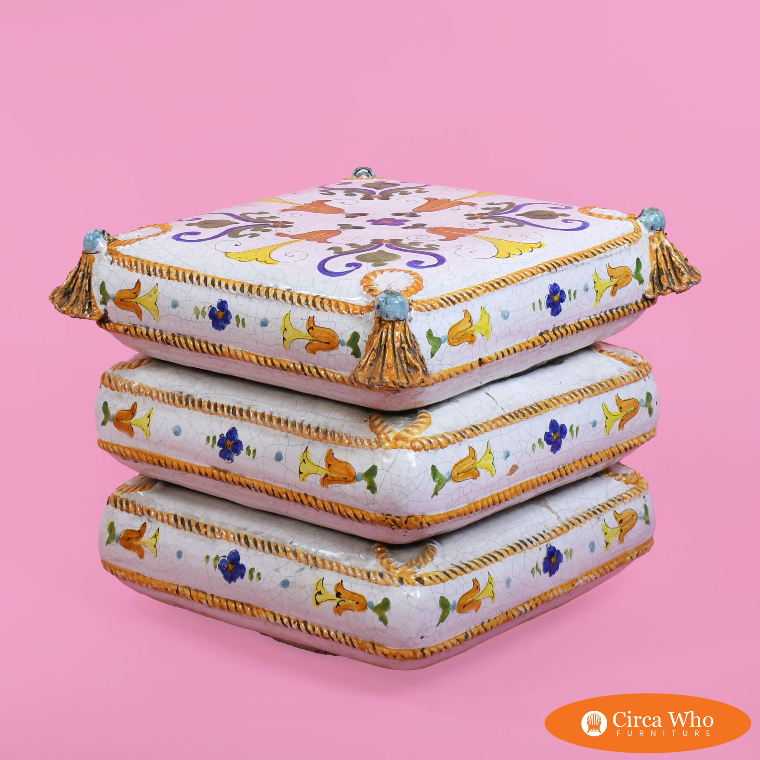 Vintage 3 Cushions Majolica Garden Seat in nice as found VINTAGE condition. There are minor scuffs, scrapes and wear to the glazed finish. (see photos)