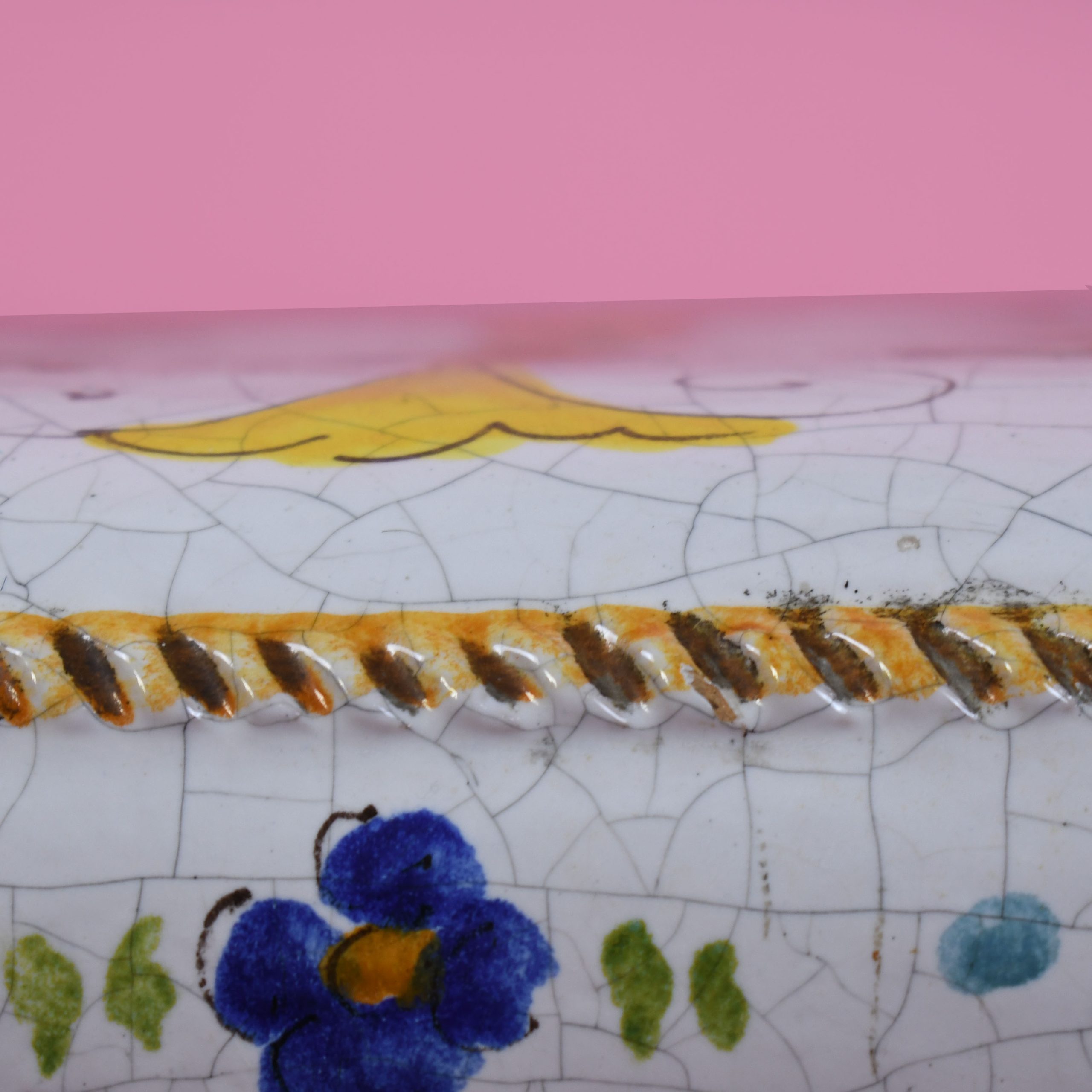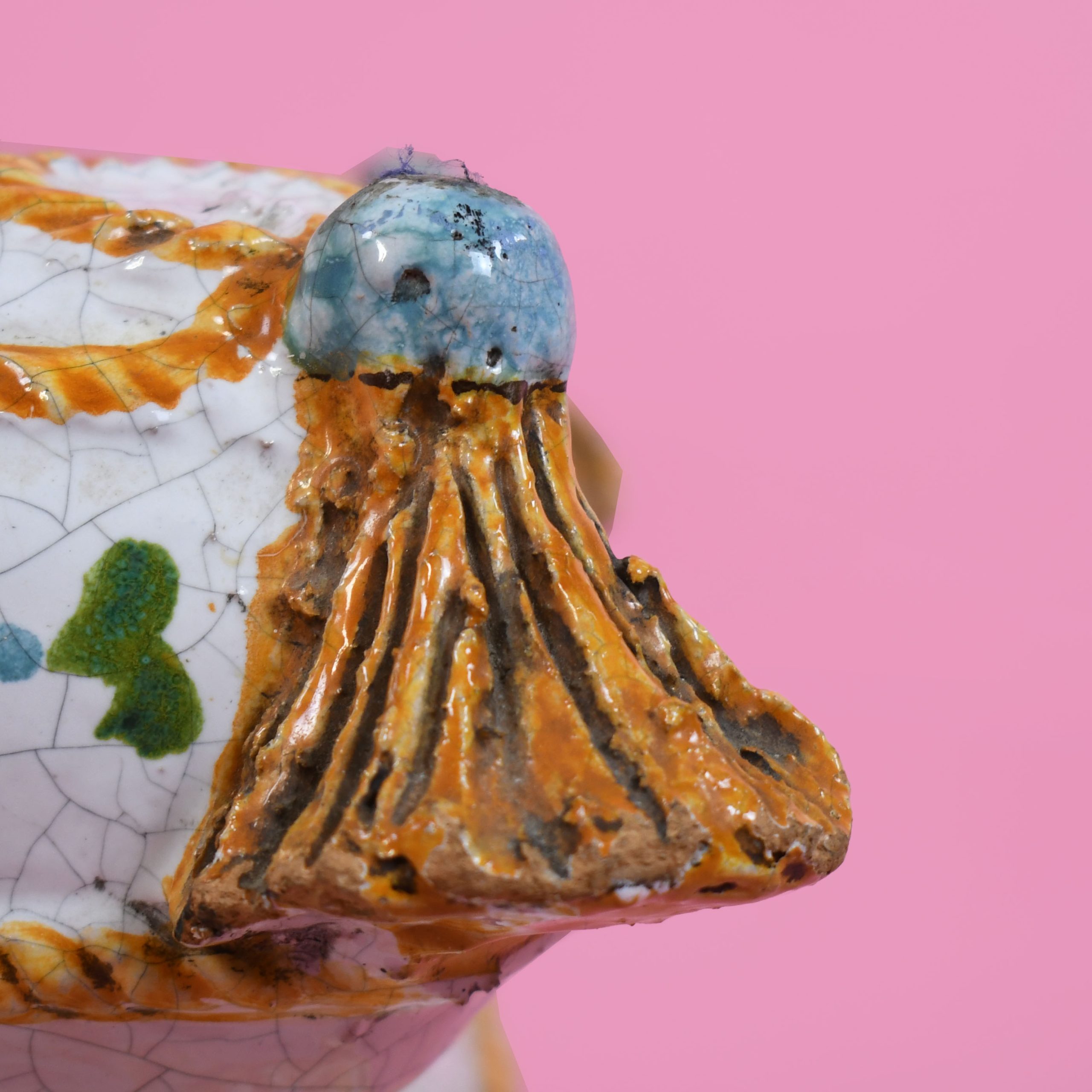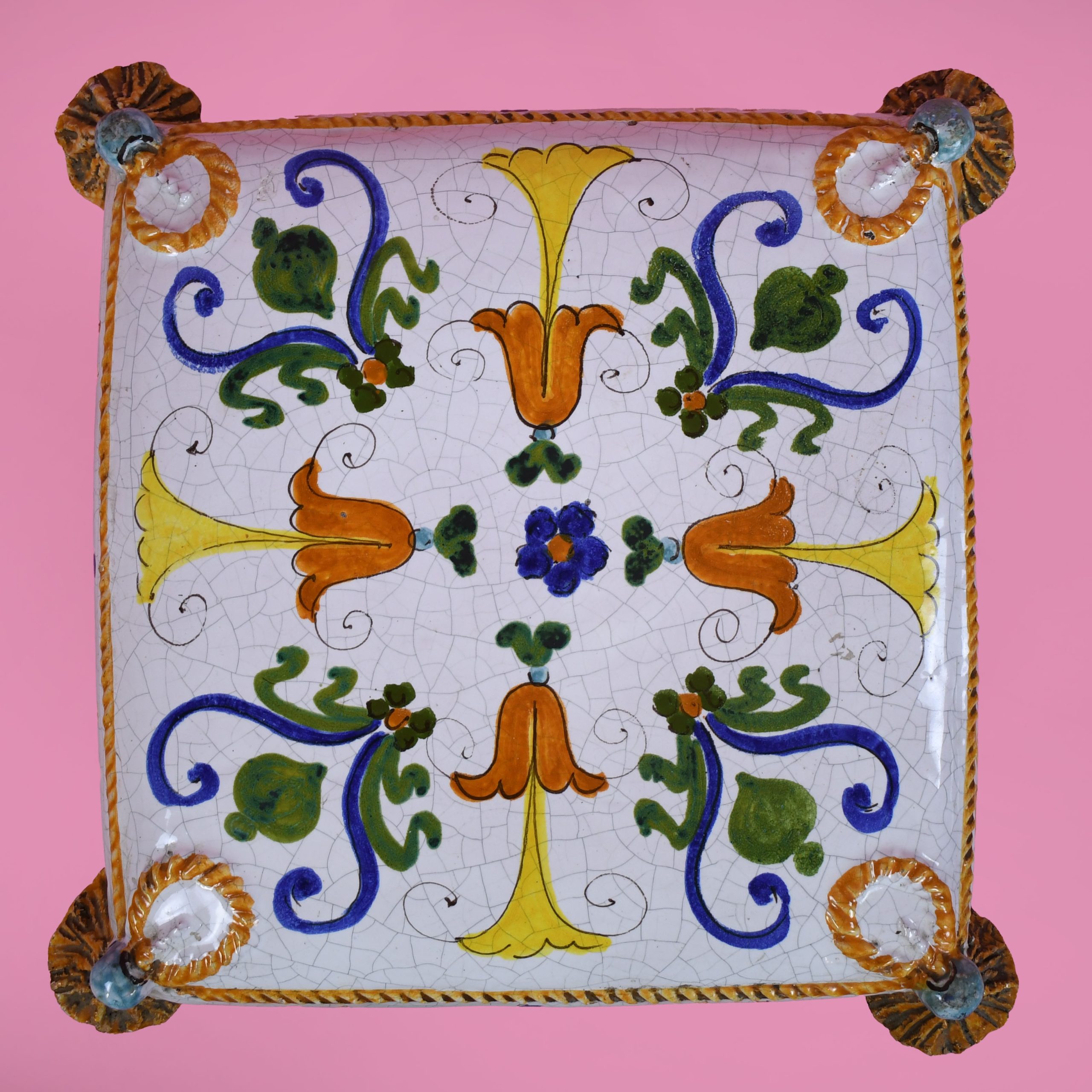 Vintage 3 Cushions Majolica Garden Seat in nice as found VINTAGE condition. There are minor scuffs, scrapes and wear to the glazed finish. (see photos)
