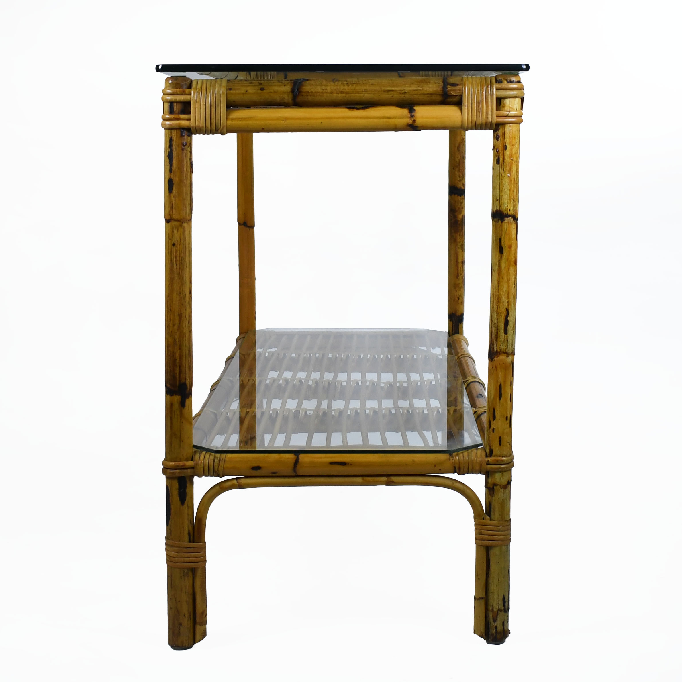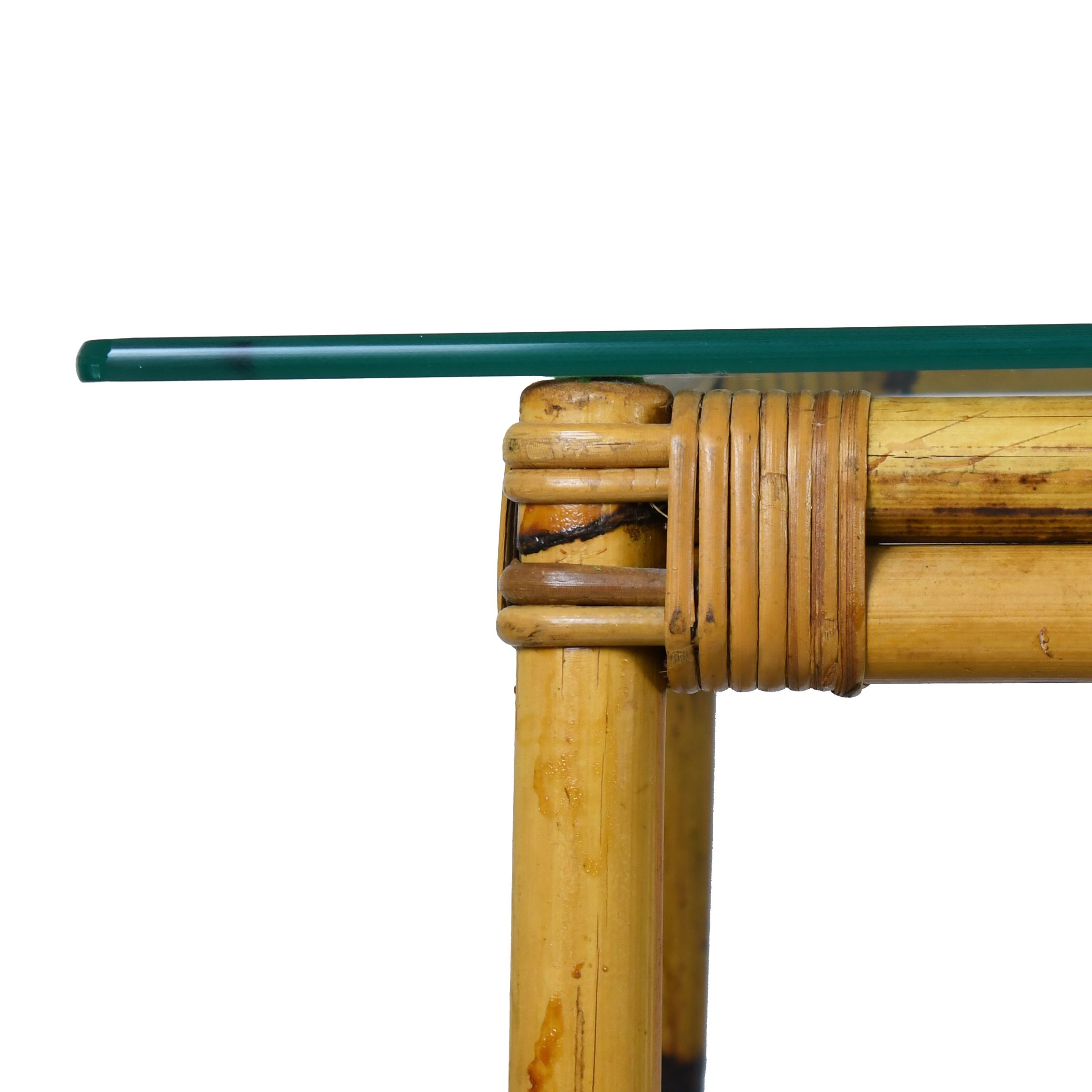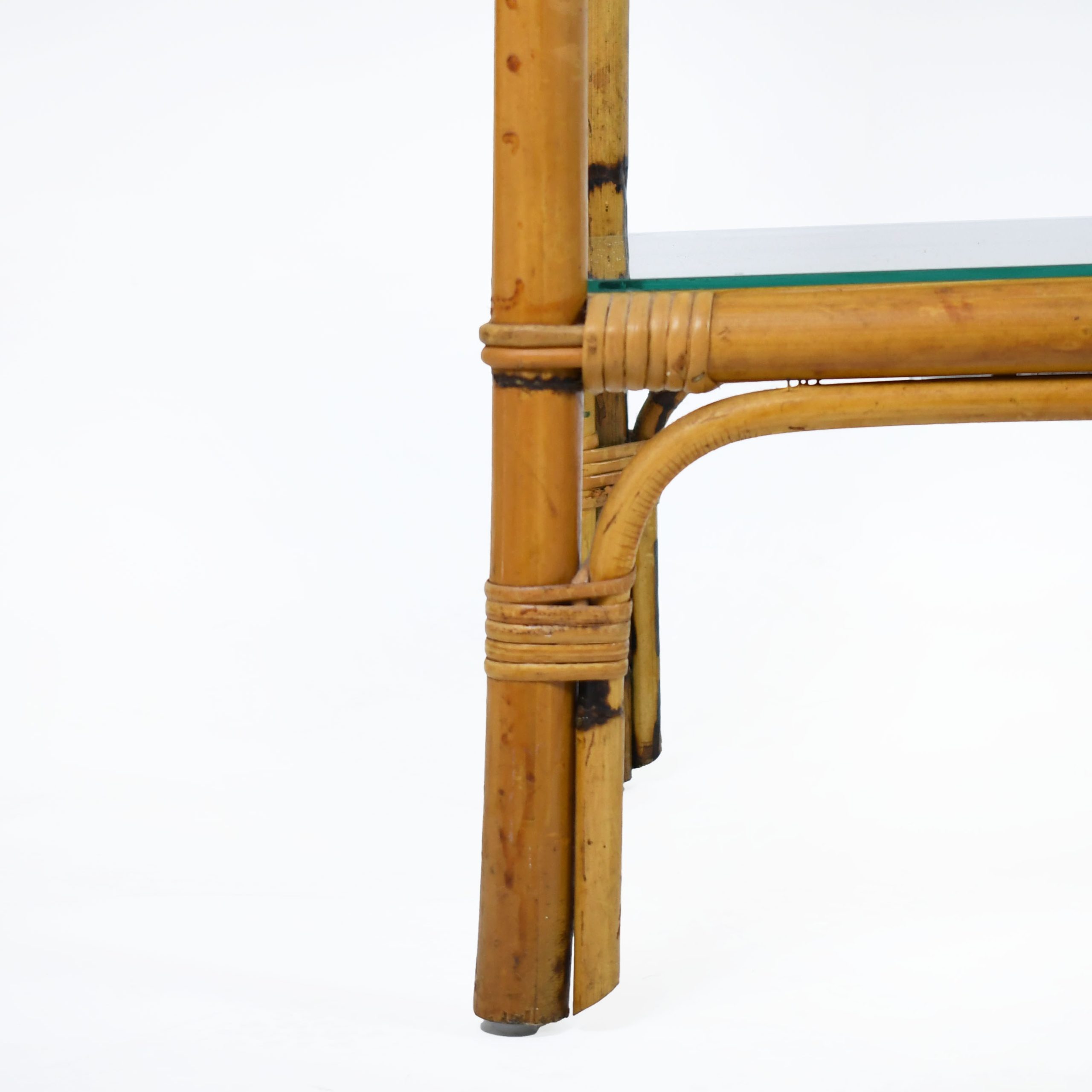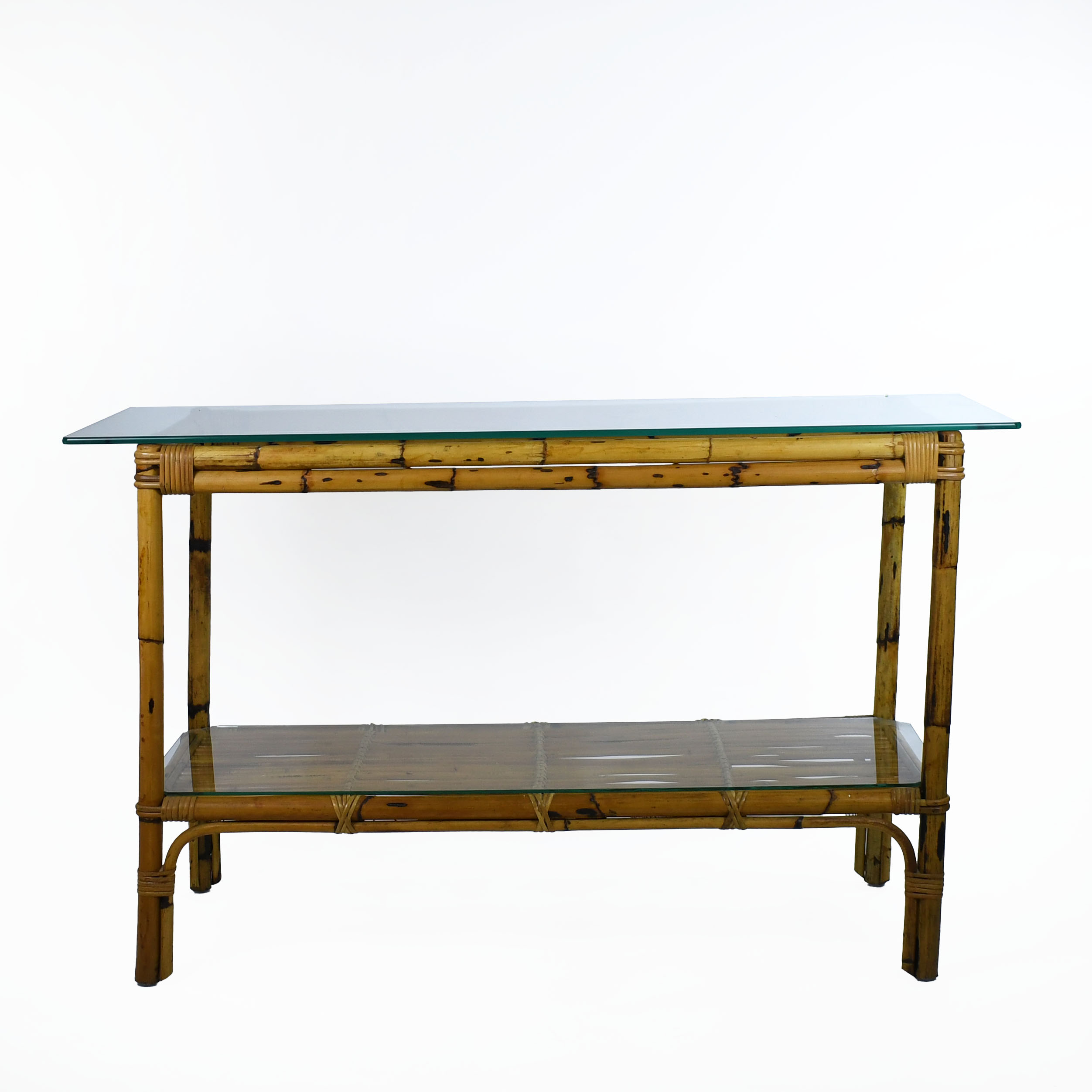 Vintage Bamboo Double Tier Console Table in nice as found condition. There are minor scuffs, scrapes and wear to the as found Natural finish. Glass top has wear from use. (see photos)
