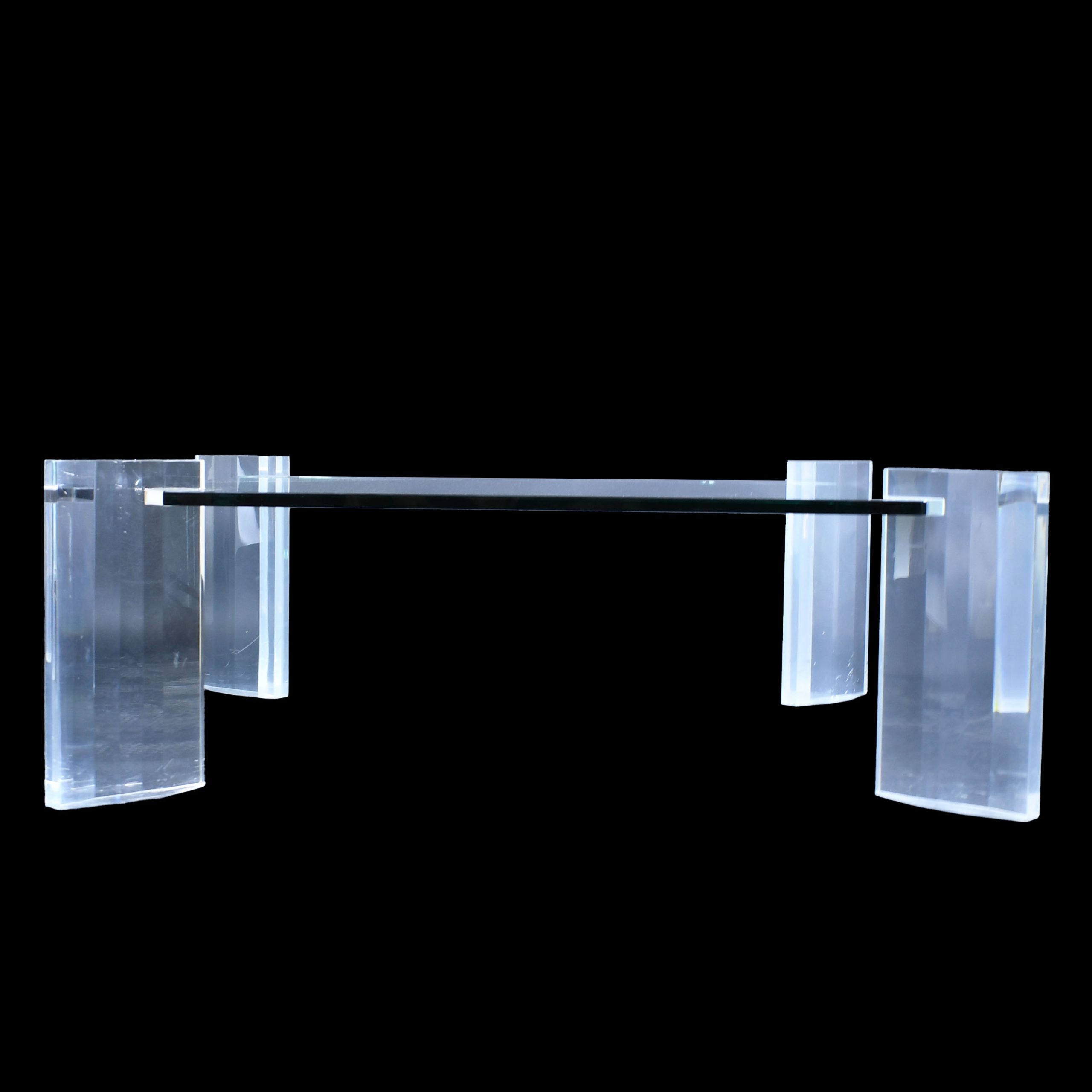 Vintage Karl Springer Lucite Coffee Table in nice as found vintage condition. There are minor scuffs, scrapes and wear to the as found finish.Wear to glass top from use.(see photos)