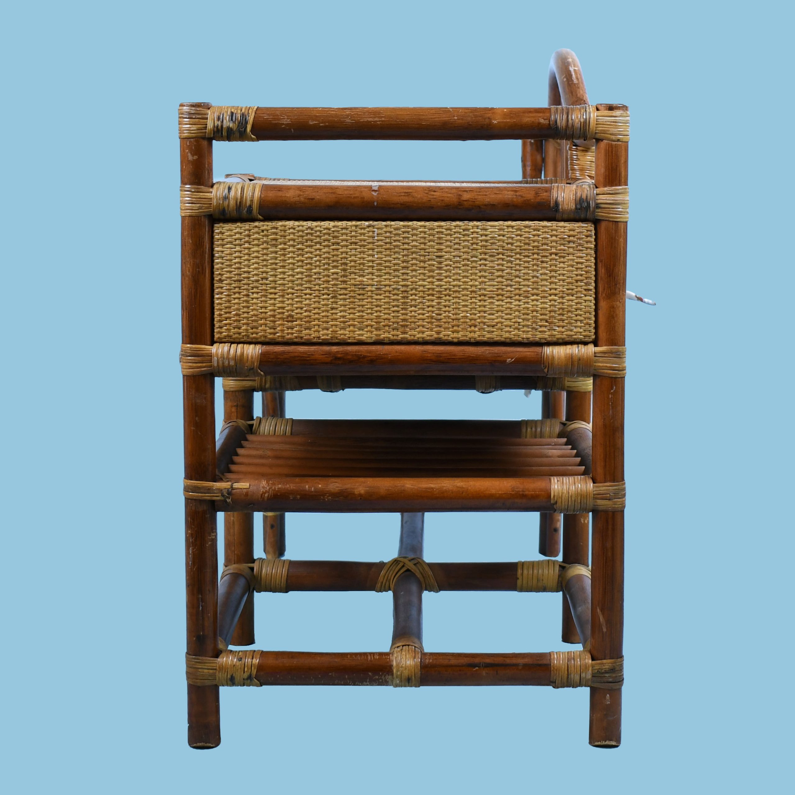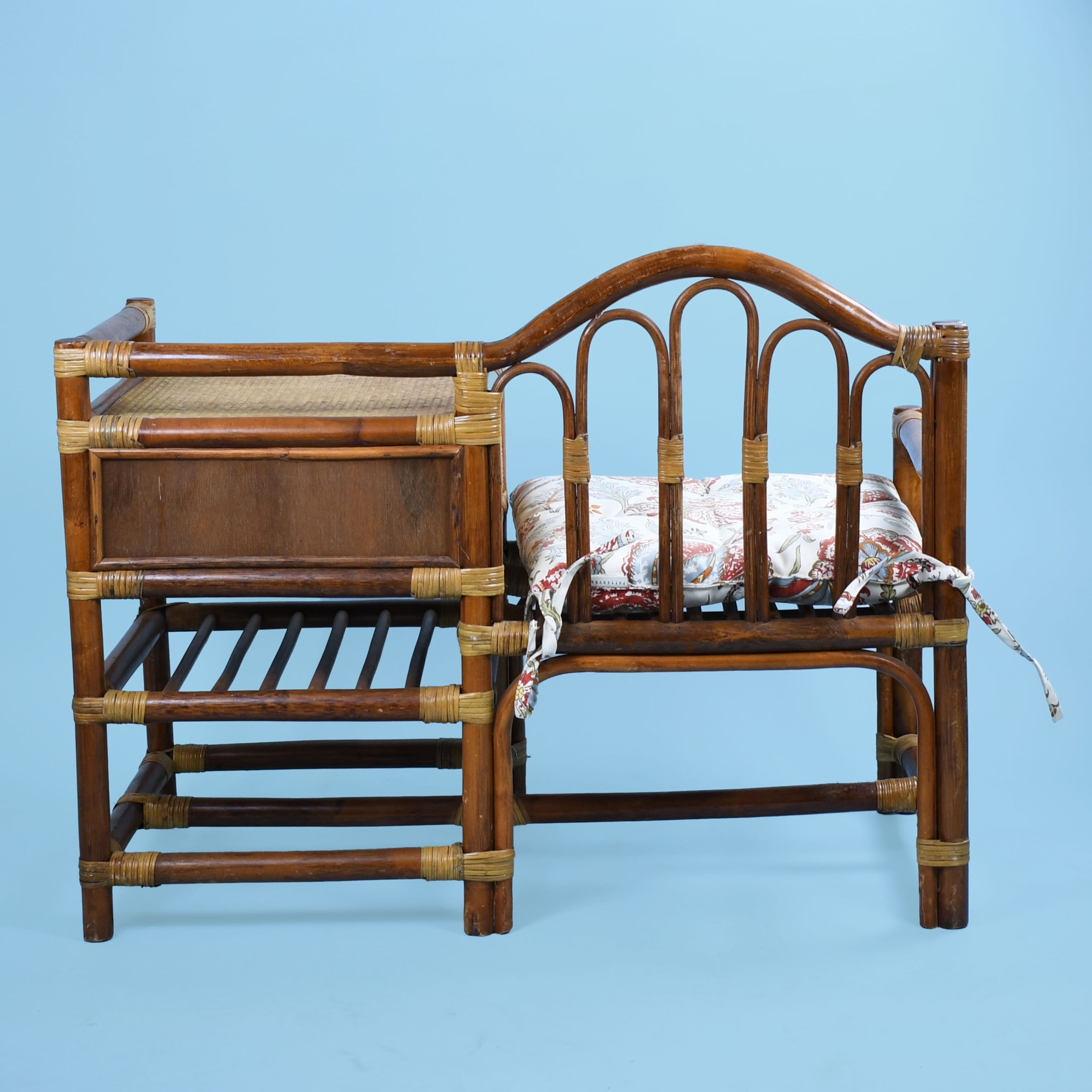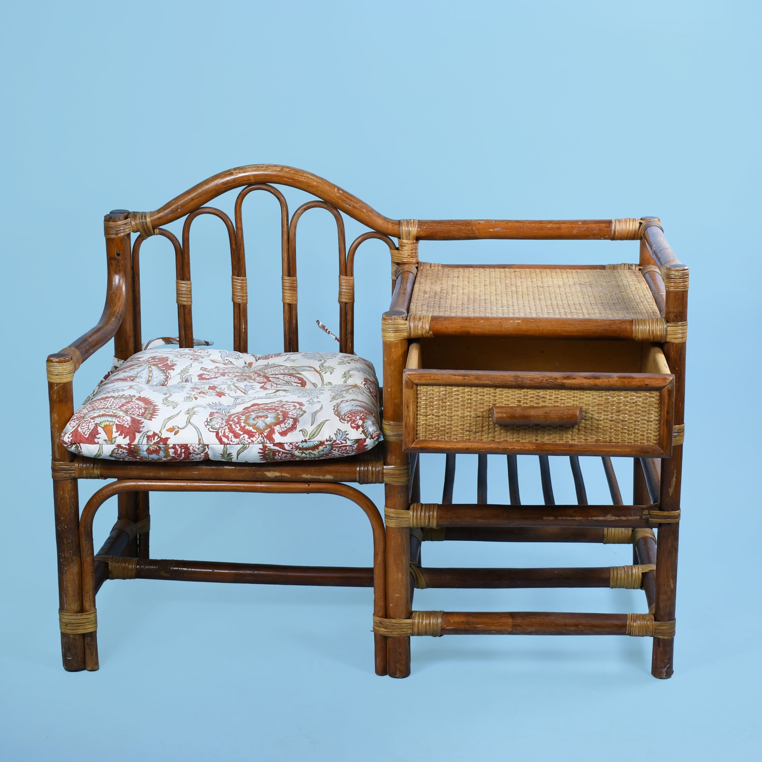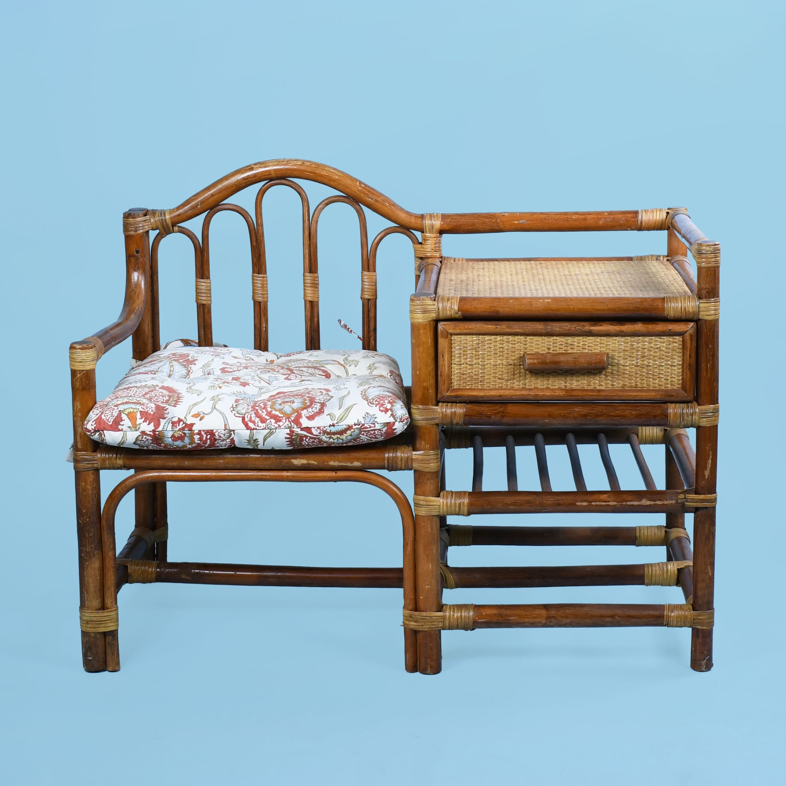 Vintage Rattan Telephone Bench in nice as found vintage condition. There are minor scuffs, scrapes and wear to the original finish. As found upholstery. (see photos)