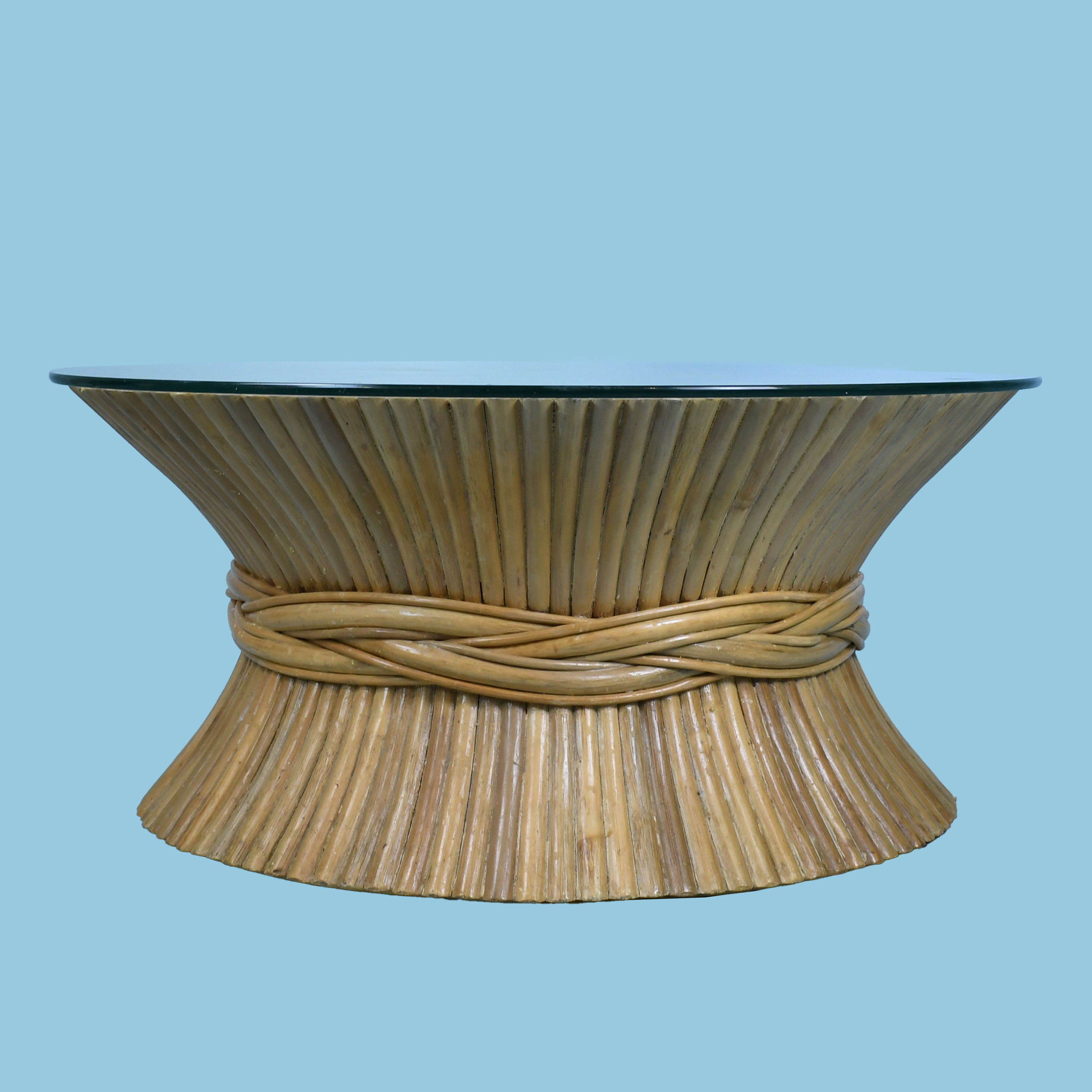Wheat Sheaf Round Coffee Table in nice as found condition. There are minor scuffs, scrapes and wear to the as found finish. Glass top has wear from use. (see photos)