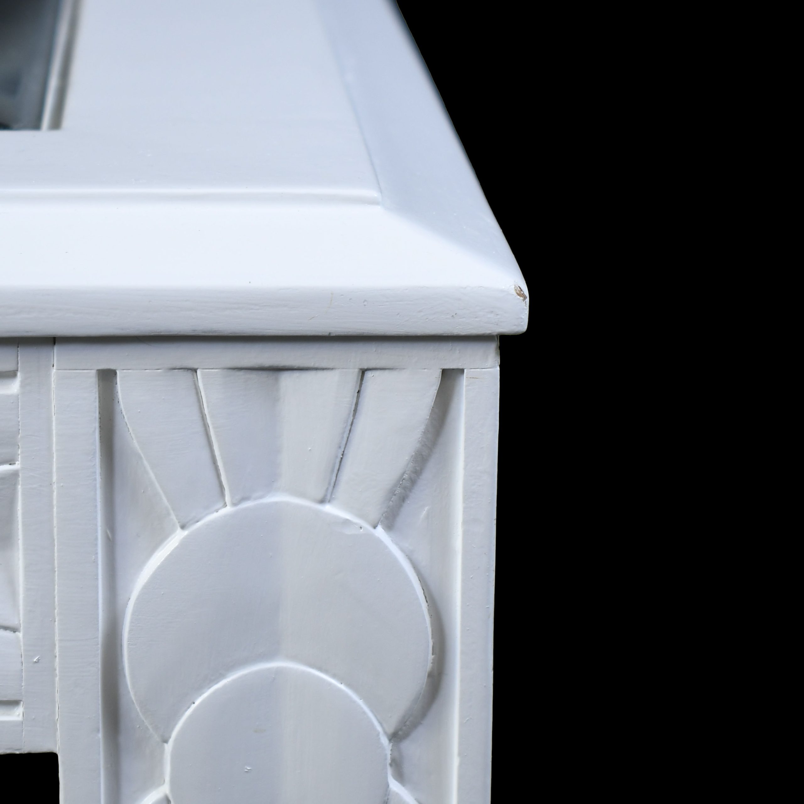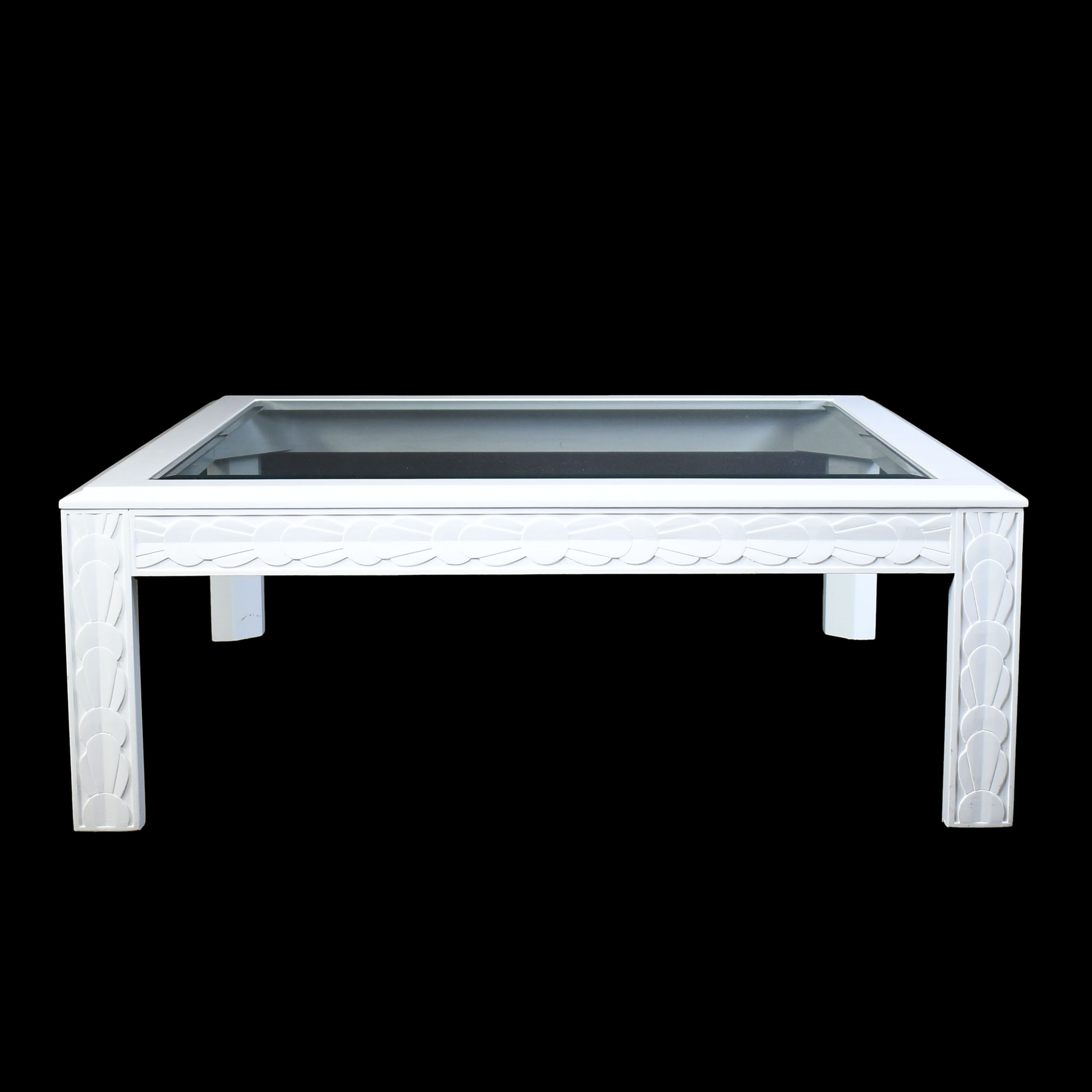 White Coastal Carved Coffee Table in nice as found condition. There are minor scuffs, scrapes and wear to the as found finish. Glass top has wear from use. (see photos)