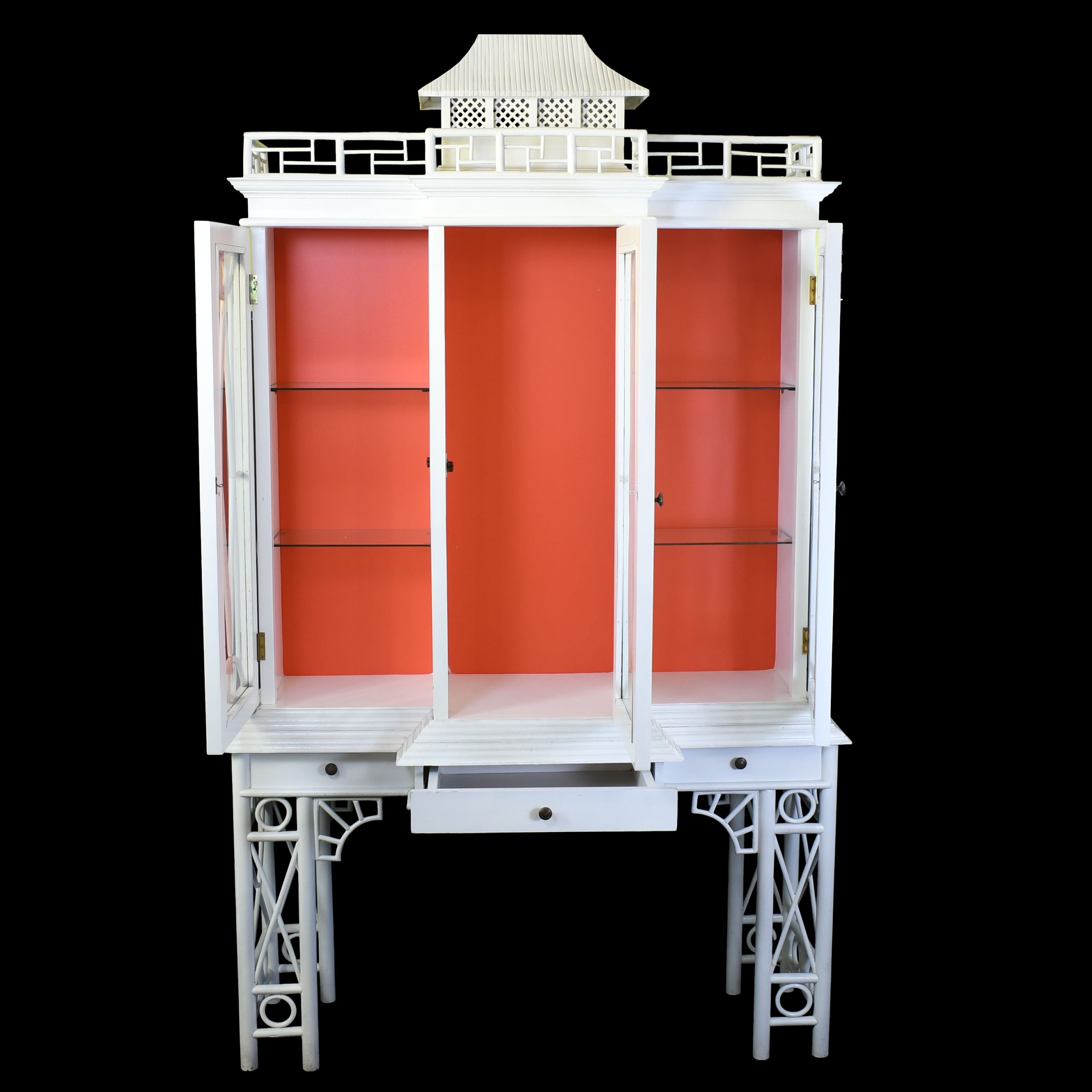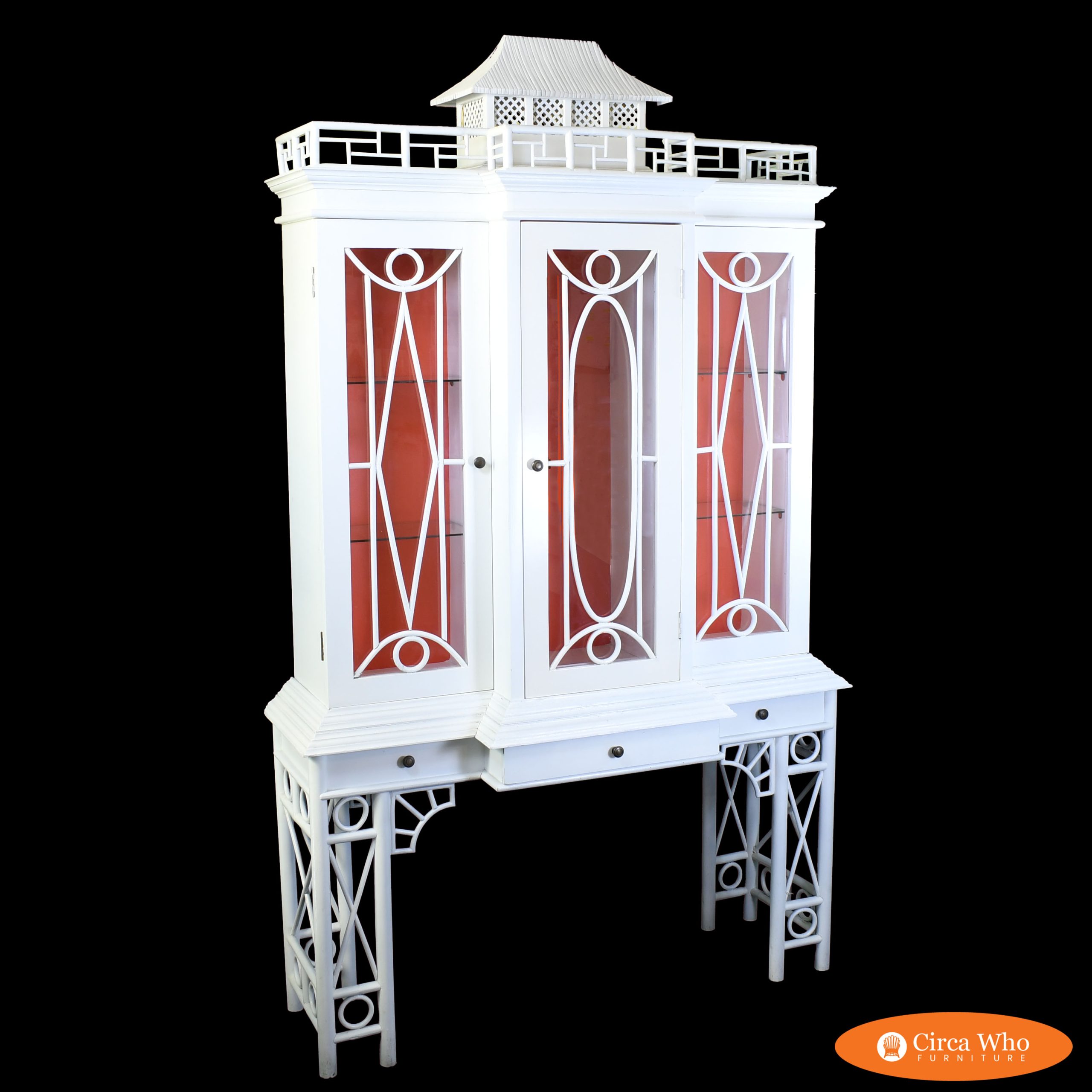 White Rattan Pagoda Hutch in nice as found condition. There are minor scuffs, scrapes and wear to the as found finish. Glass top has wear from use. (see photos)