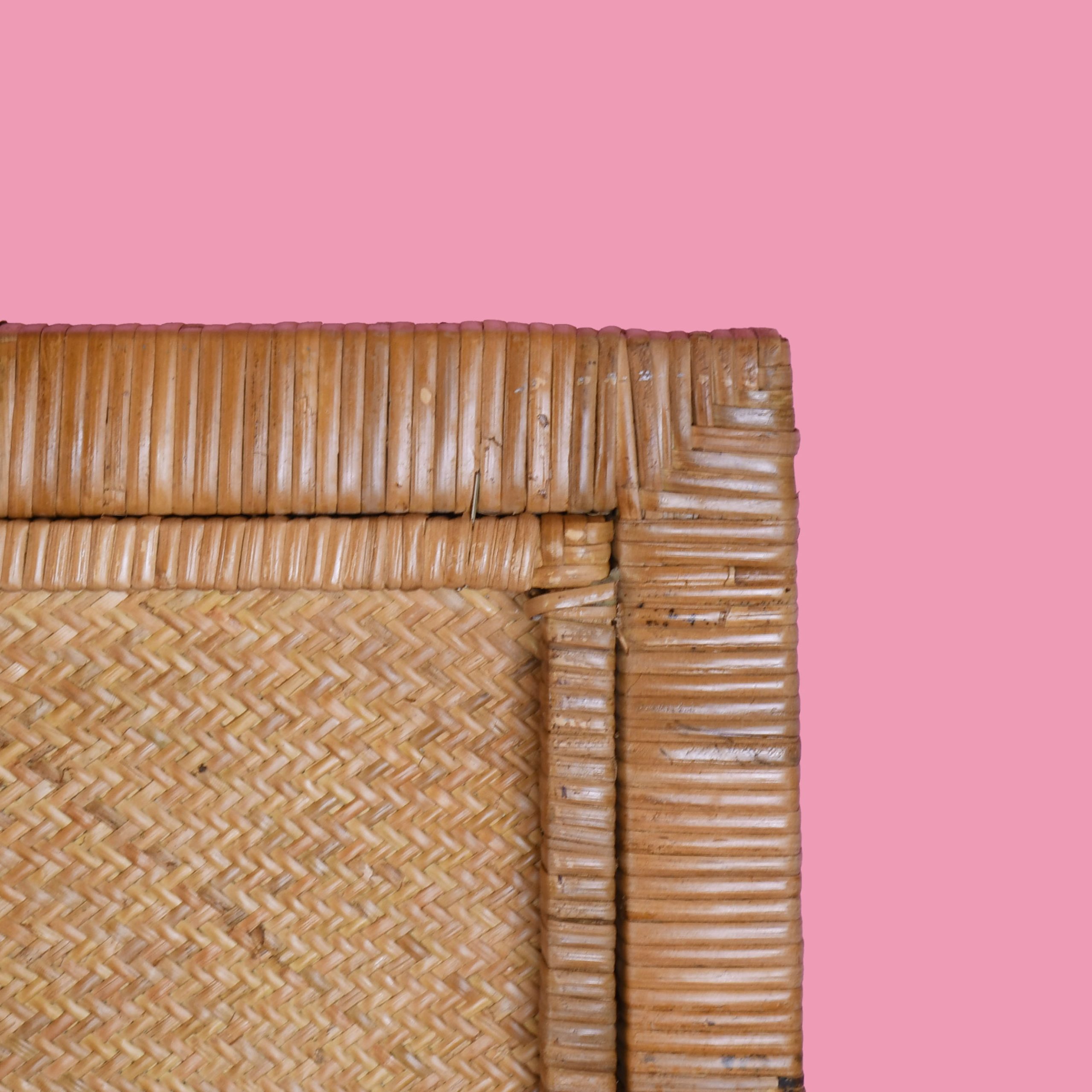 Wrapped Rattan and Woven Rattan Queen Headboard in nice as found vintage condition. There are minor scuffs, scrapes and wear to the as found finish. (see photos)